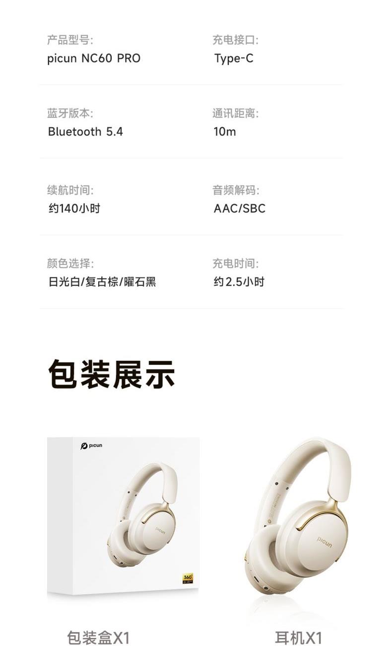 颜色:复古棕、日光白、曜石黑 连接模式:插音频线、蓝牙 蓝牙方案:AC7018 降噪深度:-35dB 蓝牙版本:V5.4 接受距离:10m 频响范围:20HZ-20KHZ 使用时间(70%音量): 100小时, 开启降噪80小时 电池容量:1000mAh 充电时间:3H 喇叭尺寸:40mm 喇叭灵敏度:121±3dB 充电接口:type-c 1、支持【picun品存】APP智能互联控制 2、4麦阵列先进混馈降噪技术, 降噪深度达38DB 3、千元HIFI无损音质 大师级调教+自定义音效+空间音频 4、1000毫安大容量电池,zui大可支持100小时续航 5、Pro版本支持头部追踪