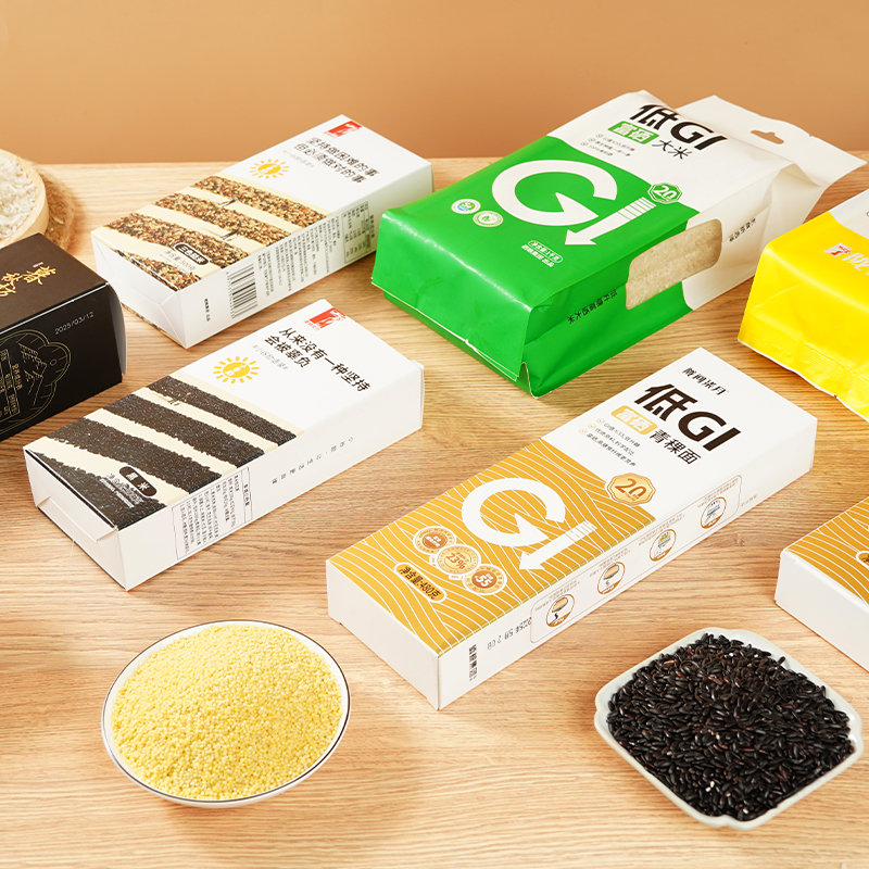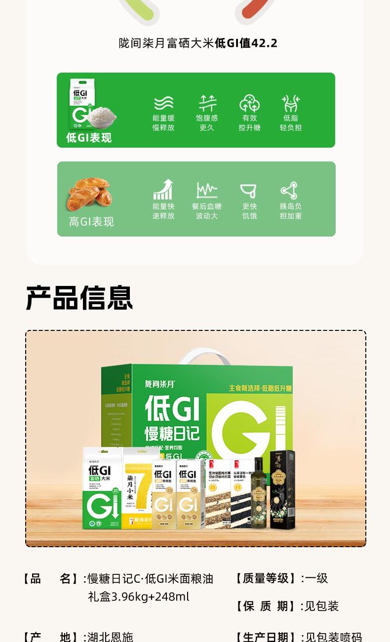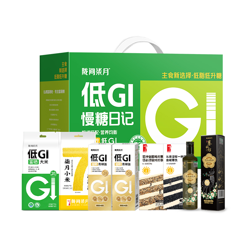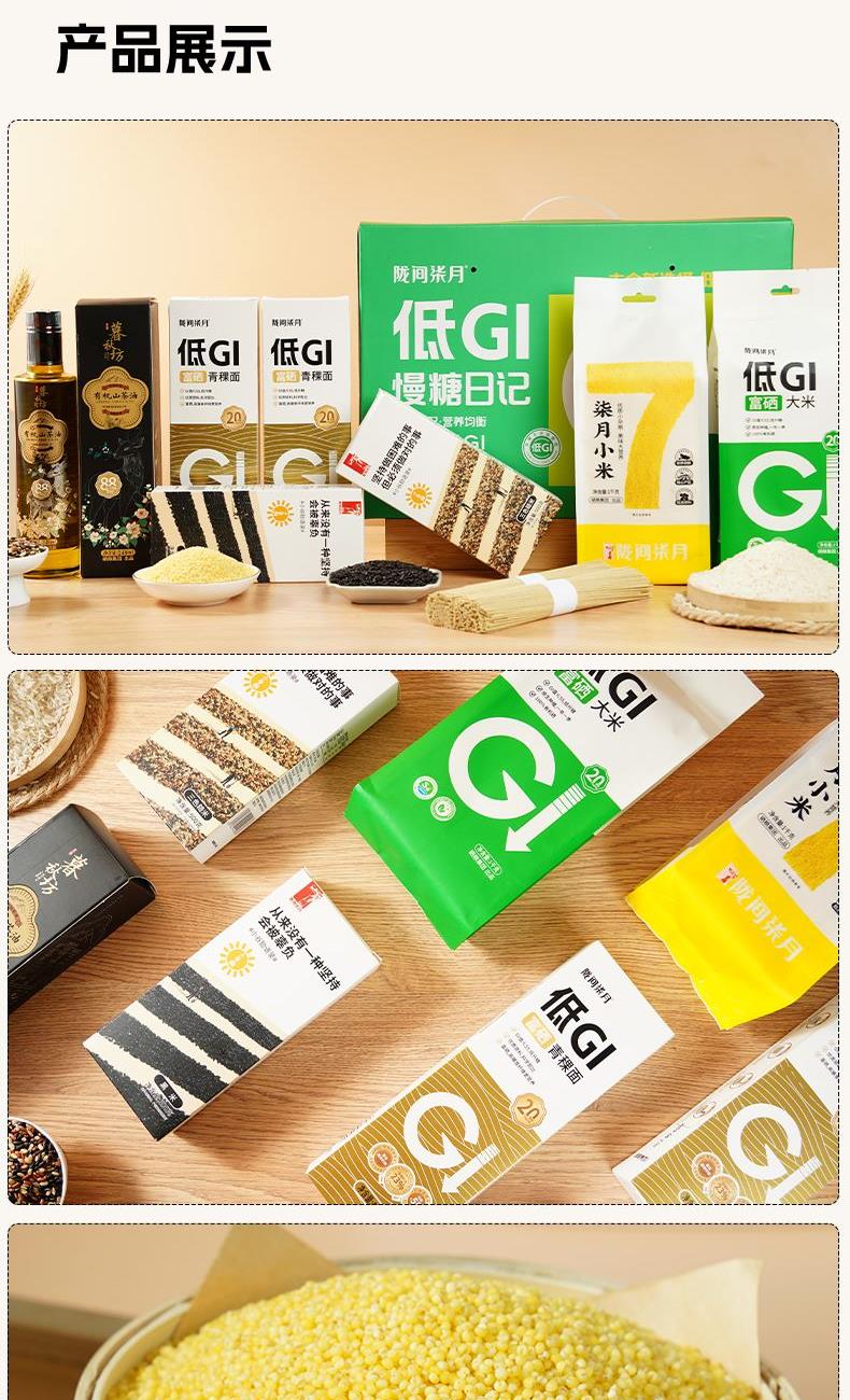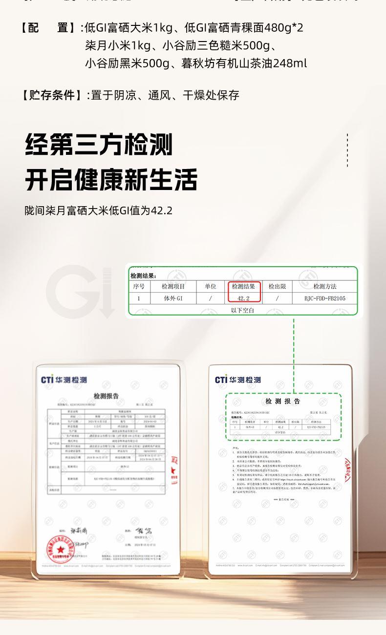 低GI富硒大米1kg、低GI富硒青稞面480g*2、柒月小米1kg、小谷励三色糙米500g、小谷励黑米500g、暮秋坊有机山茶油248ml 尺 寸:390×130×270mm 1、GI值≤55,低升糖,高饱腹,更抗饿; 2、大米原生种植、一年一季; 3、富有机硒认证,每100g平均硒含量≥20ug; 4、粗细搭配,营养均衡,主食新选择,低脂低升糖。
