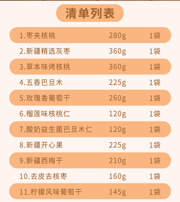 送礼有面 新疆特产 产地直发 枣夹核桃280g*1 精选新疆灰枣360g*1 草本味烤核桃360g*1 五香巴旦木225g*1 玫瑰香葡萄干260g*1 榴莲核桃仁120g*1 酸奶益生菌巴旦木仁120g*1 开心果225g*1 新疆西梅干210g*1 去皮去核枣160g*1 柠檬风味葡萄干145g*1 新疆印象·坚果盛宴大号礼盒*1