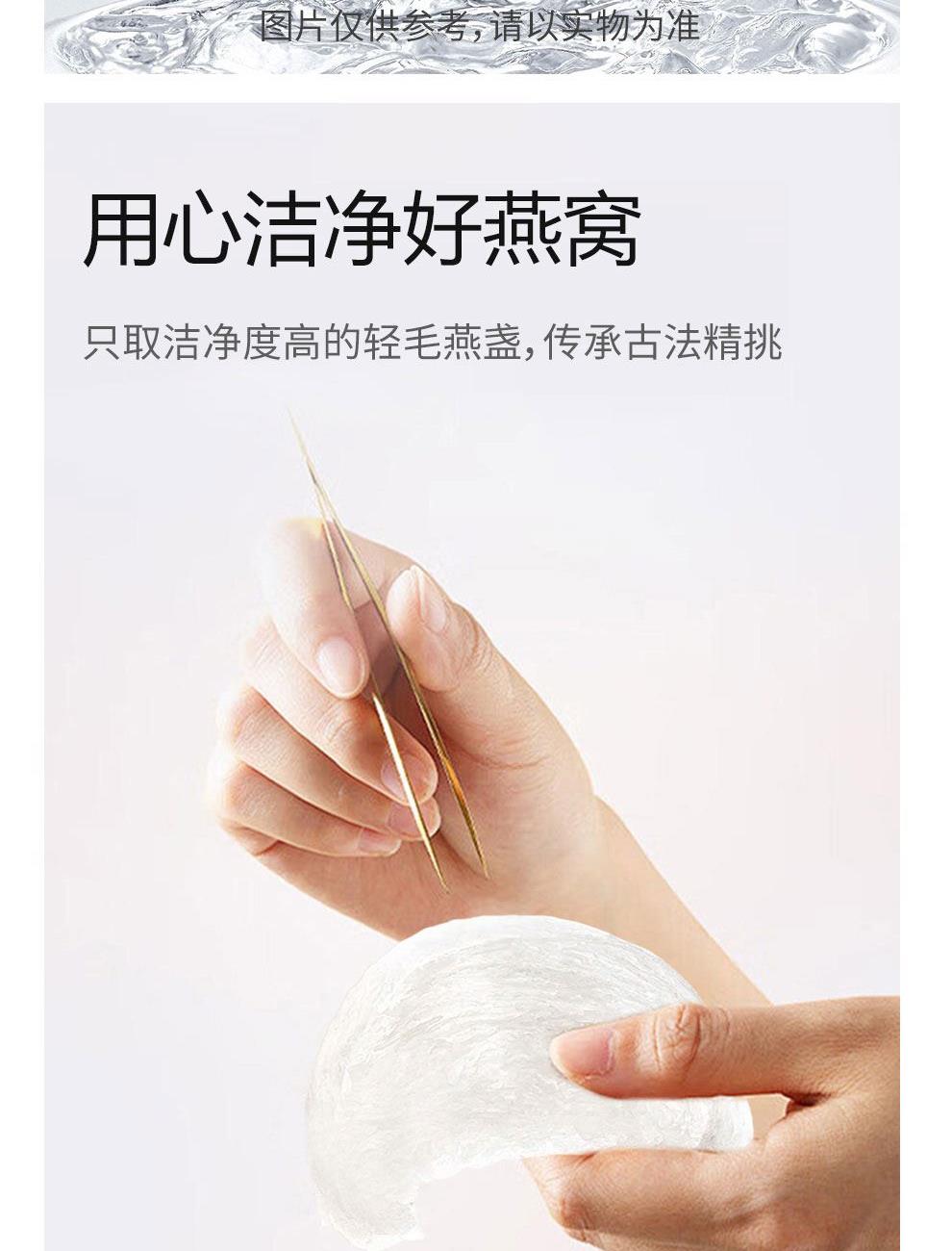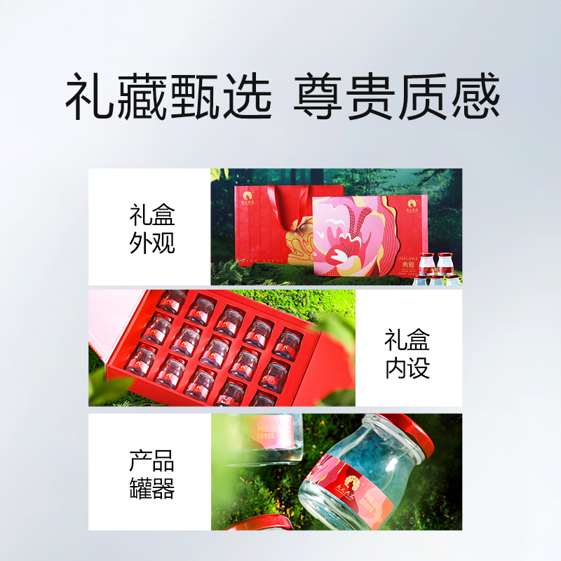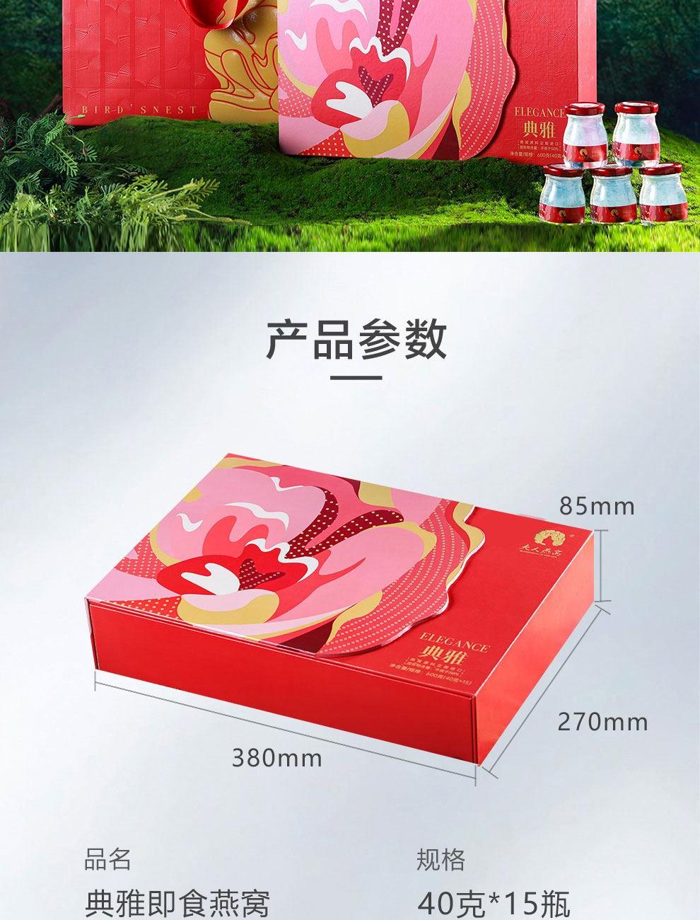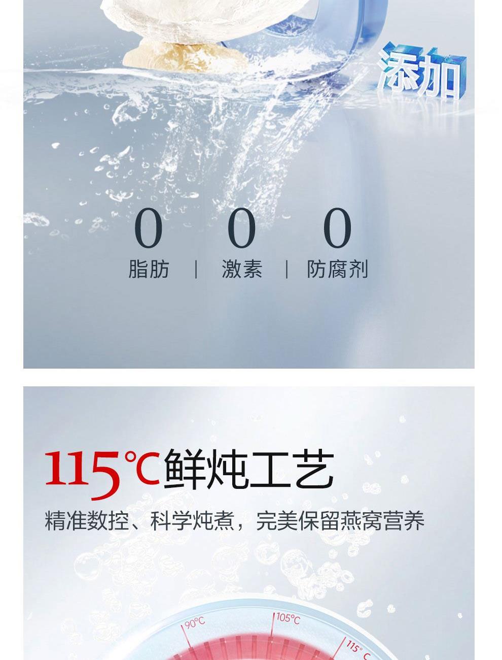 规格:600克(40克*15瓶)、燕窝固形物不低于50% 卖点: 燕窝原料精选马来西亚、印尼森林雨季燕盏,洁净度更高,泡发率更好。121℃,1140秒数控,科学炖煮,保留燕窝营养,口感细腻爽滑。坚持 0添加 0色素 0防腐剂,孕妈和宝宝也可以放心享用。一瓶一码可溯源,开盖即食,开启滋补。
