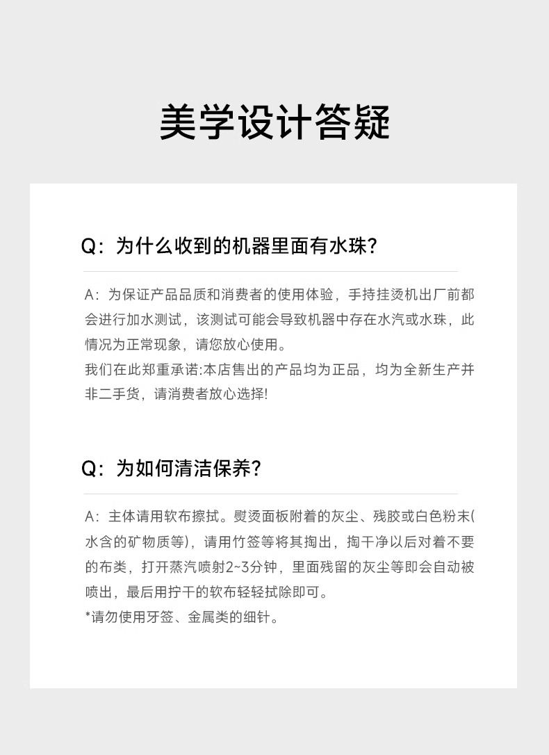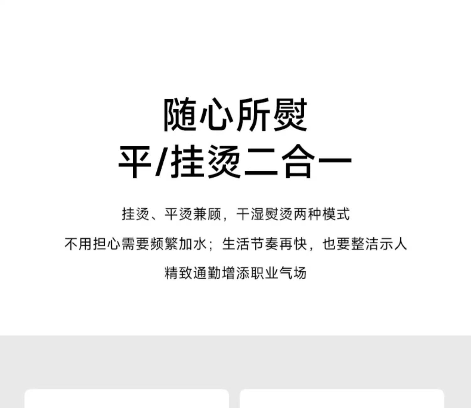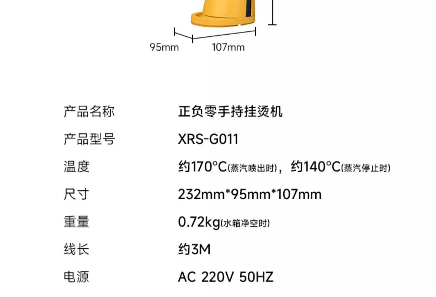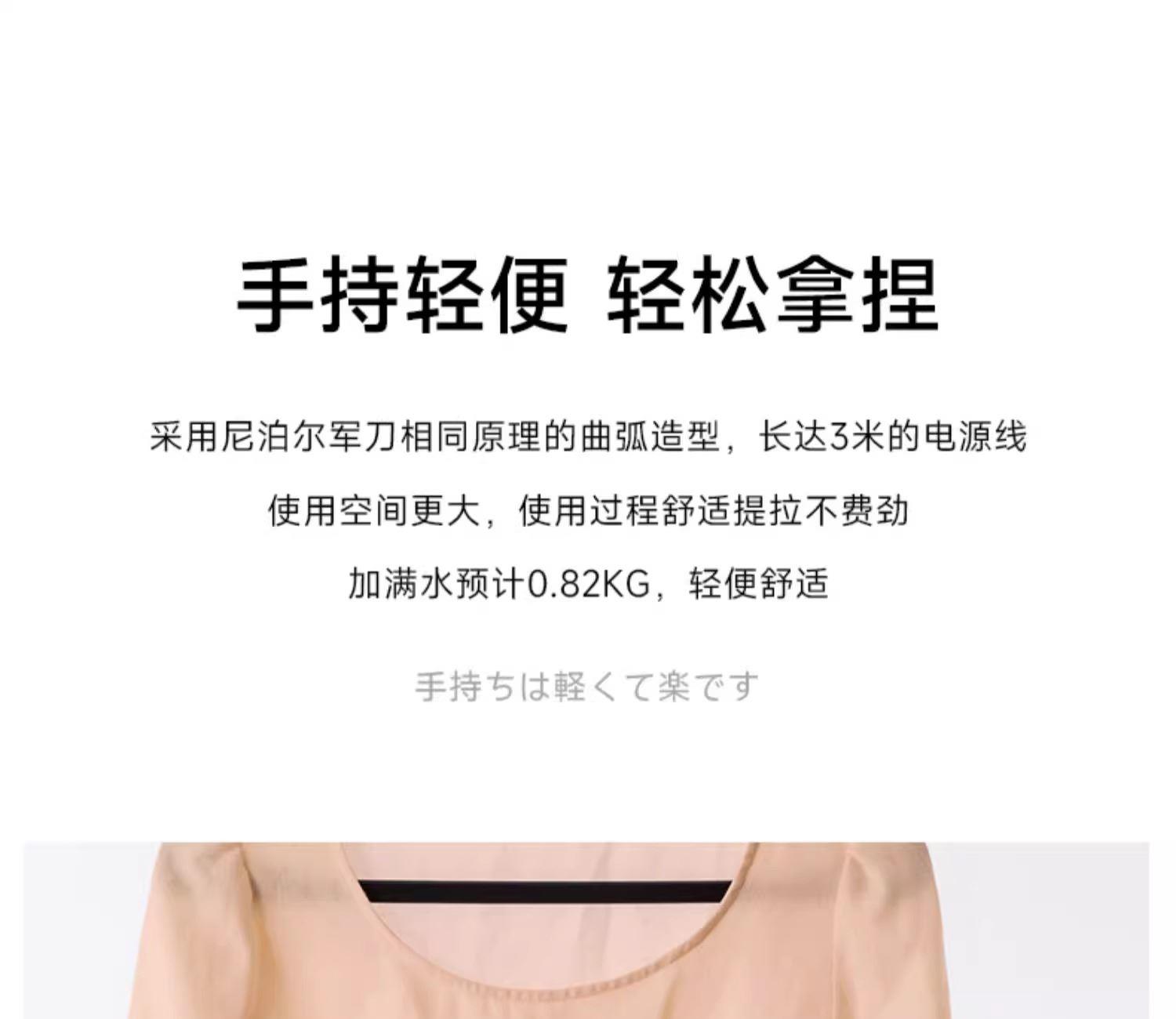 产品重量(总重量)约0.72kg 电压输入: AC220V 50Hz 额定功率: 800W 【蒸汽切换】:干烫、蒸汽 容量:约100ml 续航时间:蒸汽可连续使用时间为8分钟 温度:约140℃(湿烫),约170℃(干烫) 挂烫、平烫两用挂烫机 加热快速,24秒即可喷出大量蒸气 无需连续按压,简单好操作 拆卸式水箱轻松迅速补水 有效减少尘螨与花粉 轻松去除烟味、汗味、潮湿等异味 仅700g轻巧好收纳 20分钟无使用自动断电安全机制 附毛刷、量杯贴心配件
