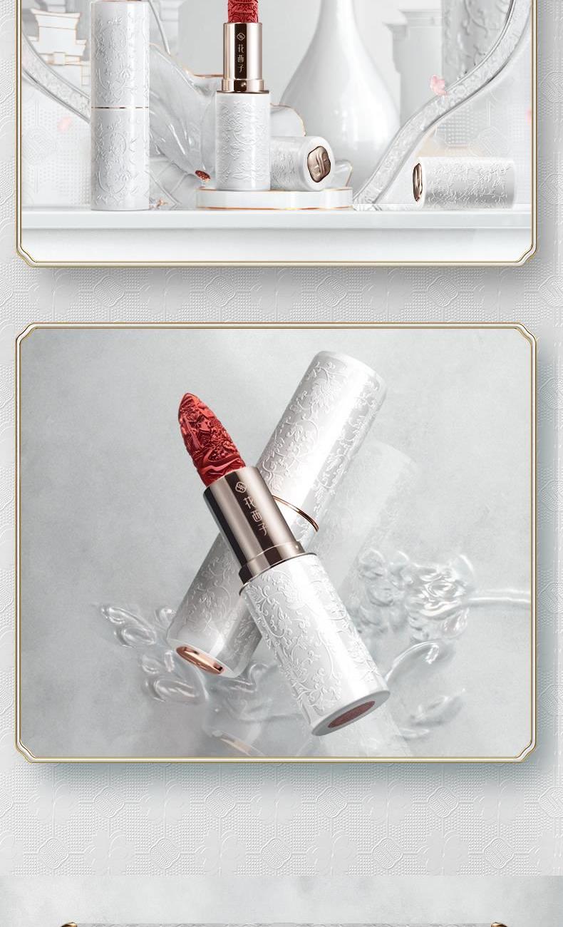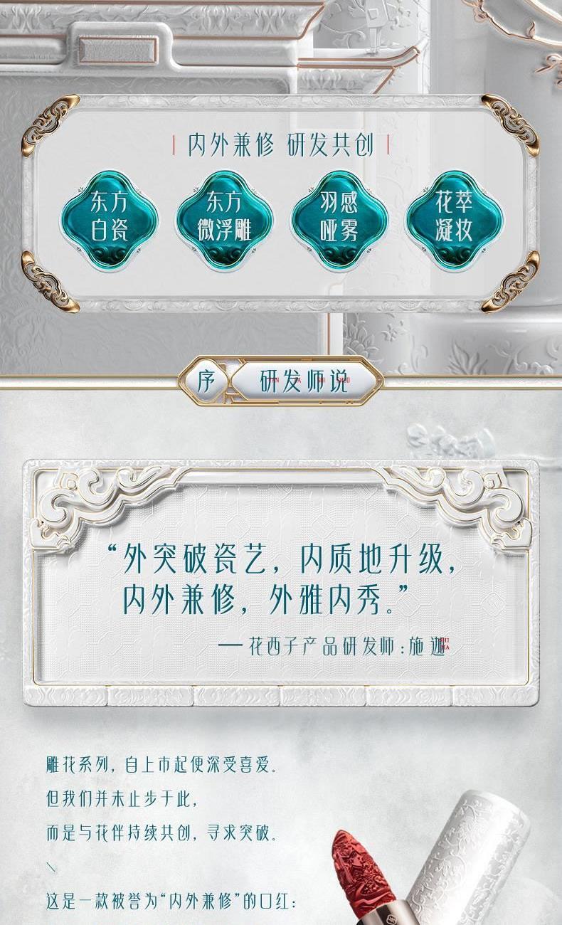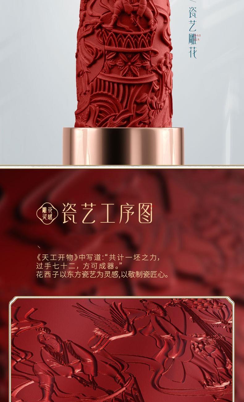 规格:3.5g 卖点: 1.花西子微浮雕系列口红,以慈禧太后所用古方“花露胭脂”为灵感,添加突厥蔷薇等花植精华,花萃凝妆 2.「微雕」「浮雕」「微浮雕」,三大传统工艺,是口红,也是艺术品。