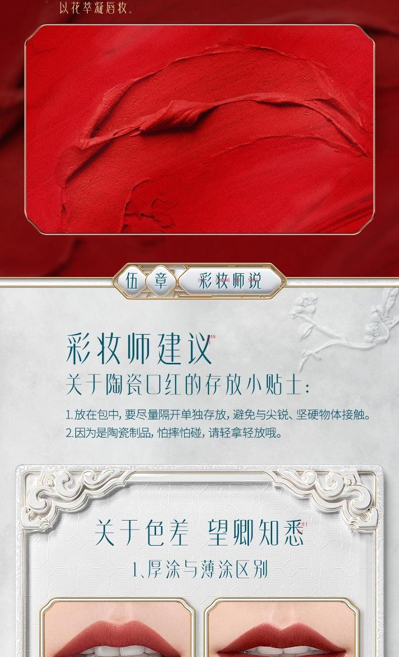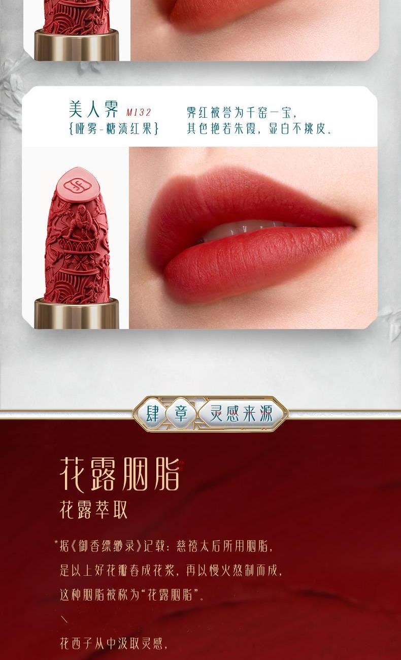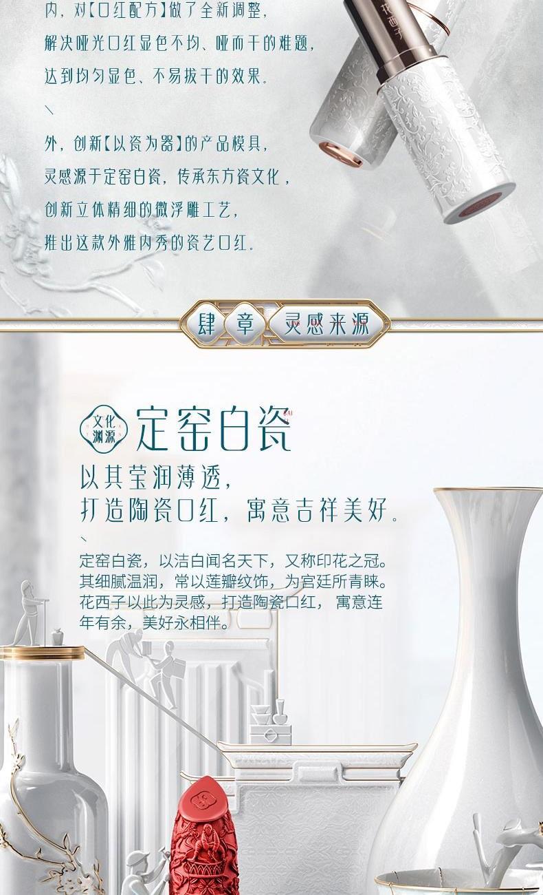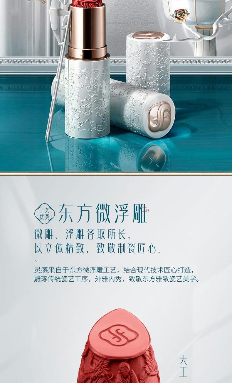 规格:3.5g 卖点: 1.花西子微浮雕系列口红,以慈禧太后所用古方“花露胭脂”为灵感,添加突厥蔷薇等花植精华,花萃凝妆 2.「微雕」「浮雕」「微浮雕」,三大传统工艺,是口红,也是艺术品。