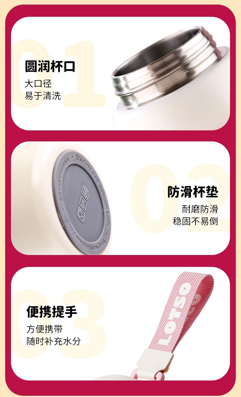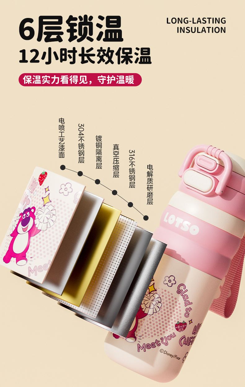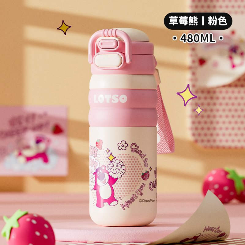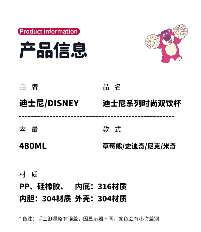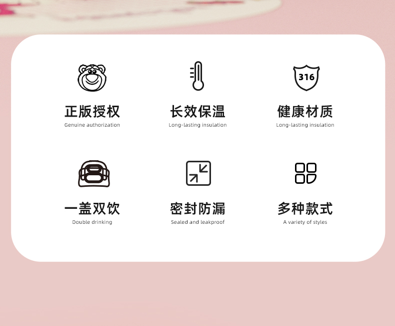 迪士尼儿童保温杯男女孩上学专用食品级316草莓熊双饮口吸管水壶480ML 型号:H15077 尺寸8.8*8.8*22.2cm 产品卖点说明:正版授权 长效保温 健康材质 一盖双饮 密封防漏 多种款式,四款萌趣款式高颜值选你所爱,密封锁扣防止误触,316不锈钢,密封不漏水360°任意倒置,防滑杯垫,便携提手