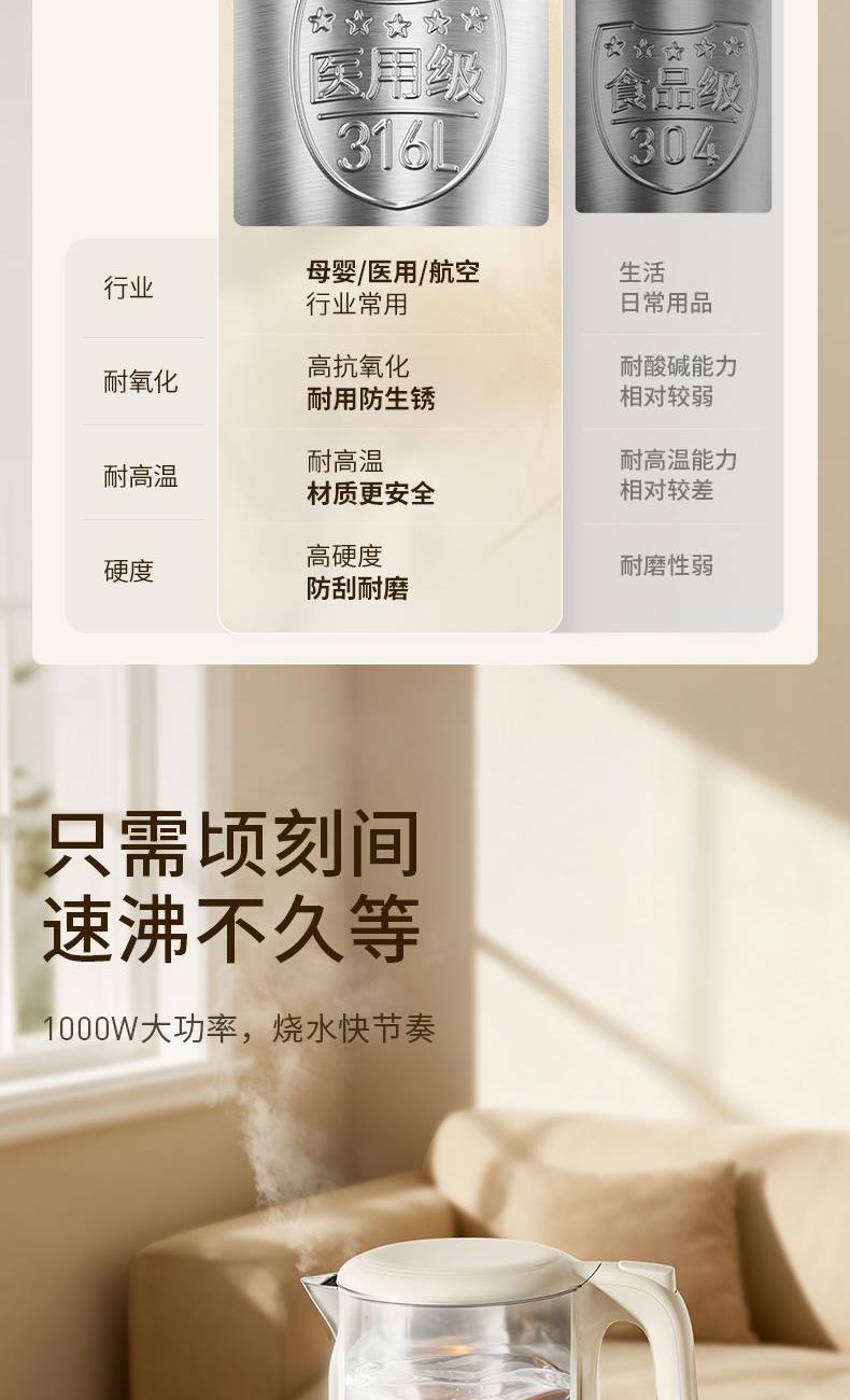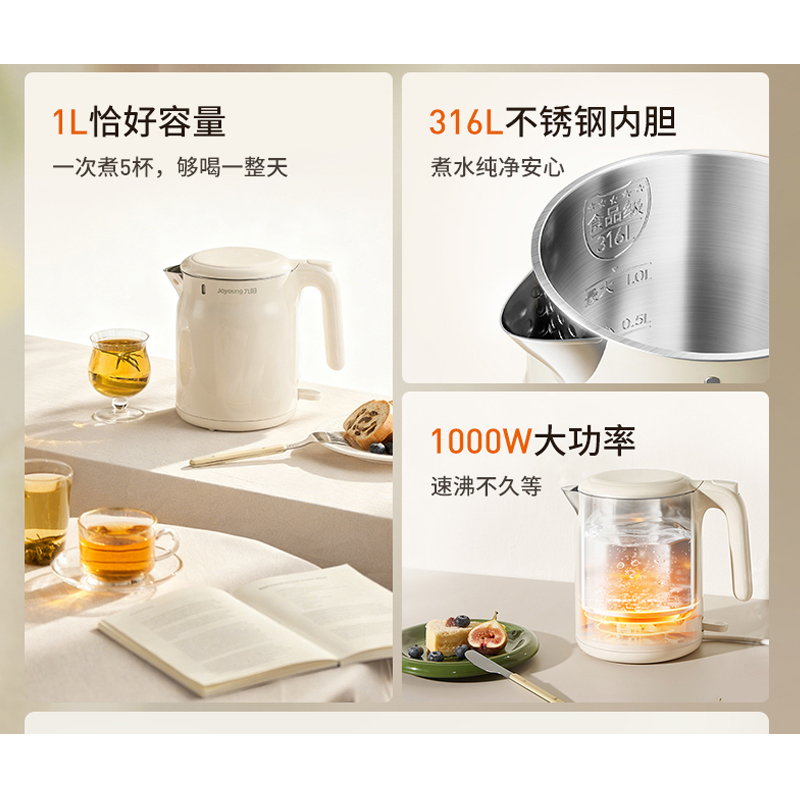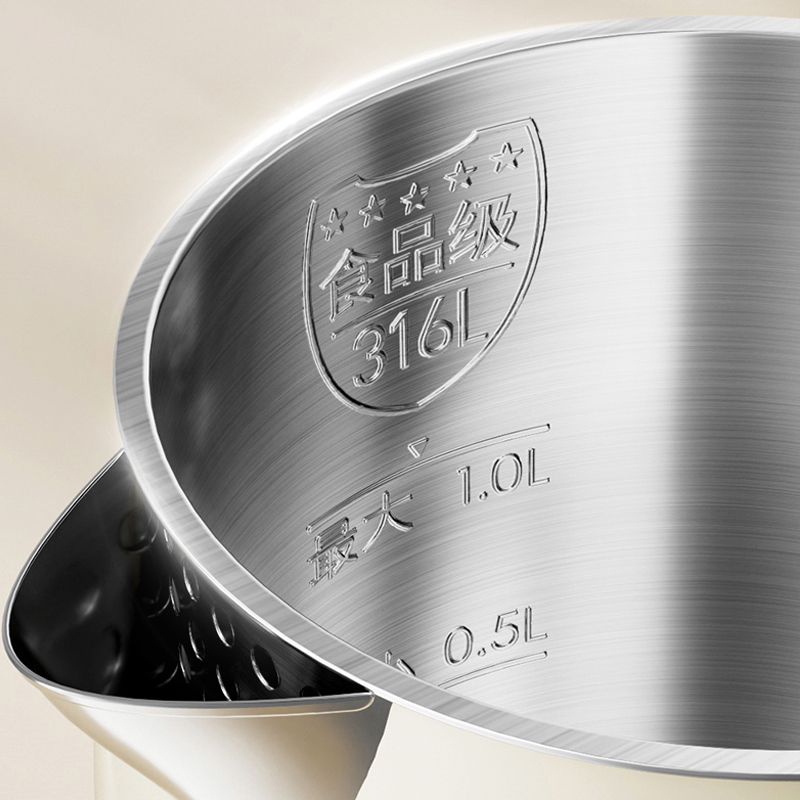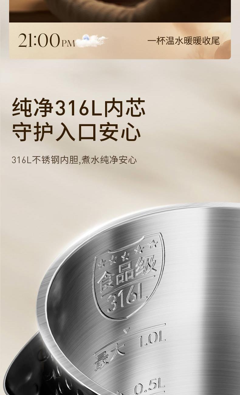 316L不锈钢内胆,煮水纯净安心 1000W大功率,速沸不久等 外塑内钢结构,双层壶身防烫 1L恰好容量