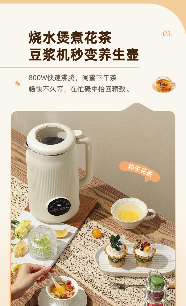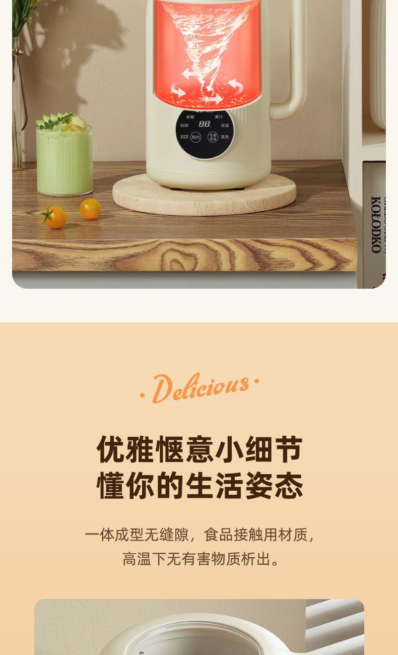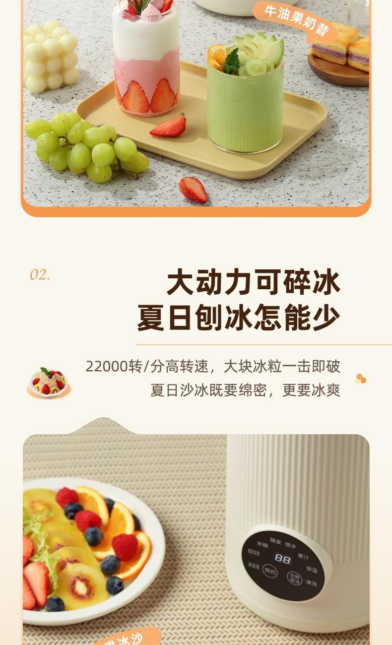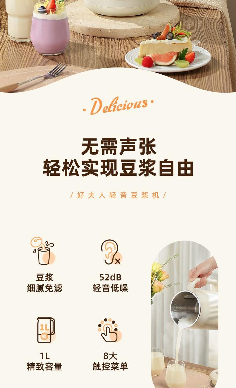 颜色:米白色 容量:1L 功率:800W 操作方式:触控 产品毛重:1.7kg 单台规格:130*180*278mm 包装尺寸:194*194*320mm 1、52dB静音破壁,早安豆浆不不扰清梦; 2、一机冷热双打,热饮香浓滑,冷饮沁心爽; 3、微电脑,8大预设菜单,一键轻触,轻松便捷; 4、破壁精煮不夹生,微压豆浆,快煮香浓; 5、大动力,可碎冰,夏日刨冰不可少,22000转/分钟; 6、烧水煲煮,800W快速沸腾; 7、1L灵巧容量,满足独享或小聚; 8、18小时预约,55℃保温,一键高温清洗
