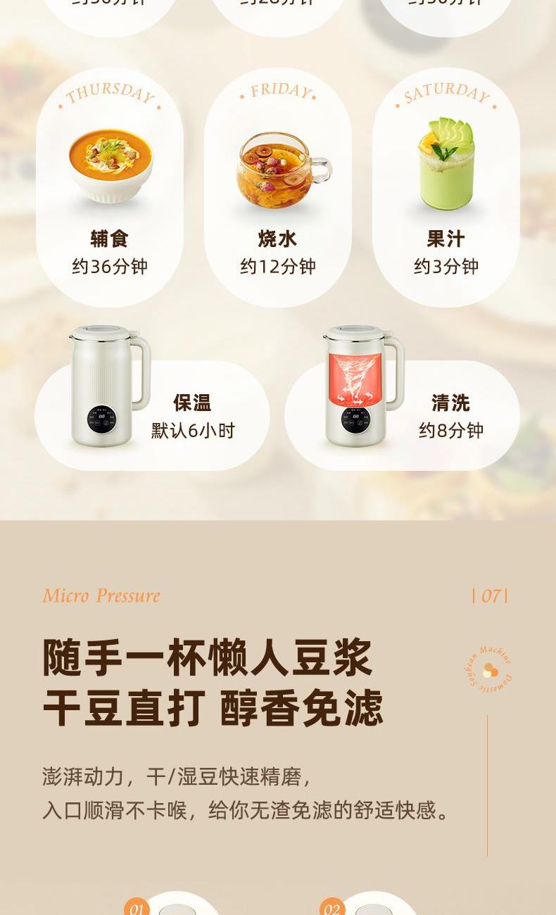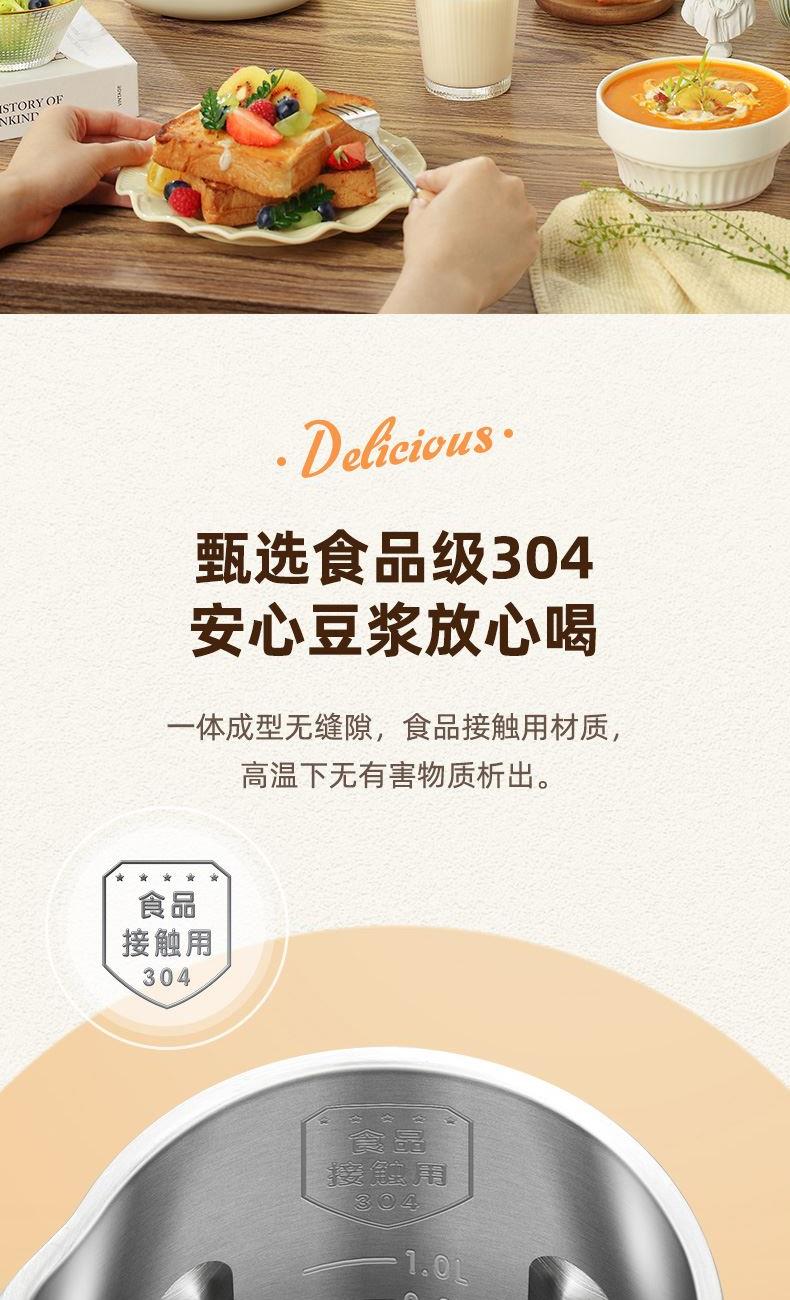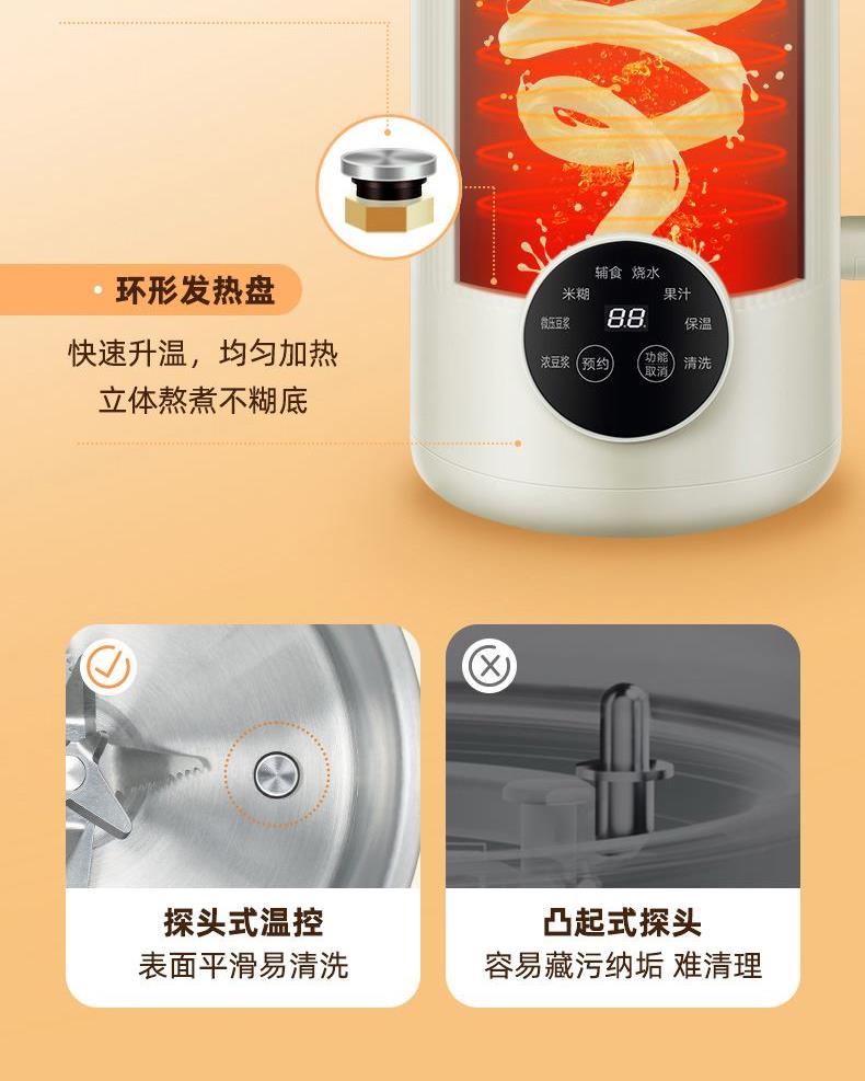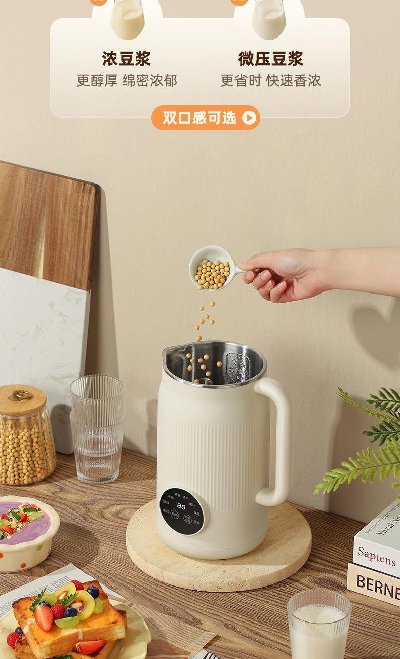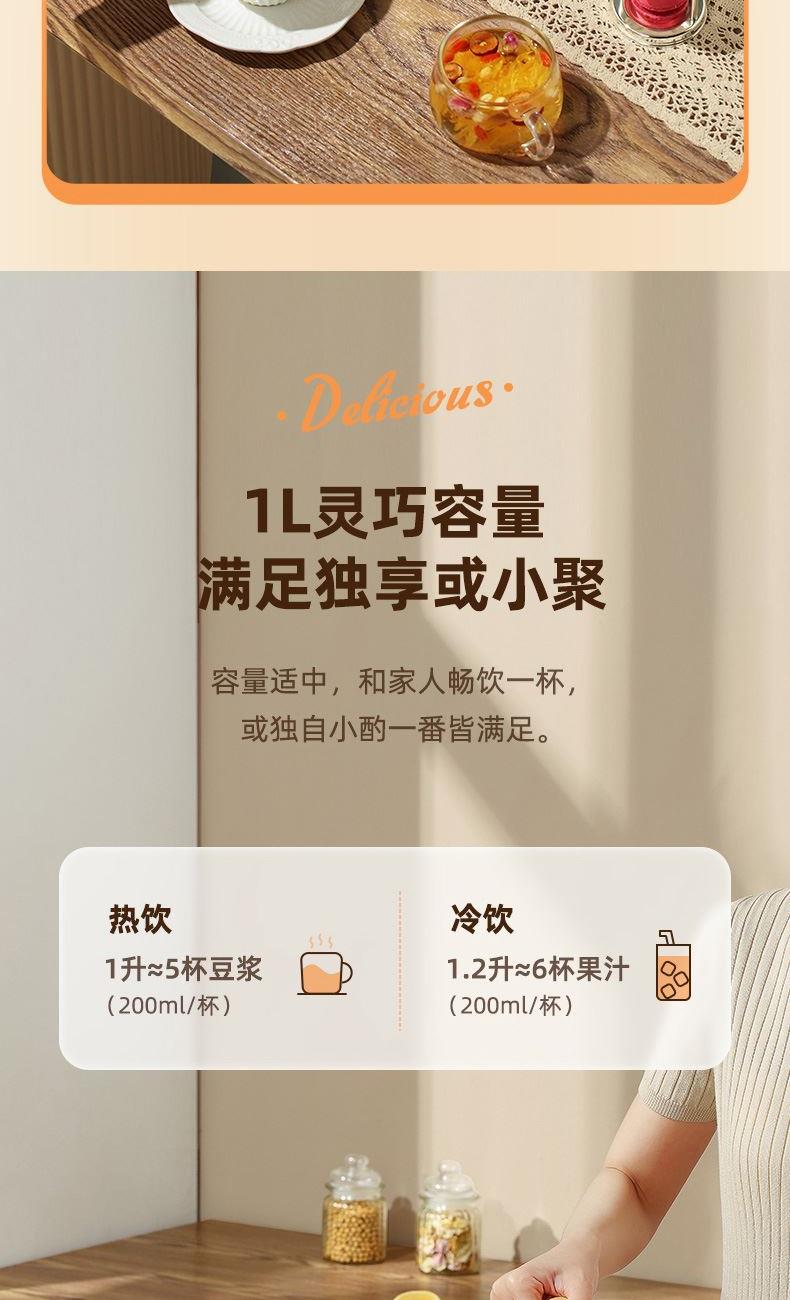颜色:米白色 容量:1L 功率:800W 操作方式:触控 产品毛重:1.7kg 单台规格:130*180*278mm 包装尺寸:194*194*320mm 1、52dB静音破壁,早安豆浆不不扰清梦; 2、一机冷热双打,热饮香浓滑,冷饮沁心爽; 3、微电脑,8大预设菜单,一键轻触,轻松便捷; 4、破壁精煮不夹生,微压豆浆,快煮香浓; 5、大动力,可碎冰,夏日刨冰不可少,22000转/分钟; 6、烧水煲煮,800W快速沸腾; 7、1L灵巧容量,满足独享或小聚; 8、18小时预约,55℃保温,一键高温清洗