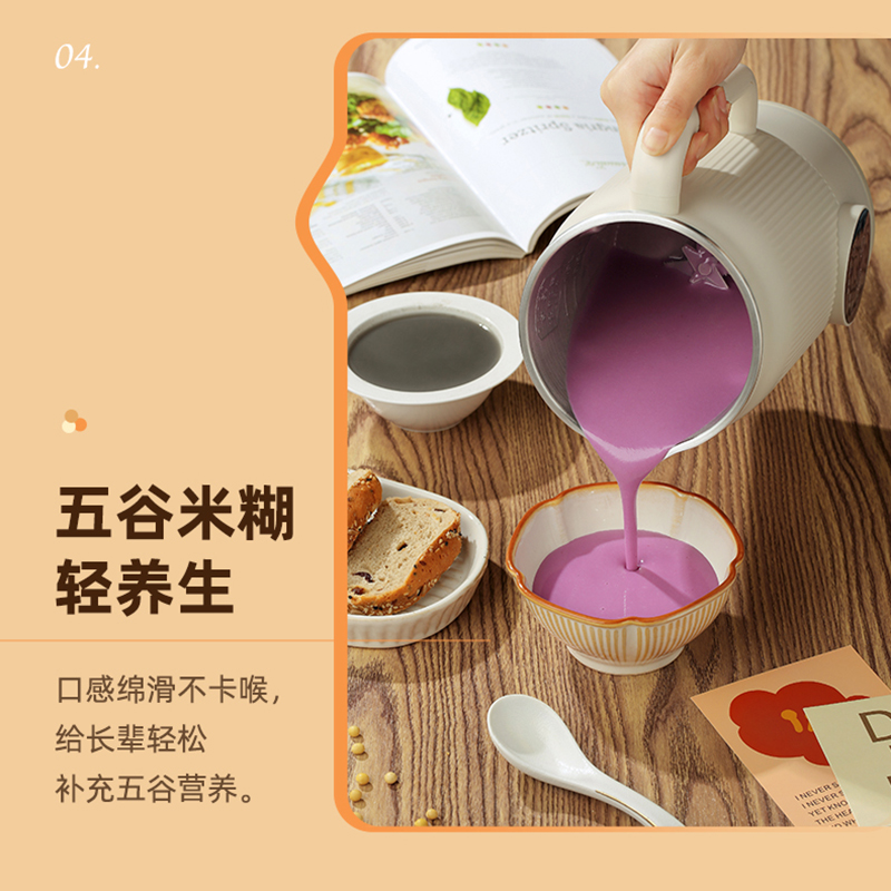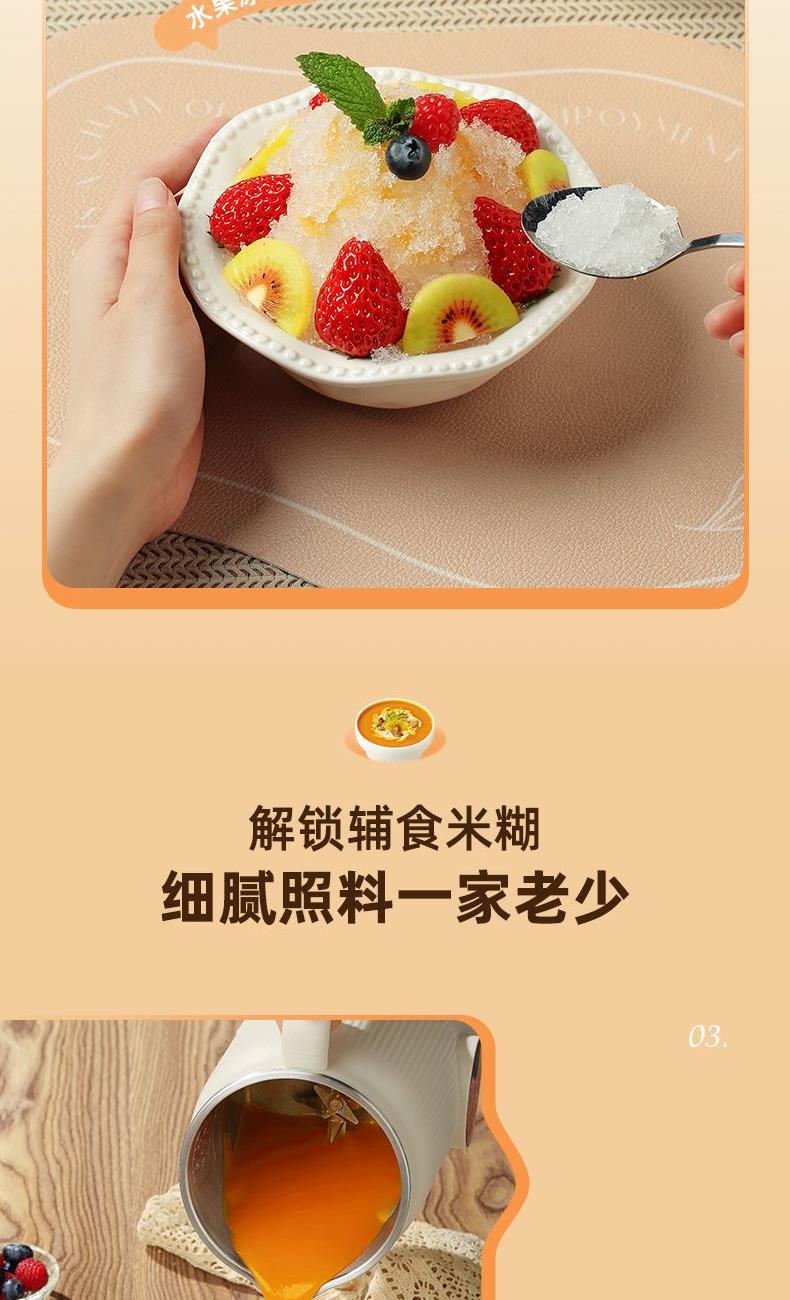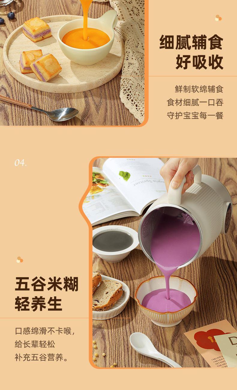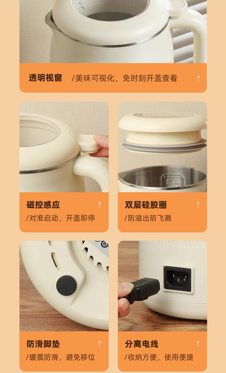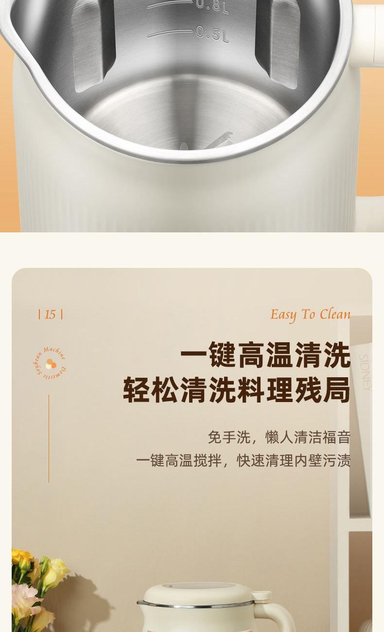颜色:米白色 容量:1L 功率:800W 操作方式:触控 产品毛重:1.7kg 单台规格:130*180*278mm 包装尺寸:194*194*320mm 1、52dB静音破壁,早安豆浆不不扰清梦; 2、一机冷热双打,热饮香浓滑,冷饮沁心爽; 3、微电脑,8大预设菜单,一键轻触,轻松便捷; 4、破壁精煮不夹生,微压豆浆,快煮香浓; 5、大动力,可碎冰,夏日刨冰不可少,22000转/分钟; 6、烧水煲煮,800W快速沸腾; 7、1L灵巧容量,满足独享或小聚; 8、18小时预约,55℃保温,一键高温清洗