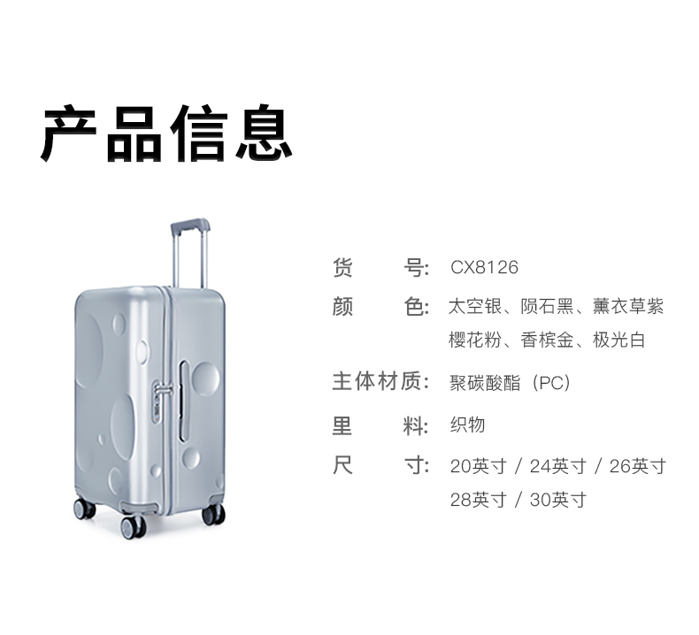 货号: CX8126-28 主体面料:聚碳酸酯(PC);里料:织物 28寸颜色:时空银 净重: 4.30kg/93L