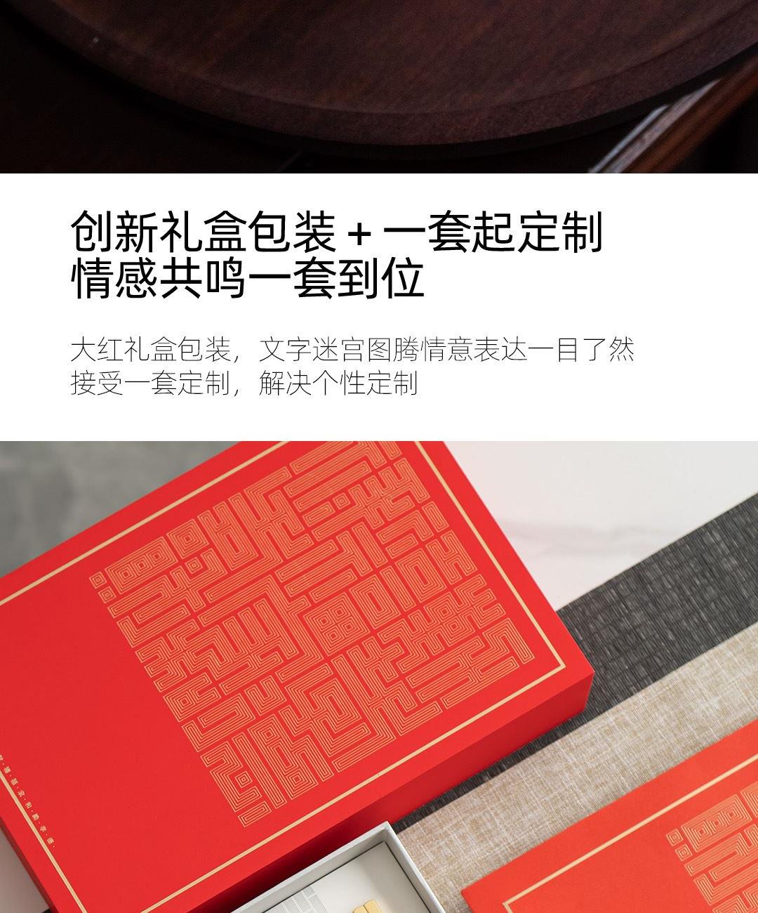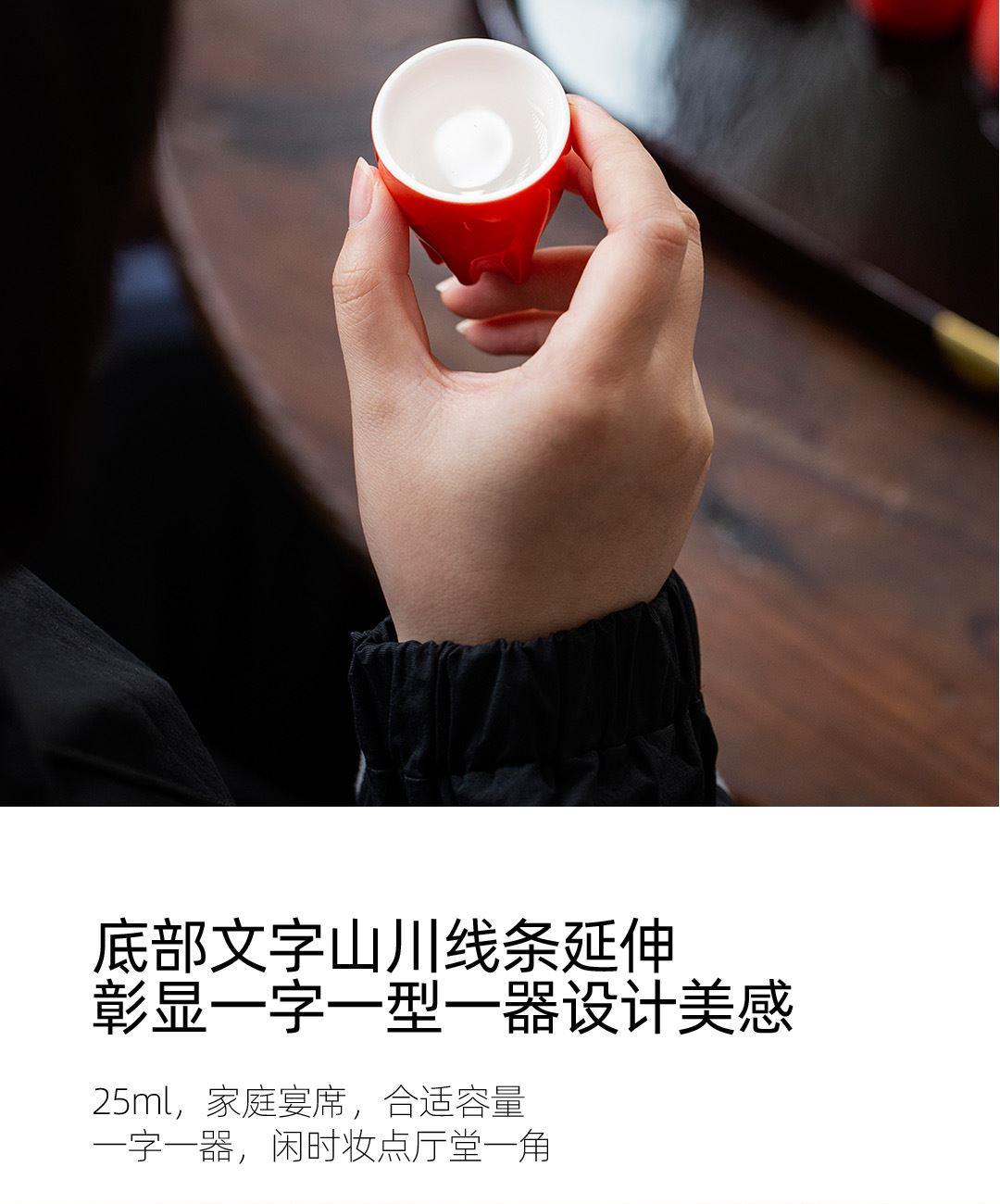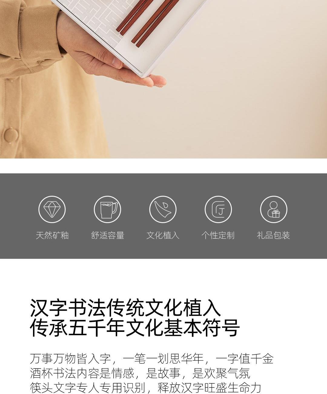 1:高等级高岭土,历经1300度以上高温烧制,不含铅和镉等重金属。 2:杯底书法源自书圣王羲之,手工塑形,一字一杯。 3:原木筷子,无漆无蜡,手工打磨个性定制,专人专筷,健康使用。。 4:包装采用特种雕金纸,大气美观,定制美观。 配置:吉意杯*4 (喜乐安康,可选“感谢有你”) 红檀中华筷*4 材质:白玉瓷胎 实木