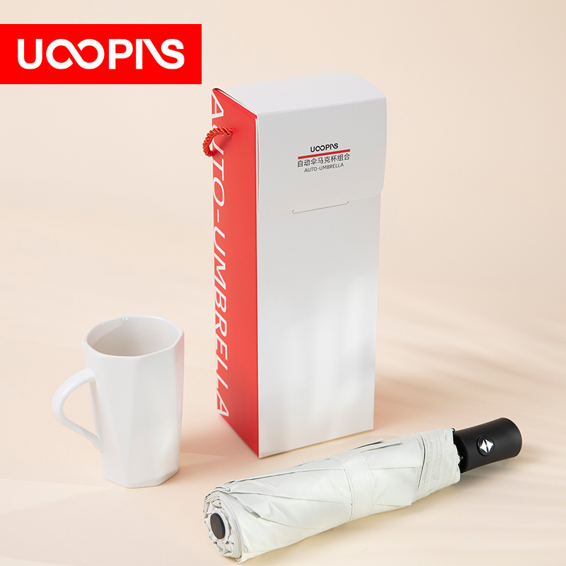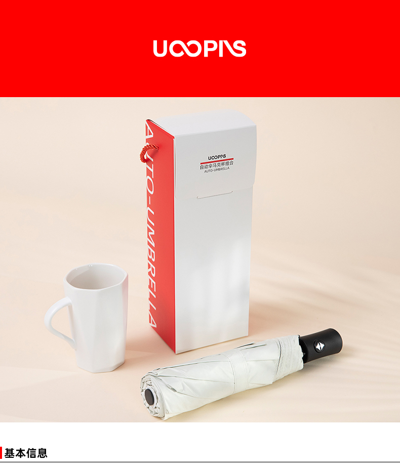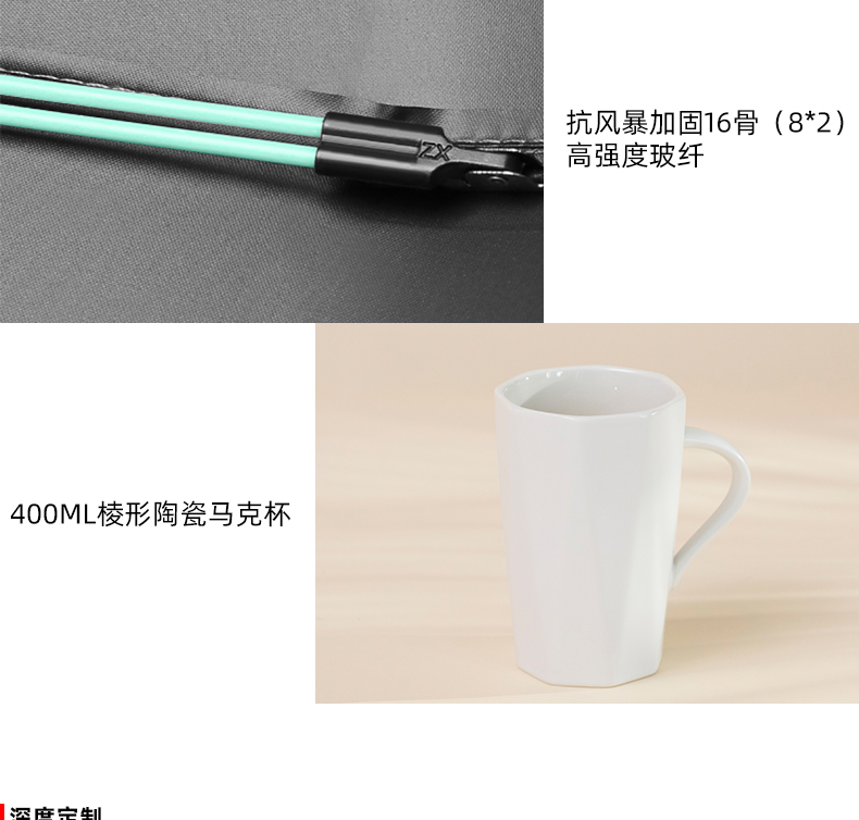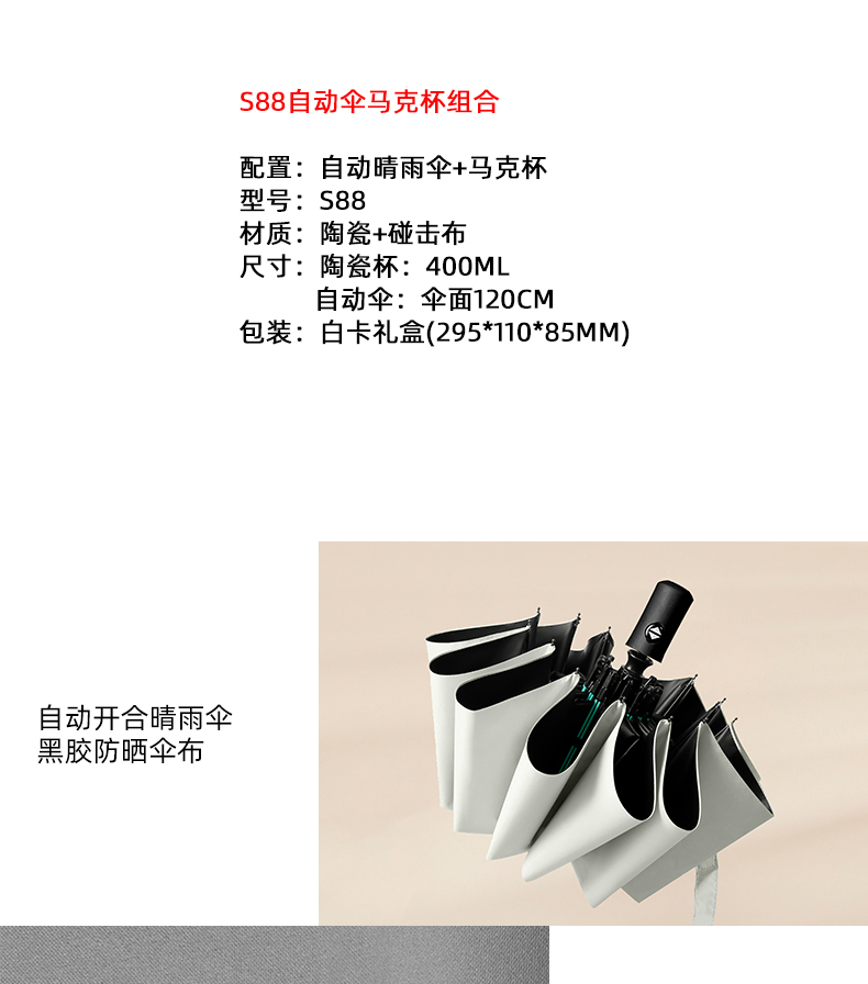 配置:自动晴雨伞+马克杯 型号:S88 材质:陶瓷+碰击布 尺寸:陶瓷杯:400ml 自动伞:伞面120cm 包装:白卡礼盒(295*110*85mm)