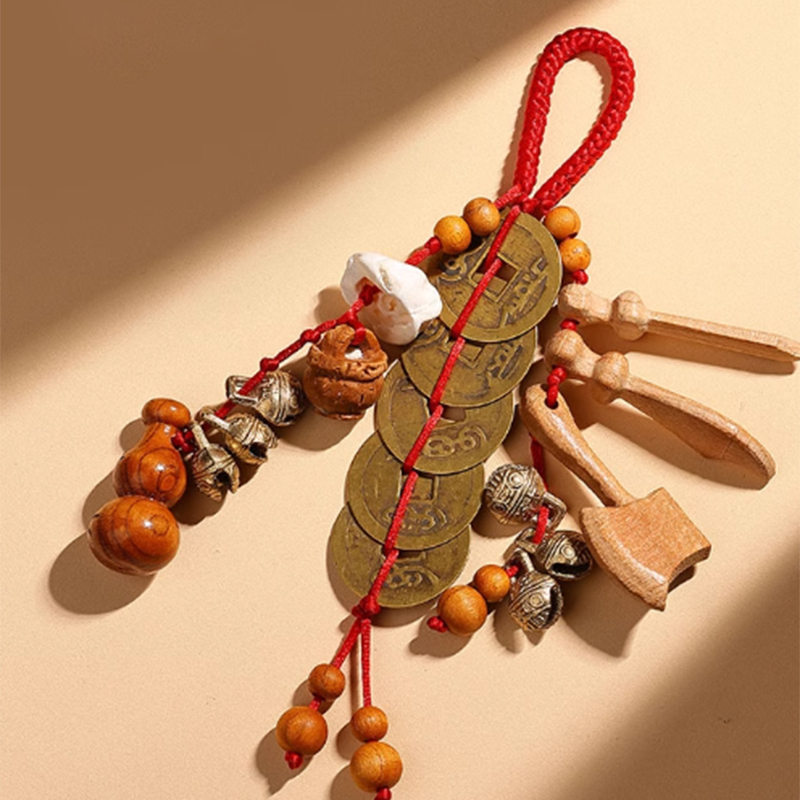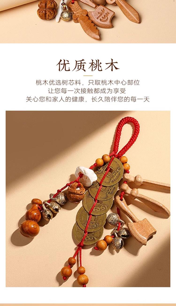双重辟邪,万煞不侵: 老桃木从材质上提供强大的辟邪能量,如同一位法力高强的法师;而五帝钱则凭借其盛世皇气,专门负责抵挡和化解各种煞气。两者结合,形成了无可匹敌的防护组合,寓意着为家庭或个人建立一个坚不可摧的保护磁场,强力抵御一切负面能量和邪祟的侵扰。 家宅安宁,运势昌隆: 悬挂于家中或车内,象征着净化整个环境的磁场,保佑家人身体健康,家庭和睦,运势兴旺。