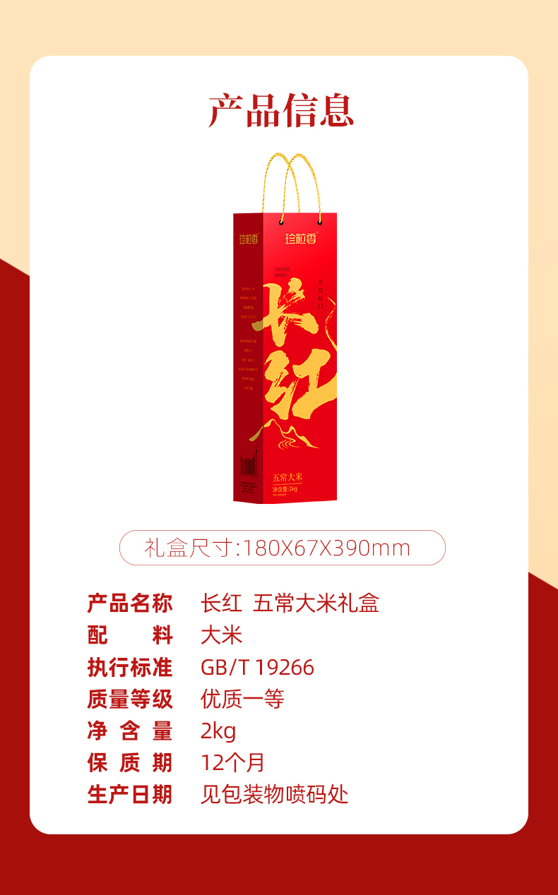 产品规格:1kgX2 质量等级:优质一等 产品标准:GB/T 19266 产品包装:米砖+礼盒 产品规格:8盒/箱 产品尺寸:108*67*390mm 条 码:6976641150302 发 货 地:黑龙江省五常市 推荐理由: 1、五常黄金稻场产区 2、活水滋养灌溉,一年一季 3、富含微量元素,粒粒甜糯清香 4、独立真空包装,避免营养流失