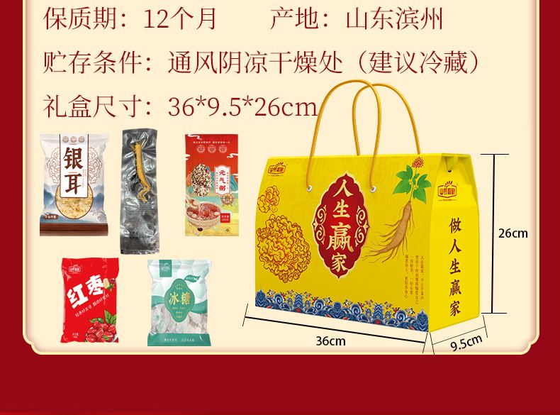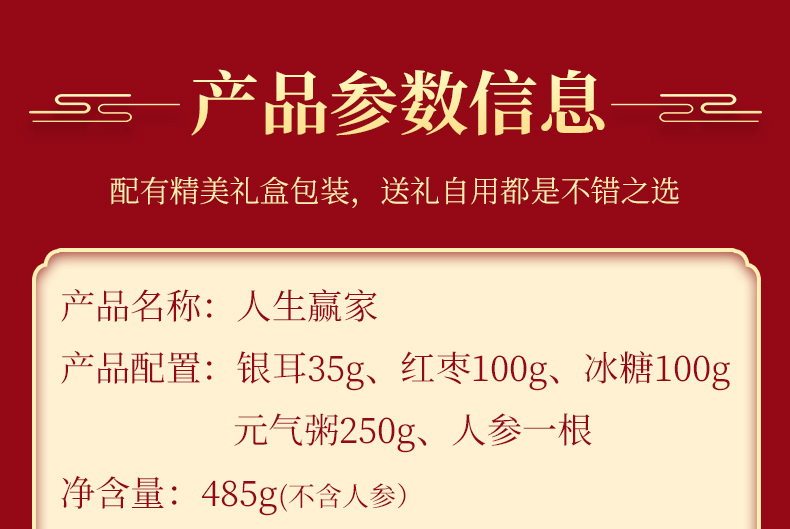 产品规格配置:银耳35g、红枣100g、冰糖100g、元气粥250g人参一根 盒尺寸:36*9.5*26c 箱尺寸:60*37.5*54 箱重量:10.28kg 箱体积:0.122 方