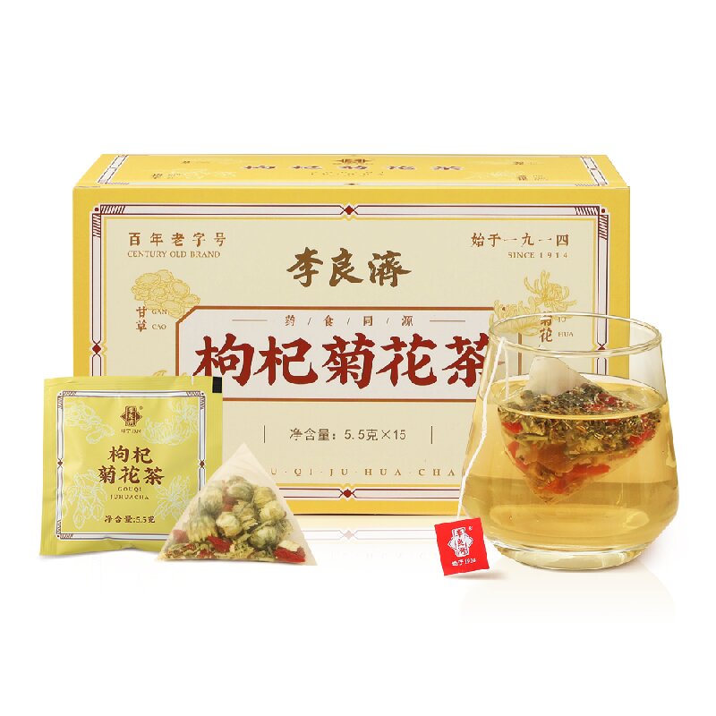 产品:李良济枸杞菊花茶 规格:净含量82.5克(5.5g*15包) 保质量:18个月 贮藏方法:阴凉干燥通风处存放,防潮,防异味 配料表:枸杞、菊花、甘草、金银花 办公室饮品,商务接待,白领自饮 精致包装,送礼佳选