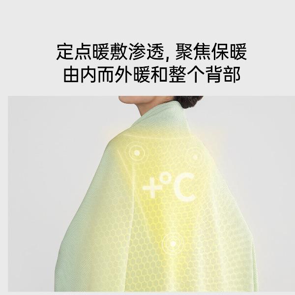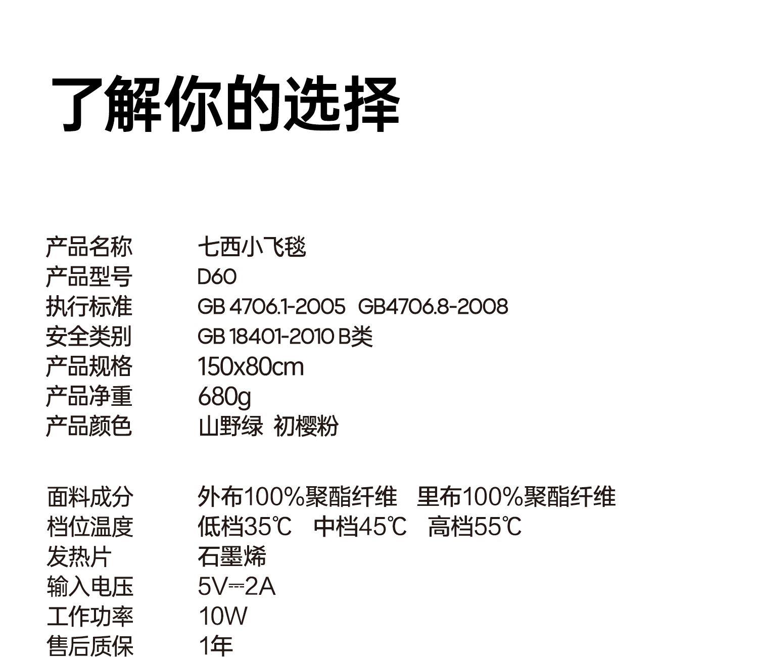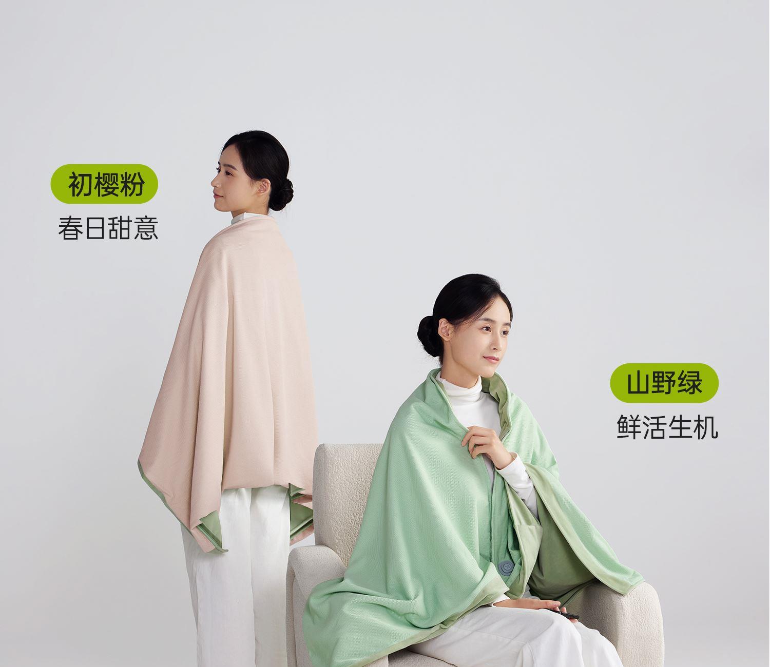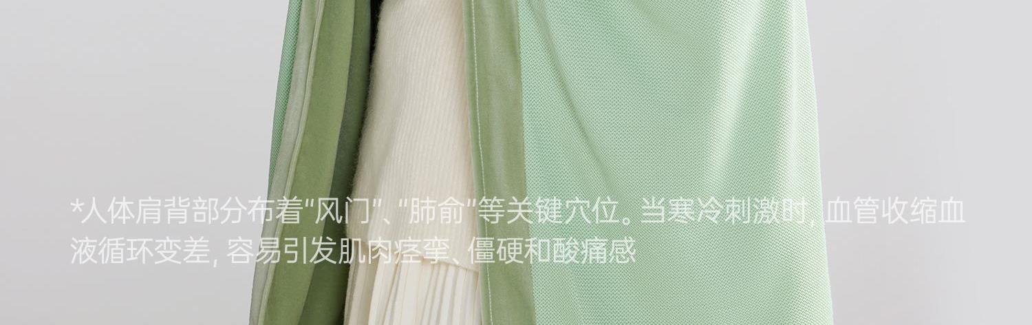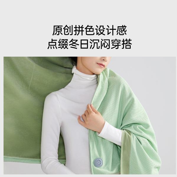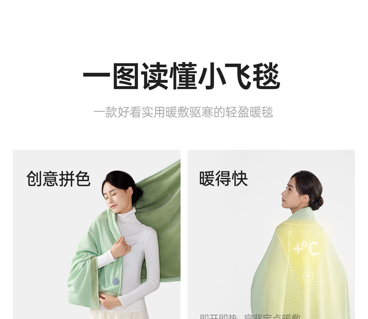 产品颜色:山野绿、初樱粉 69码: 6978516260949(山野绿)、 6978516260956(初樱粉) 产品规格:150*80cm 产品净重:680g 面料成分:外布聚酯纤维,里布聚酯纤维 产品明细:小飞毯*1、说明书*1 卖点: 1.石墨烯3秒速热,速热效率高,温暖持久稳定 2.原创拼色设计感,点缀冬日沉闷穿搭 3.双面4重聚热结构,打造肩背保暖仓,热感锁温 4.内外双层亲肤软绒,内亲肤、外锁温 5.三档温度可调,按键操作简单方便,兼具保暖舒适