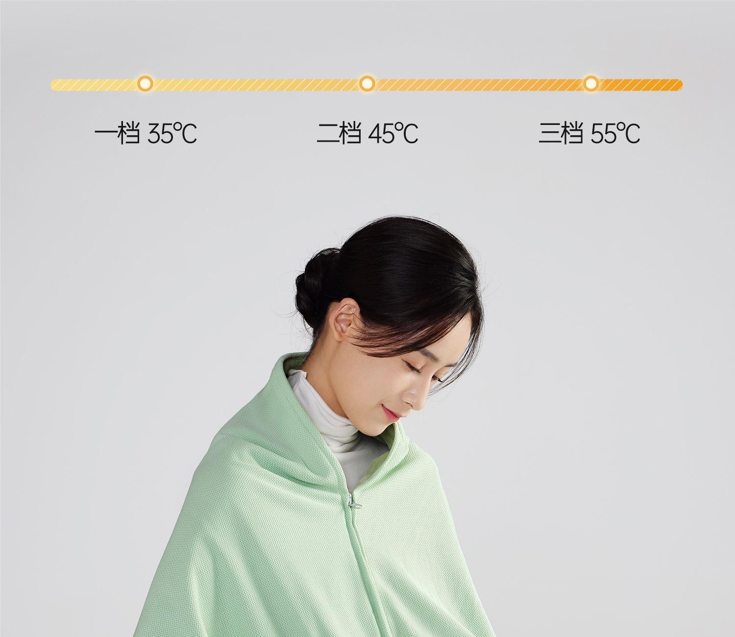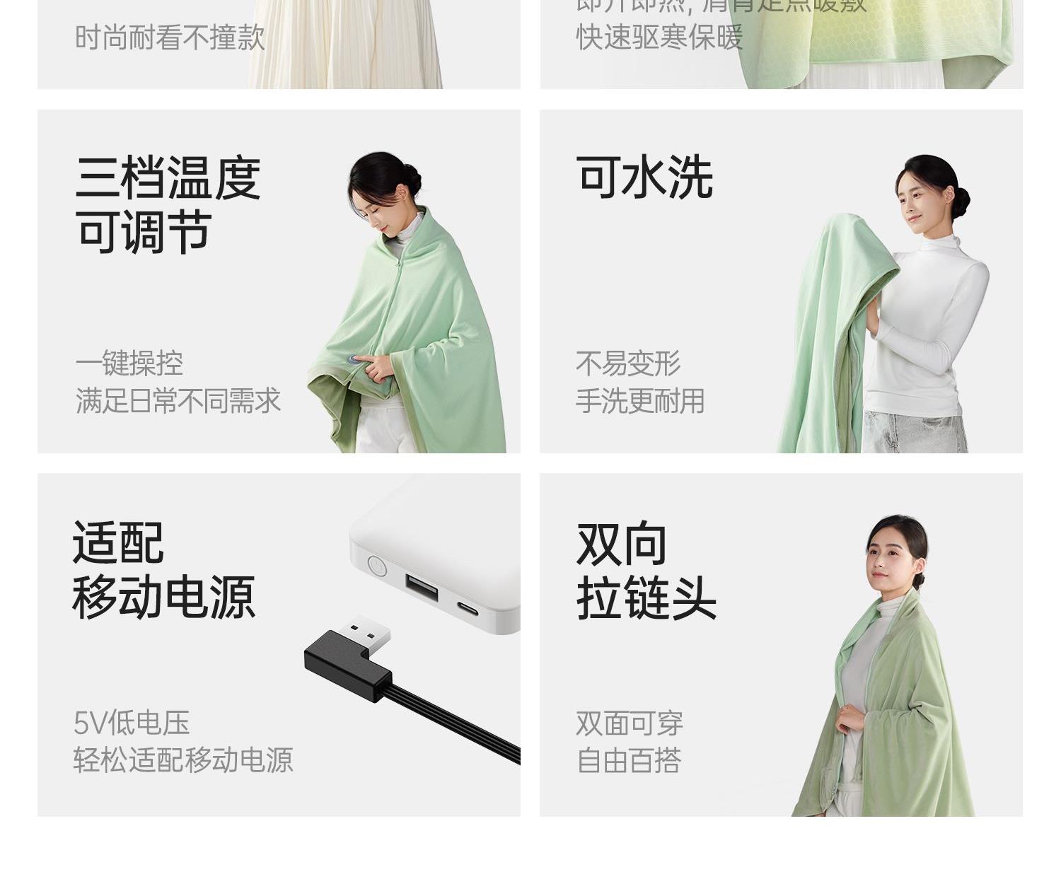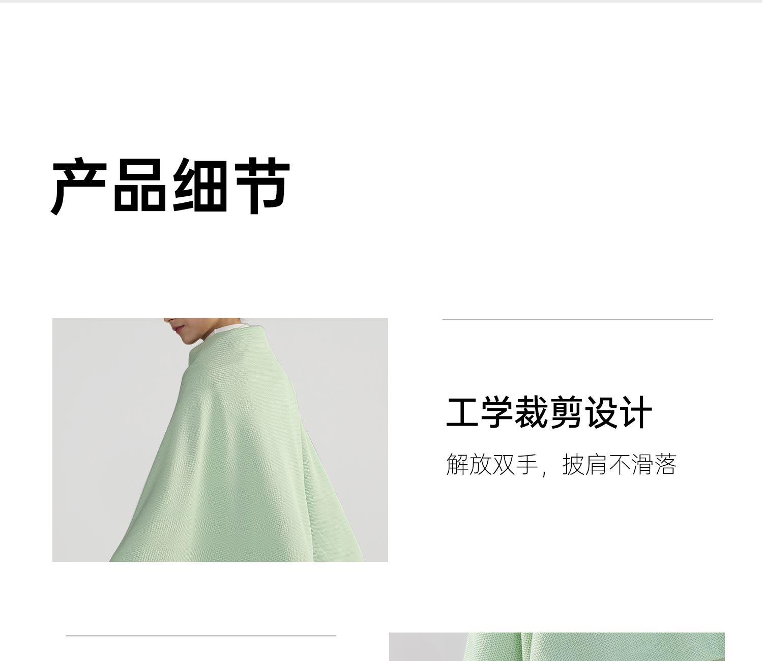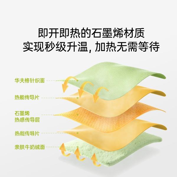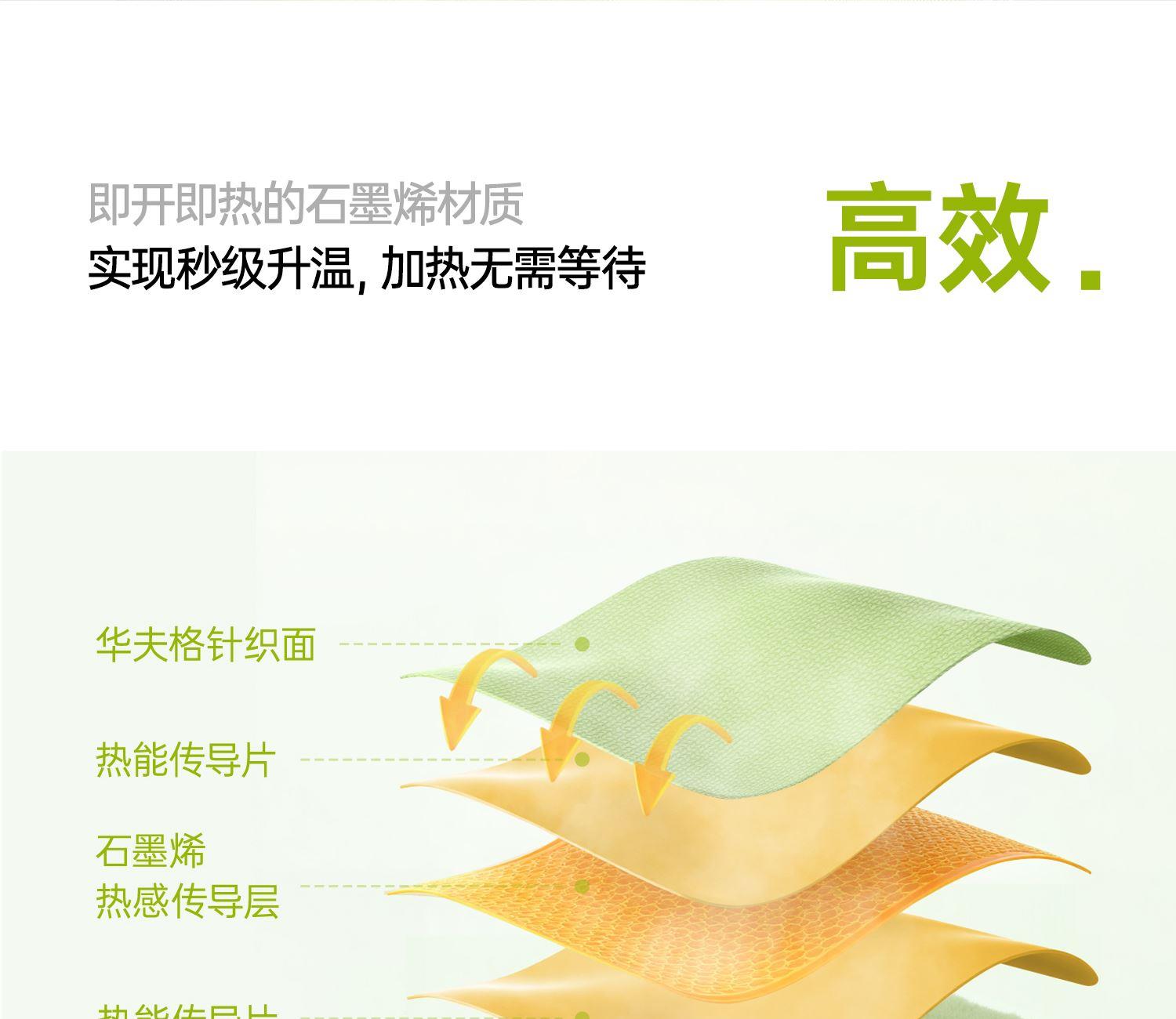 产品颜色:山野绿、初樱粉 69码: 6978516260949(山野绿)、 6978516260956(初樱粉) 产品规格:150*80cm 产品净重:680g 面料成分:外布聚酯纤维,里布聚酯纤维 产品明细:小飞毯*1、说明书*1 卖点: 1.石墨烯3秒速热,速热效率高,温暖持久稳定 2.原创拼色设计感,点缀冬日沉闷穿搭 3.双面4重聚热结构,打造肩背保暖仓,热感锁温 4.内外双层亲肤软绒,内亲肤、外锁温 5.三档温度可调,按键操作简单方便,兼具保暖舒适