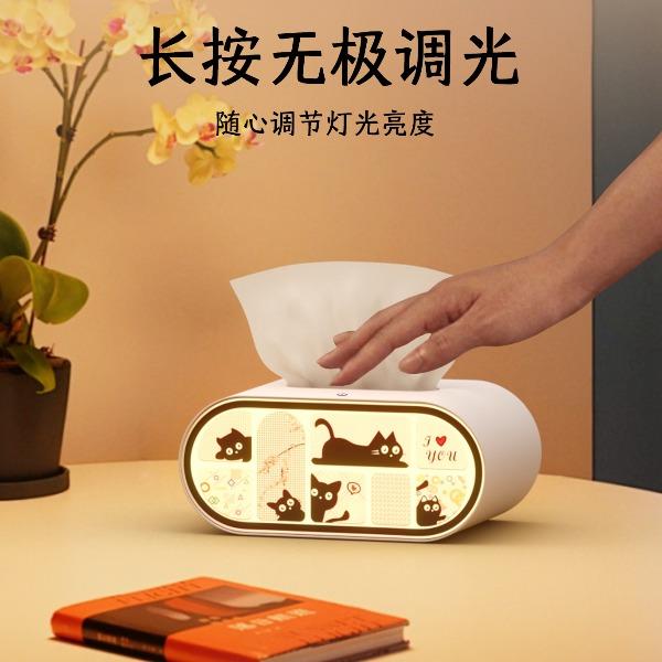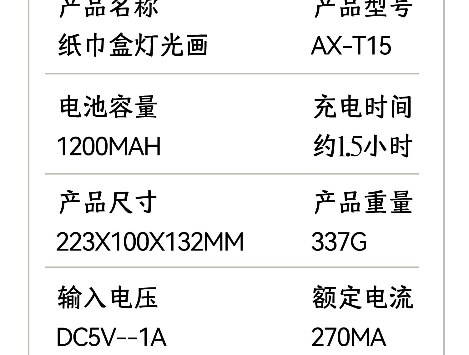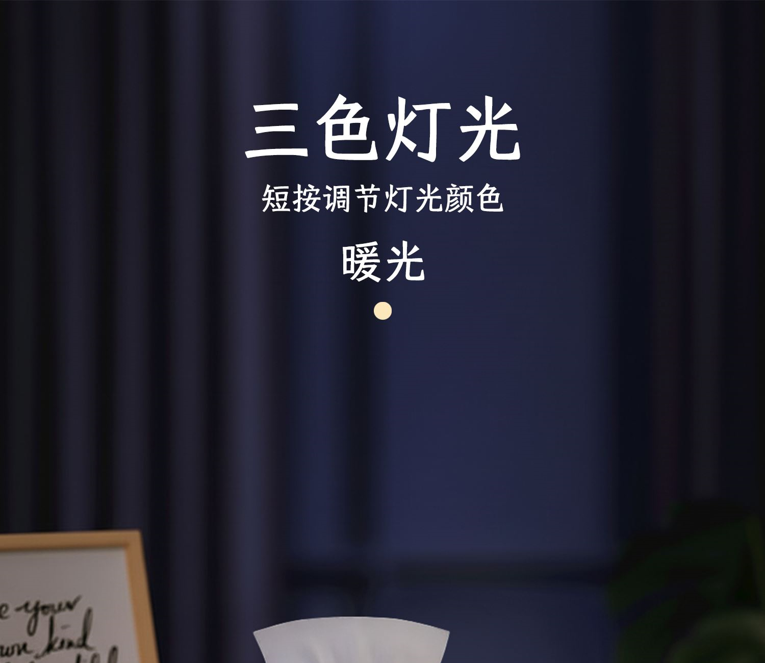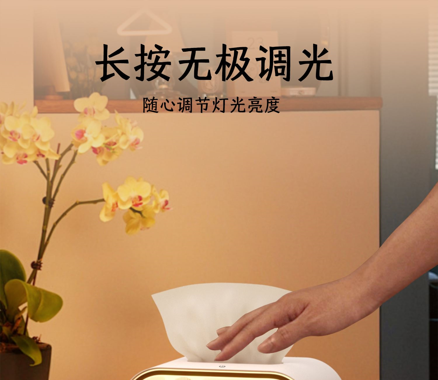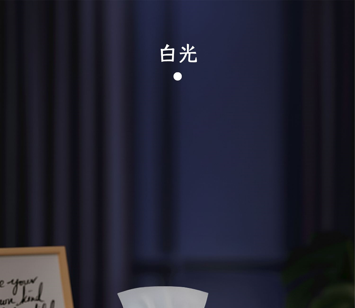 【颜色】白色 【材质】ABS/PMMA/电子元件 【产品尺寸】223x100x132mm 【包装尺寸】224*105*137mm 【电源输入】 5V/1A 【电池容量】1200毫安 【产品重量】337/445g 颠覆性创新纸巾盒,纸巾盒的光影艺术,匠心品质,轻奢格调,方圆搭配美学 加大出纸口,顺滑抽纸不卡顿 随心调节灯光亮度,触摸开光,三色灯光,