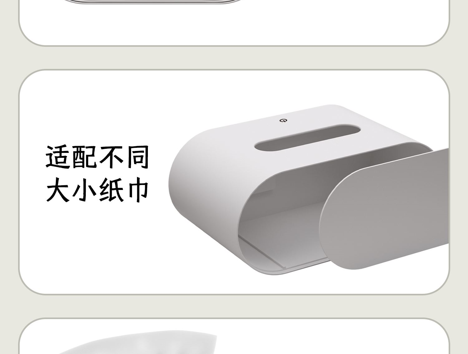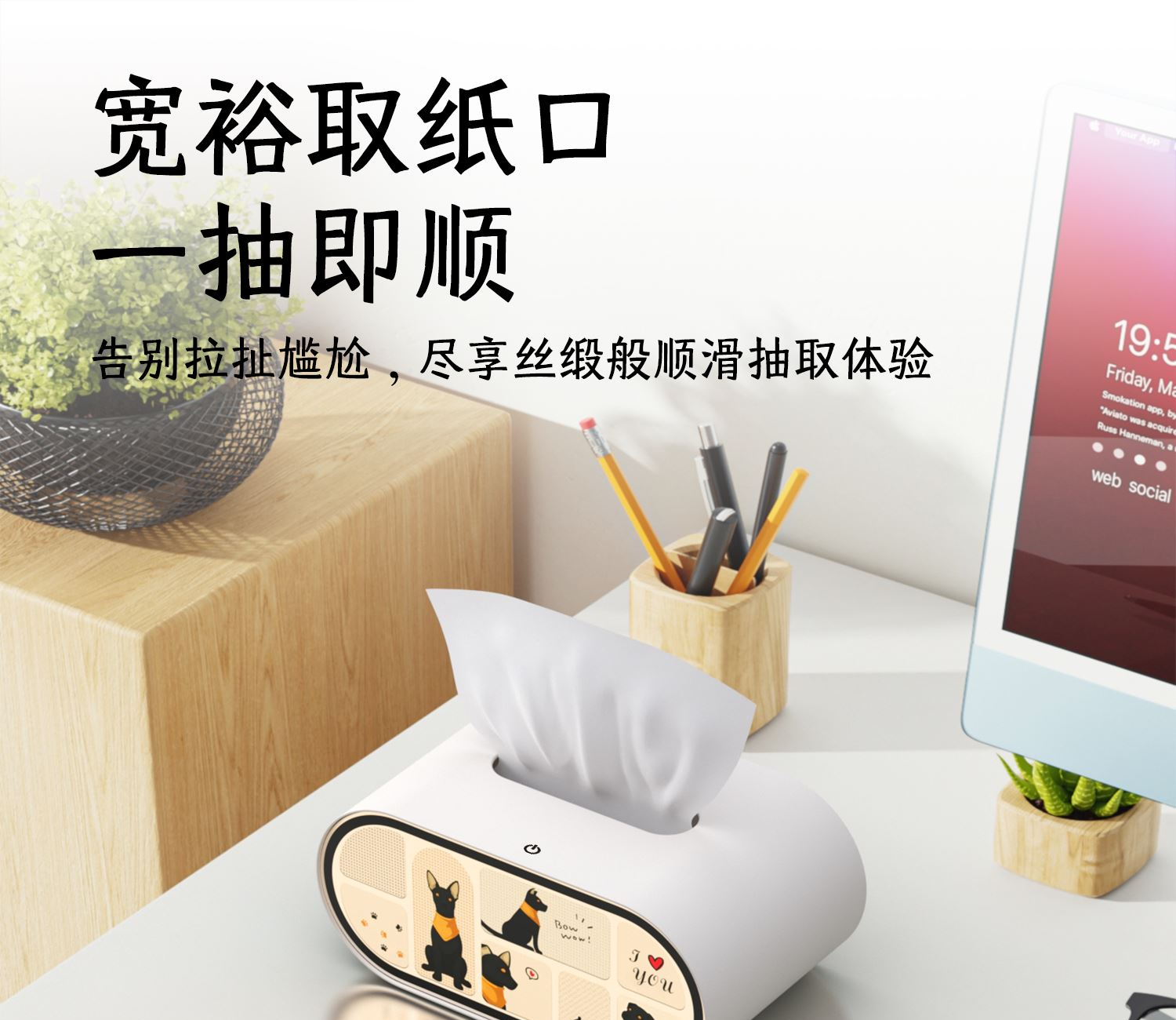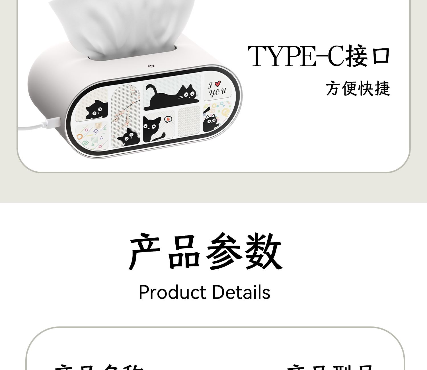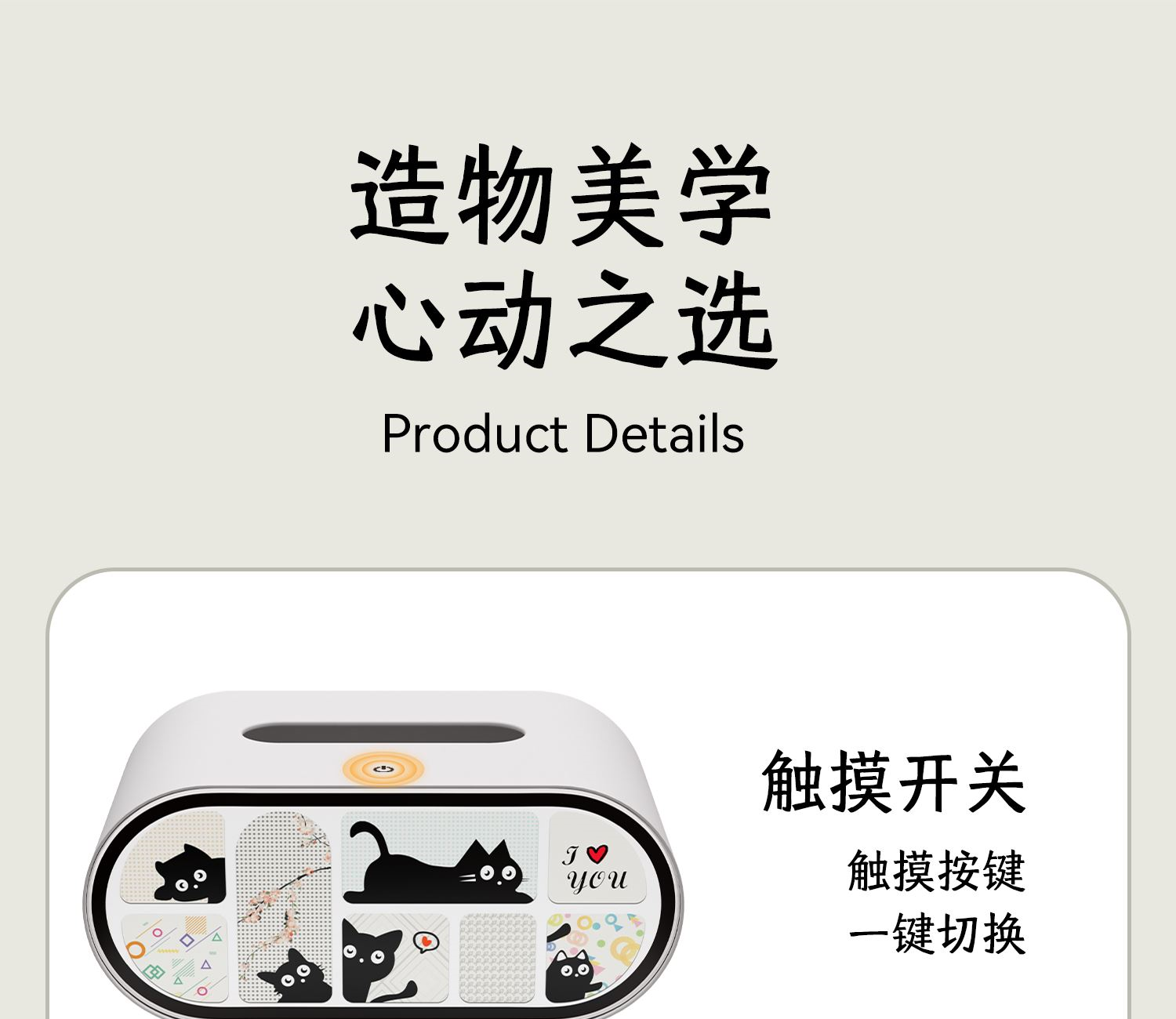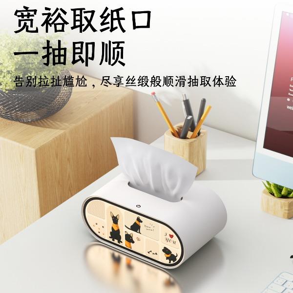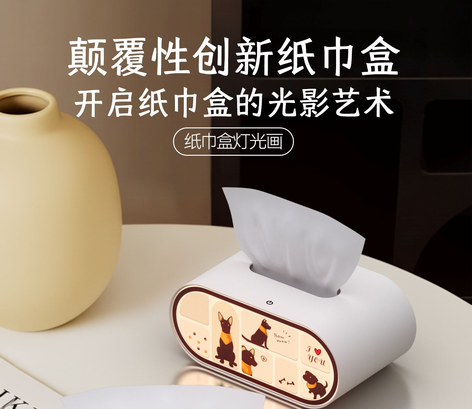 【颜色】白色 【材质】ABS/PMMA/电子元件 【产品尺寸】223x100x132mm 【包装尺寸】224*105*137mm 【电源输入】 5V/1A 【电池容量】1200毫安 【产品重量】337/445g 颠覆性创新纸巾盒,纸巾盒的光影艺术,匠心品质,轻奢格调,方圆搭配美学 加大出纸口,顺滑抽纸不卡顿 随心调节灯光亮度,触摸开光,三色灯光,