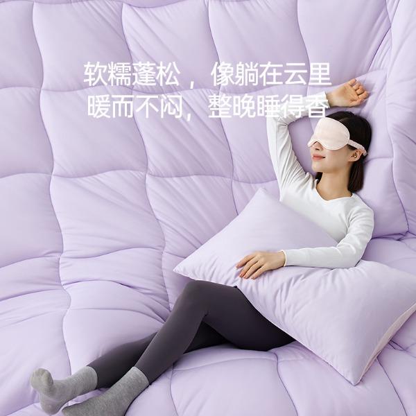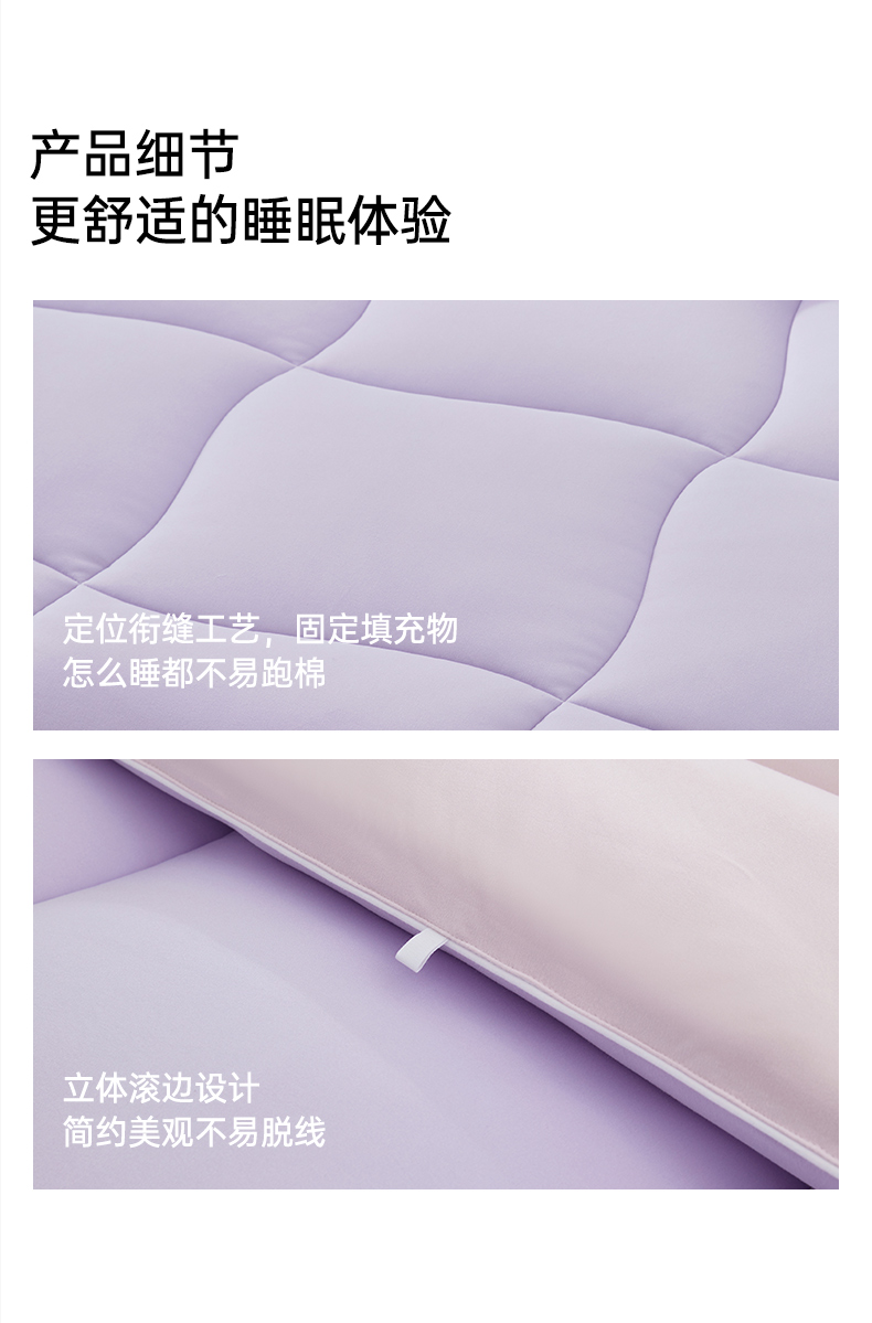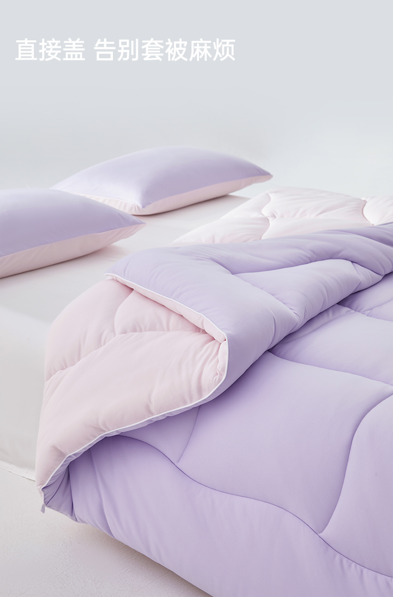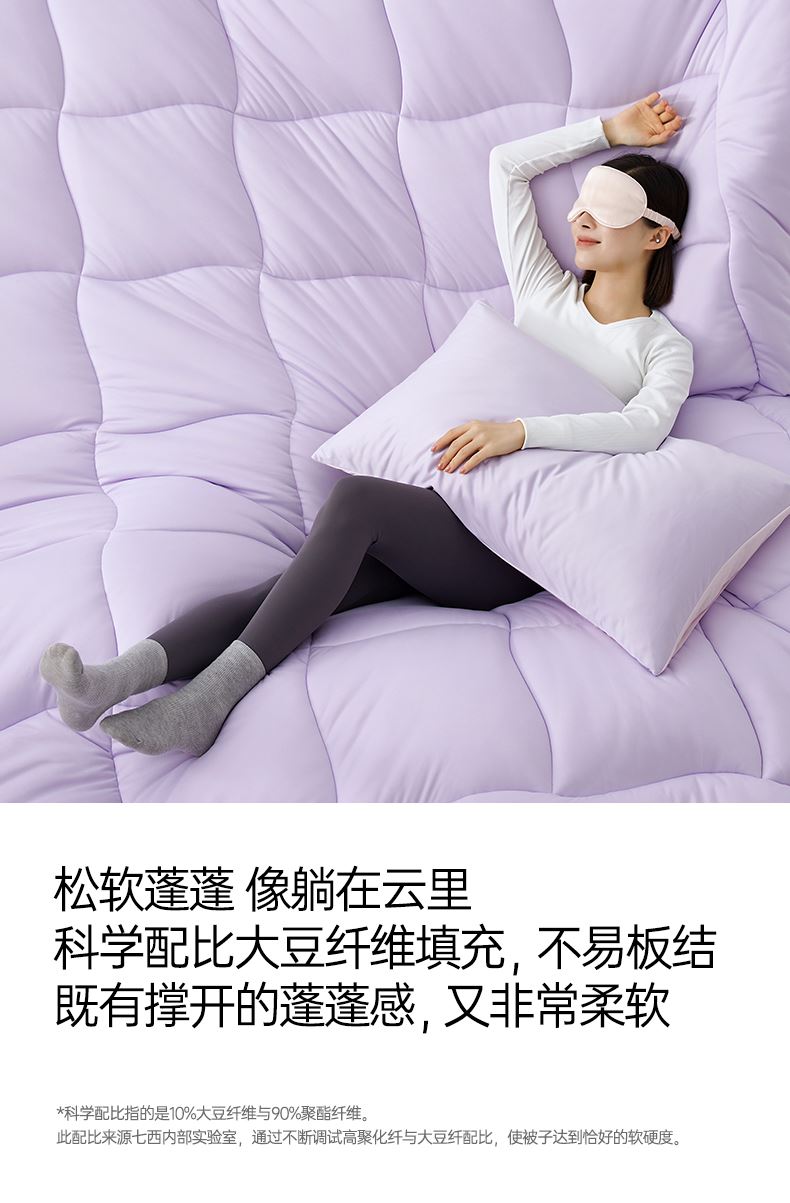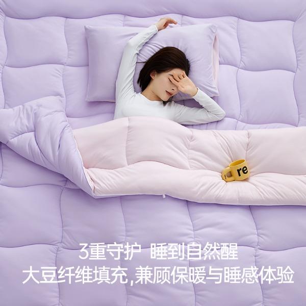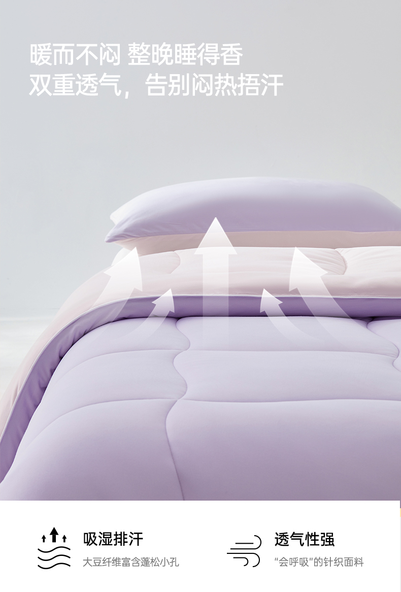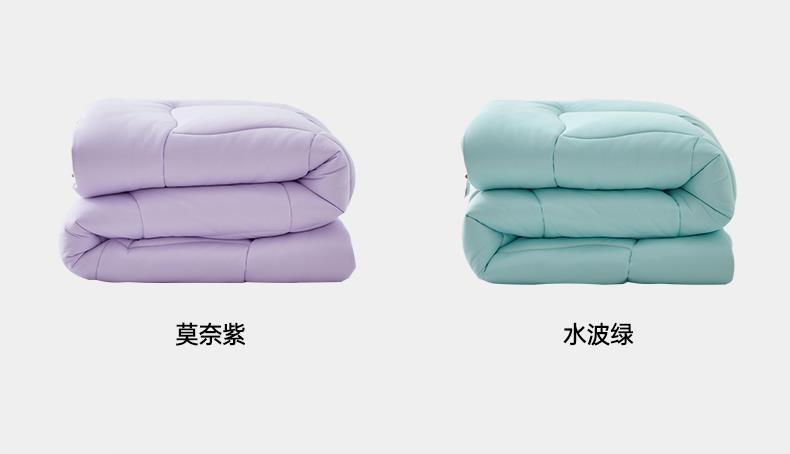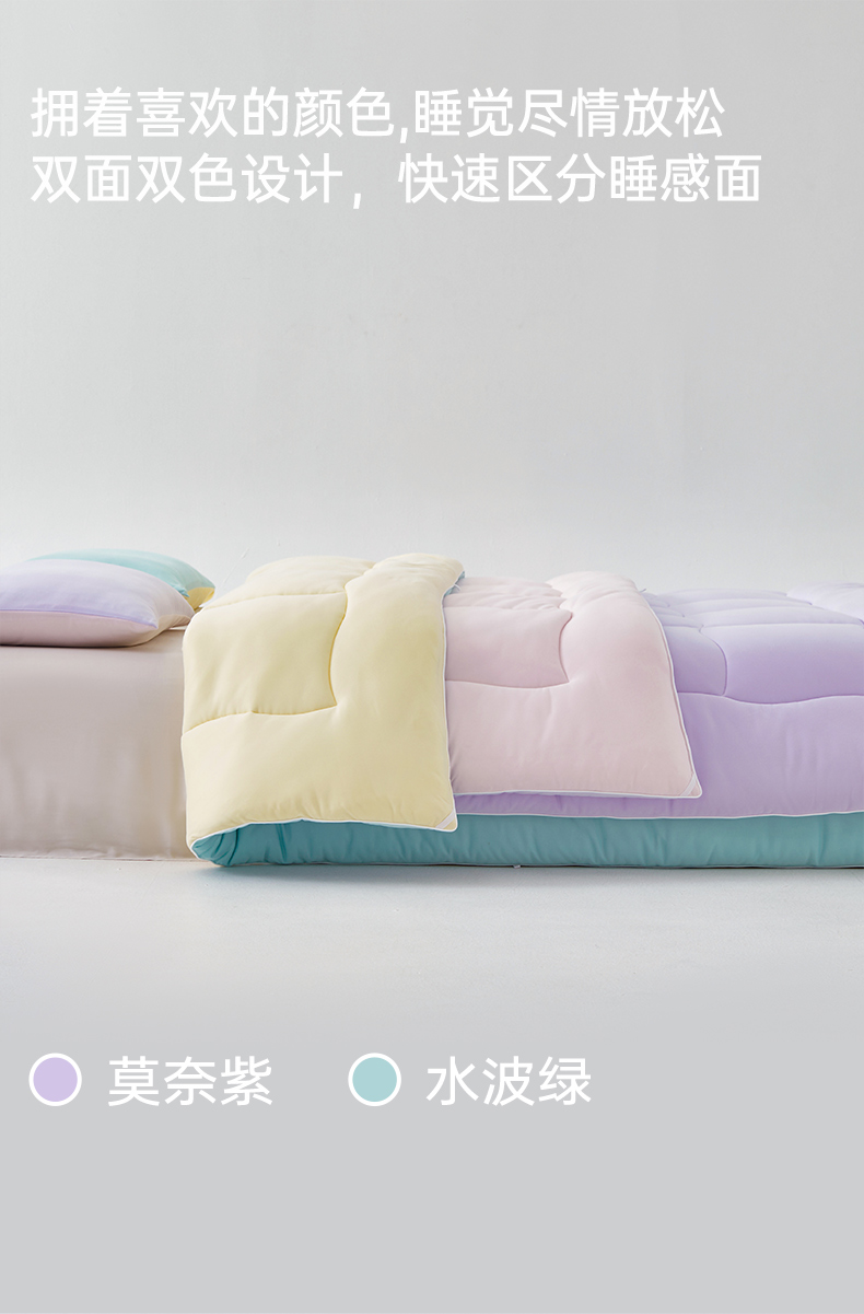 产品款式:春秋款 产品规格:150*200cm、200*230cm、220*240cm 产品净重:1.5kg、2.2kg、2.5kg; 外箱毛重:2.51kg、3.26kg、3.59kg 外箱尺寸:春秋被:260*260*530mm 产品颜色:水波绿/莫奈紫 1.采用密度高纱线细的针织面料工艺,颠覆传统针织面料手感,柔软度超过市面上95%的被子 2.科学配比大豆纤维填充物,针织面料工艺打造柔软滑糯,蓬松睡不扁 3.定位衔缝工艺结合固定面料填充平整贴合,速热锁温 4.天然大豆纤维填充,加乘针织面料工艺吸湿透气,婴儿也能贴肤睡