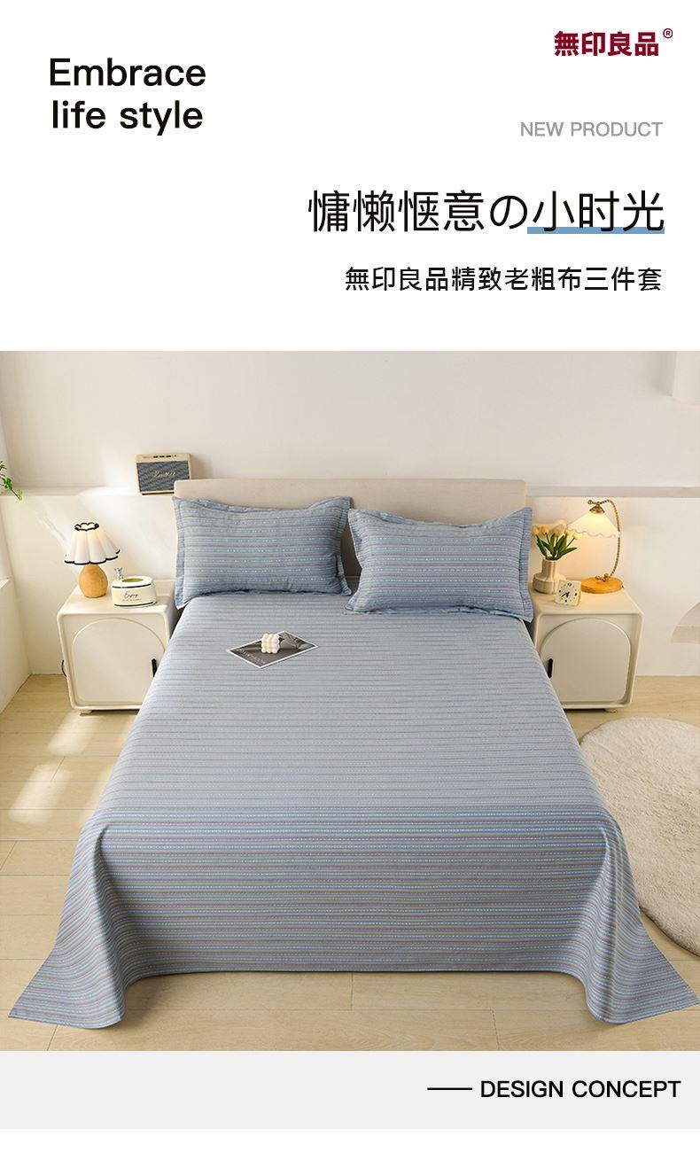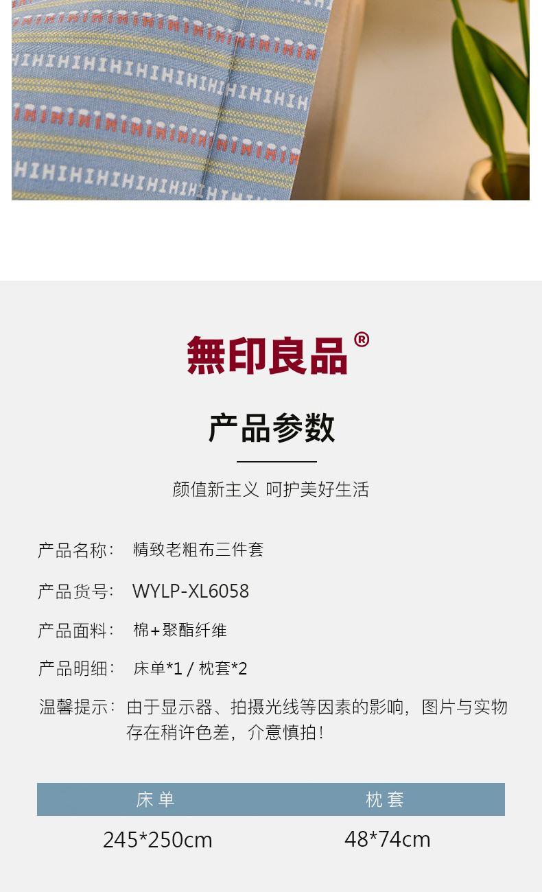 规 格:床单:245×250cm*1 枕套:48×74*2 面 料:30%棉/70%聚酯纤维 “無印良品”大染无印,优良品质的产品是年轻人喜欢的,“無印”设计, 优雅 , 质朴 , 自然 , 是無印良品的初心与追求。让体验更舒适。享受简约健康生活,走进無印,上善若水,大爱无疆,创新让生活更精彩。