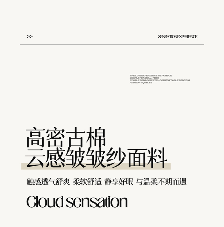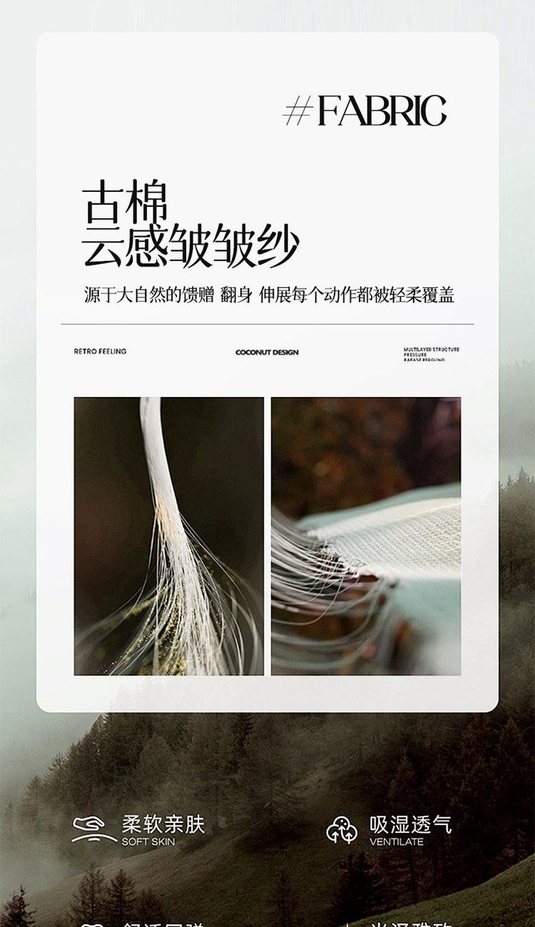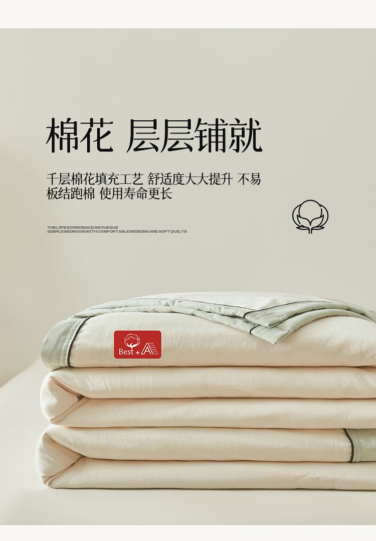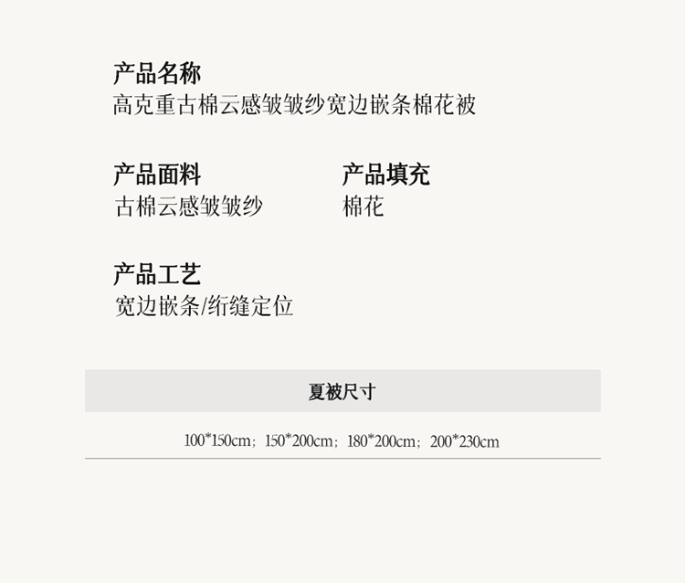 1:新款高克重古棉云感皱皱纱宽边嵌条棉花被 2:只安级纱山料 触感透气舒爽 柔软舒适静享好眠与温柔不期而遇 3:新疆棉花填充高弹蓬松更舒适。 裹紧棉花的怀抱呼吸着棉花吸收的每一缕自然阳光 尺寸:180*200cm 填充:棉花 工艺:绗缝+麻绳 包装:彩盒