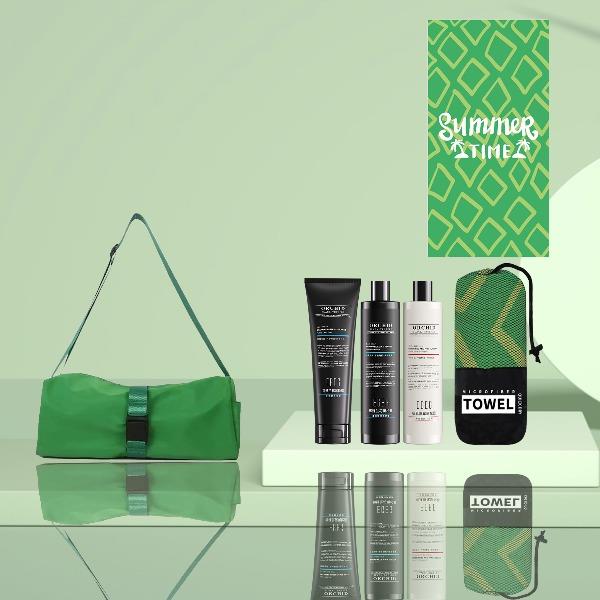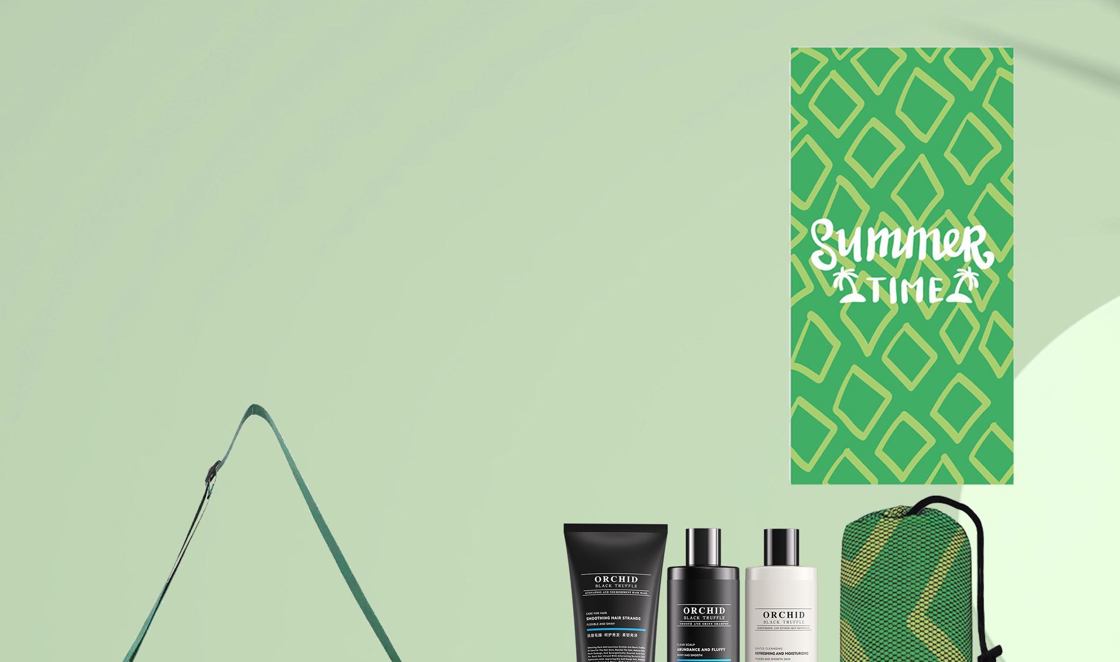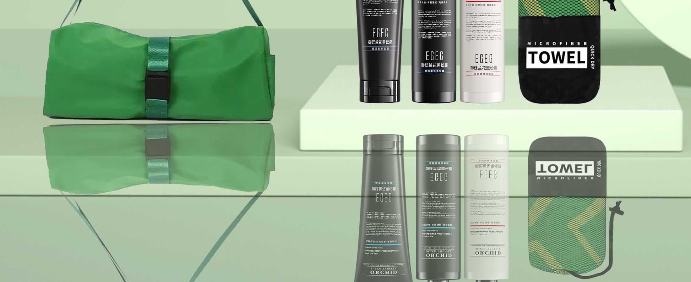 型号:DY-FS03 条码:6974230748459 超薄速干双面绒浴巾:展开尺寸0.8*1.6M,圆形网袋包装8.5*23cm EGEG御廷兰花黑松露赋活韧养发膜:250g EGEG御廷兰花黑松露沁润嫩肤沐浴露:420ml EGEG御廷兰花黑松露柔顺亮泽洗发露:420ml 牛津背包:尺寸35.5*35.5*14cm,150g,颜色黑蓝橙黄红绿(默认绿色) 装 箱:50套 /箱