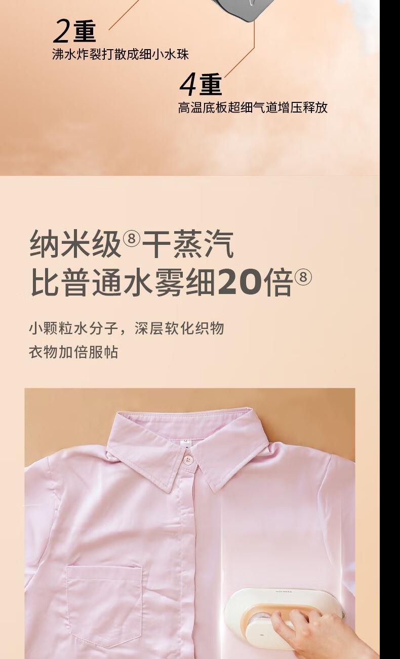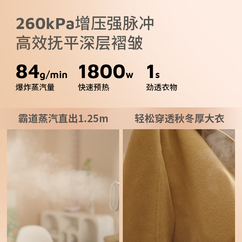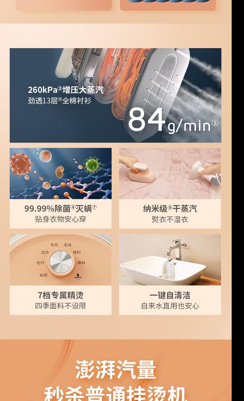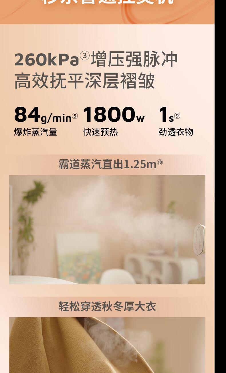 1、1s劲透衣物,40g/min持续蒸汽量,84g/min爆炸蒸汽量 2、260kpa增压强脉冲高效抚平深层褶皱 3、1800W,35s快速预热 5、XXL金属大面板,除皱效率upup 6、7档专属精烫,NTC温控技术,四季面料不设限 7、纳米级“干蒸汽”,熨烫不湿衣 8、一键自清洗,自来水直用也放心