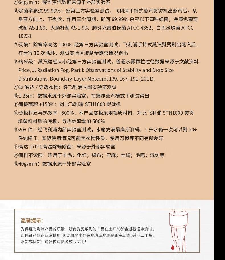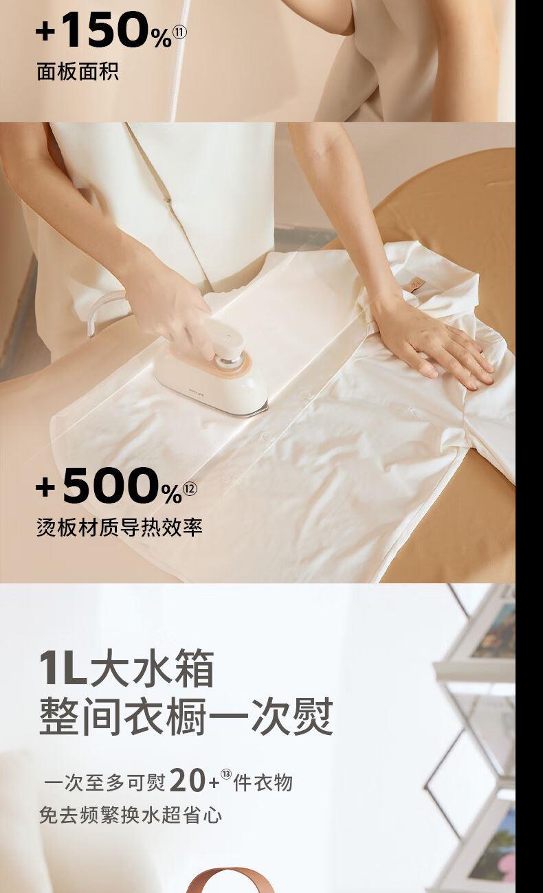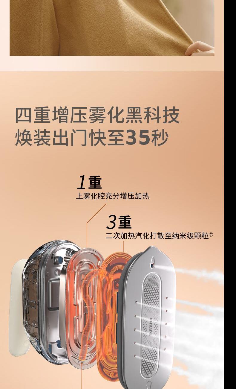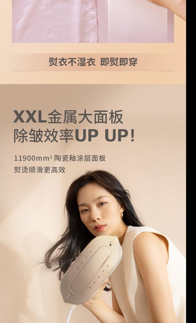 1、1s劲透衣物,40g/min持续蒸汽量,84g/min爆炸蒸汽量 2、260kpa增压强脉冲高效抚平深层褶皱 3、1800W,35s快速预热 5、XXL金属大面板,除皱效率upup 6、7档专属精烫,NTC温控技术,四季面料不设限 7、纳米级“干蒸汽”,熨烫不湿衣 8、一键自清洗,自来水直用也放心