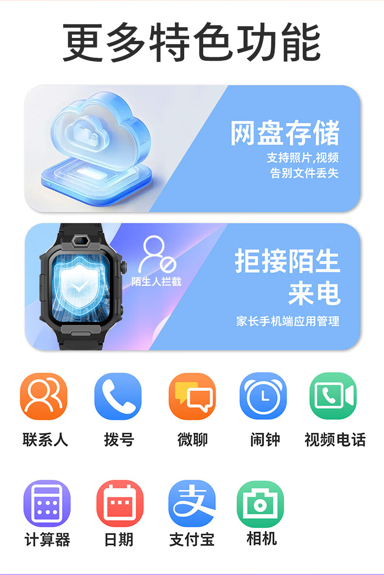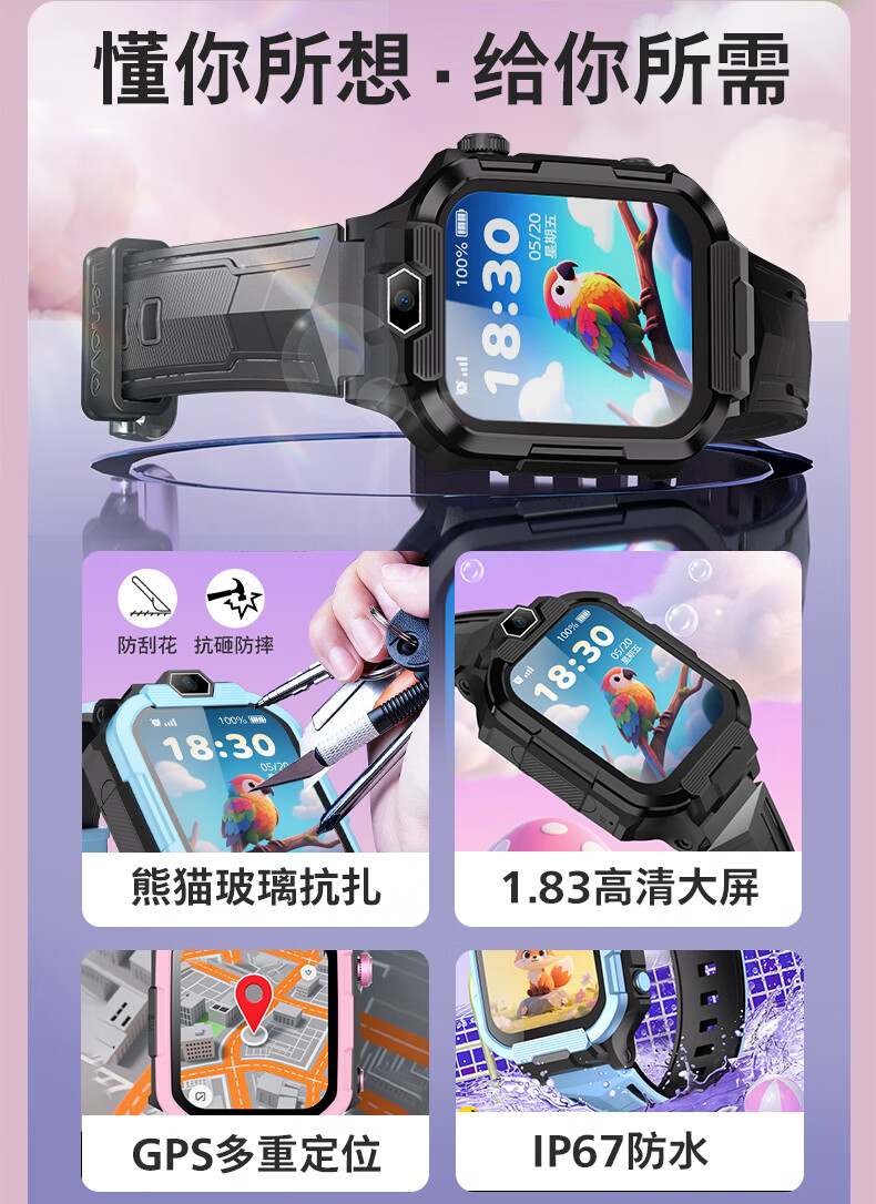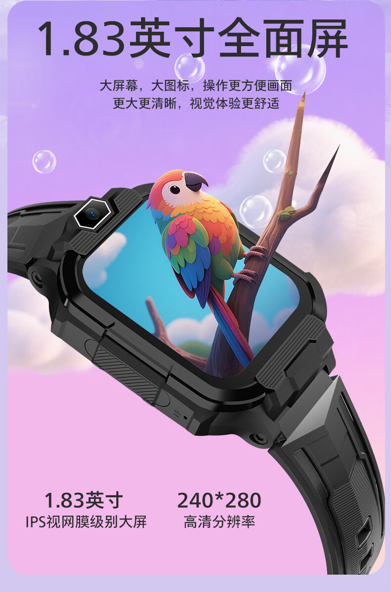屏幕尺寸:1.83英寸LCD 240*280 使用时间:1-3天 充电方式:磁吸充电 电池容量:800mAh 智能手表尺寸(mm):53*42*14.5mm, 表带展开后总长252mm 产品净重:44.78g 裸机 APP:联享守护 防水等级:IP67 像素:前置摄像头8万像素 产品清单:手表+充电线+说明书+包装盒