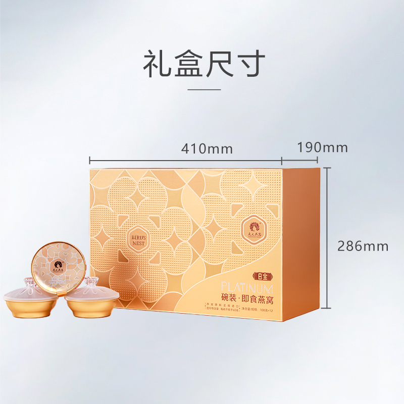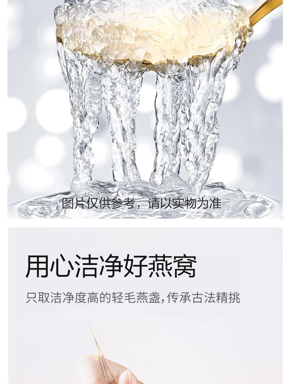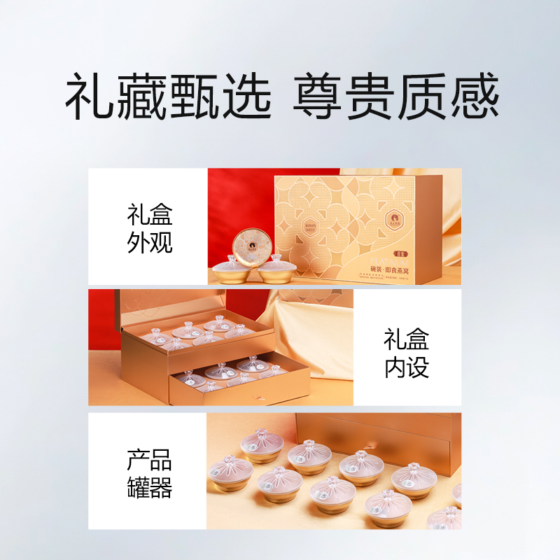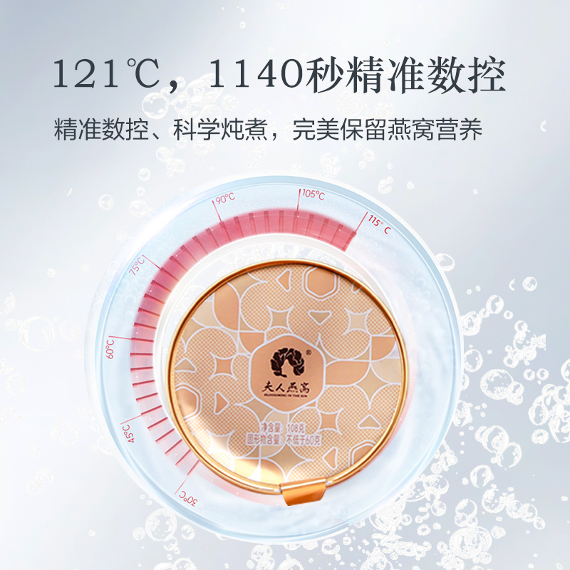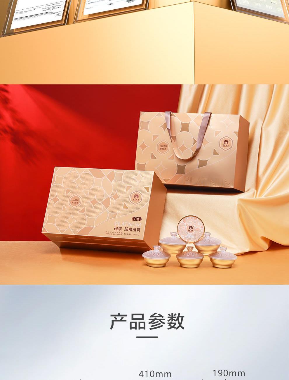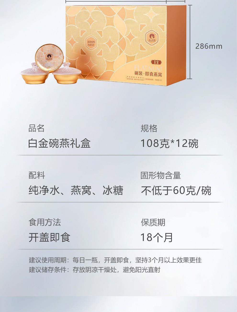 规格:1296克(108克*12碗)、每碗投燕量:3.8克 卖点: 燕窝原料精选马来西亚、印尼森林雨季燕盏,洁净度更高,泡发率更好。121℃,1140秒数控,科学炖煮,保留燕窝营养,口感细腻爽滑。坚持 0添加 0色素 0防腐剂,孕妈和宝宝也可以放心享用。一瓶一码可溯源,开盖即食,开启滋补。