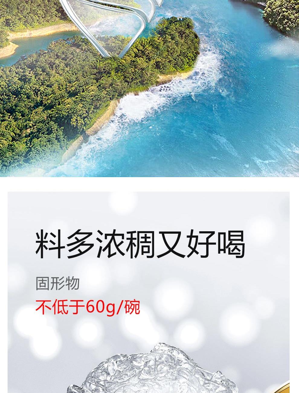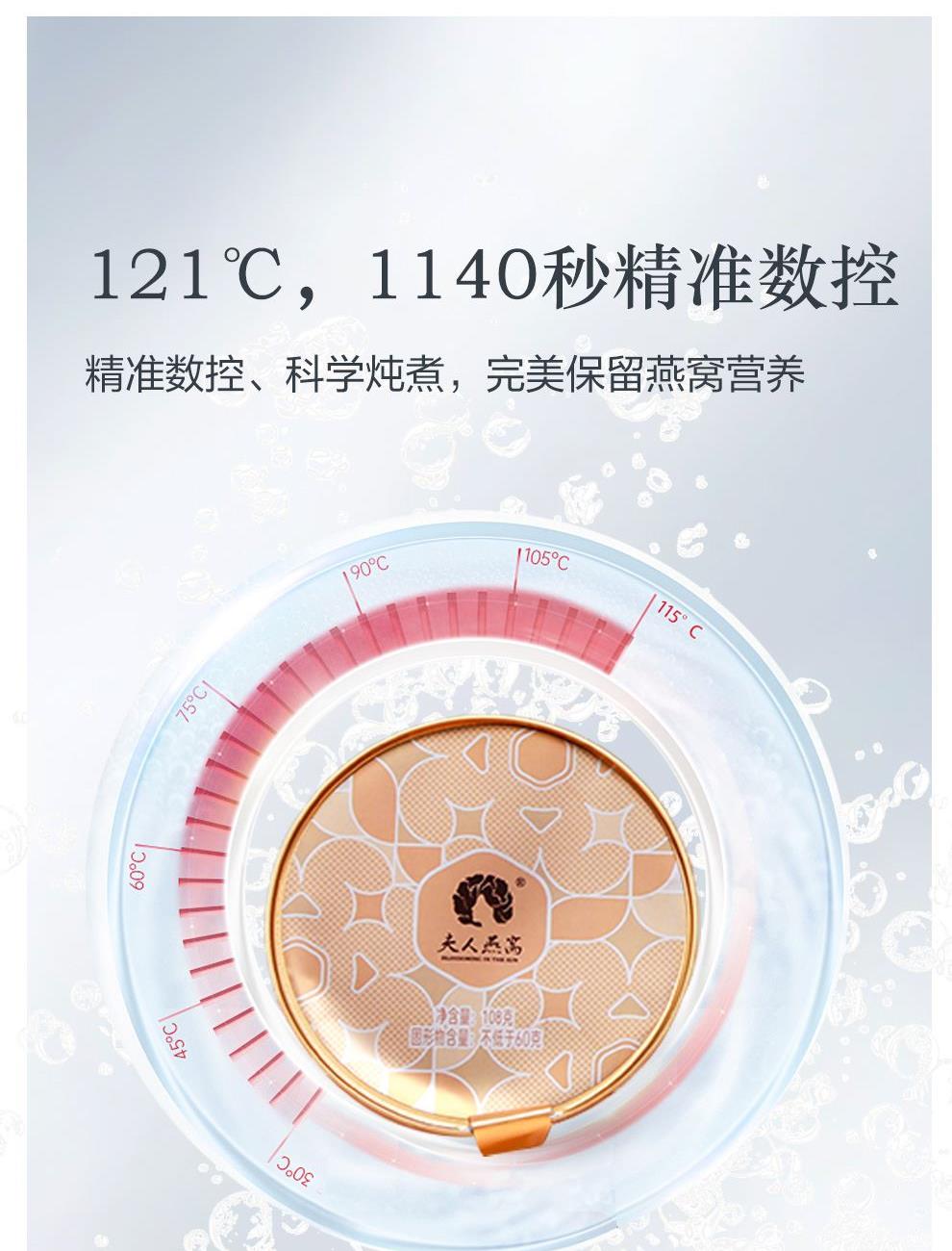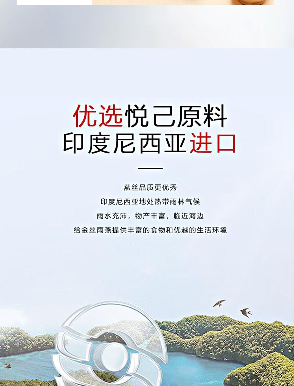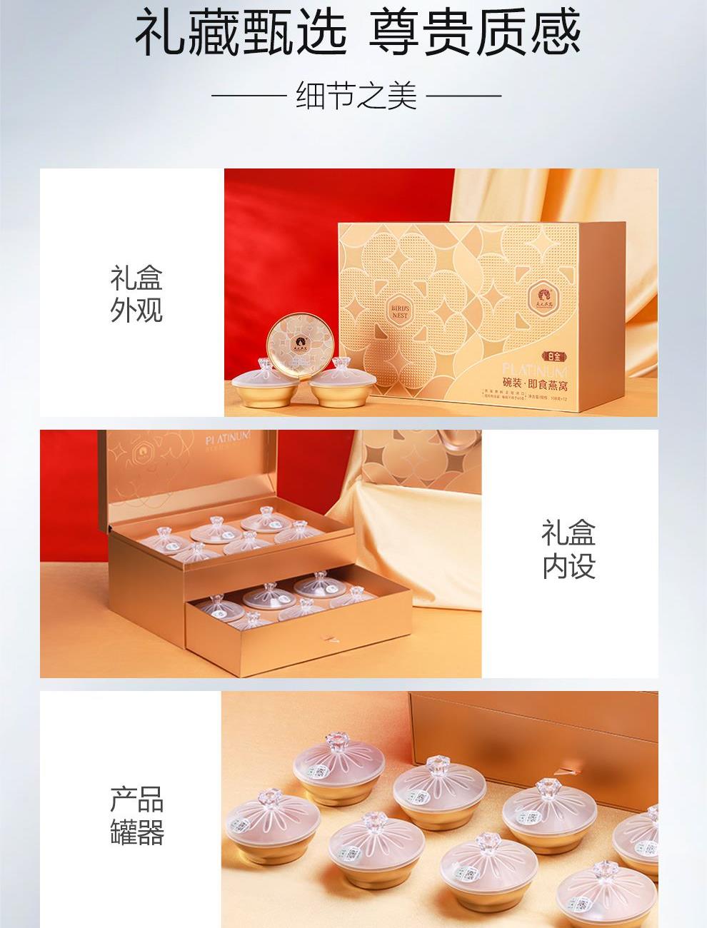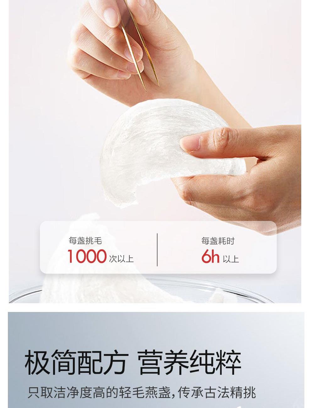 规格:1296克(108克*12碗)、每碗投燕量:3.8克 卖点: 燕窝原料精选马来西亚、印尼森林雨季燕盏,洁净度更高,泡发率更好。121℃,1140秒数控,科学炖煮,保留燕窝营养,口感细腻爽滑。坚持 0添加 0色素 0防腐剂,孕妈和宝宝也可以放心享用。一瓶一码可溯源,开盖即食,开启滋补。
