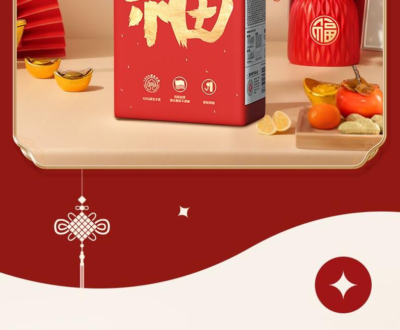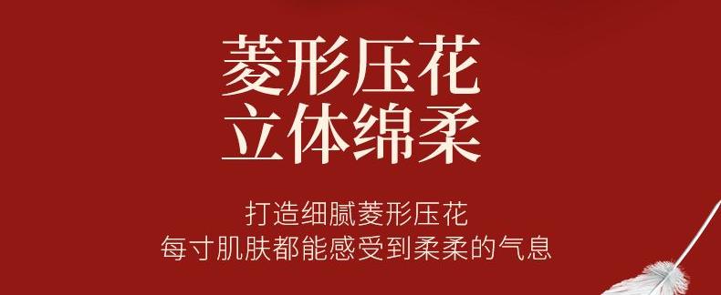 销售规格:175mm*175mm/1280张*320抽(4层/抽)3提/袋 香型:无香 主要原料:原生木浆 保质期:3年 1、原生木浆 进口品质 源自北欧天然森林跨越千里的取材,蒸煮萃取而成自然安心,绵感呵护; 2、轻盈压花 臻享品质 用心打造细腻菱形压花纹触得到的质感让你的肌肤值得倍加呵护; 3、柔软触感 亲如肌肤 长短纤维物理方式科学配比颠覆传统纸巾手感柔触感升级,柔上加柔造出绵韧的亲肤触感;4、遇水柔韧 擦拭无屑 拒绝平庸实力派展示,多面体附身遇水柔韧性更强,擦拭不易掉屑湿水可做洁面巾; 5、医护级产品认证: 产品通过了严格的医护级评测流程,多项指标均高于标准,为产品提供专业的品质保障。
