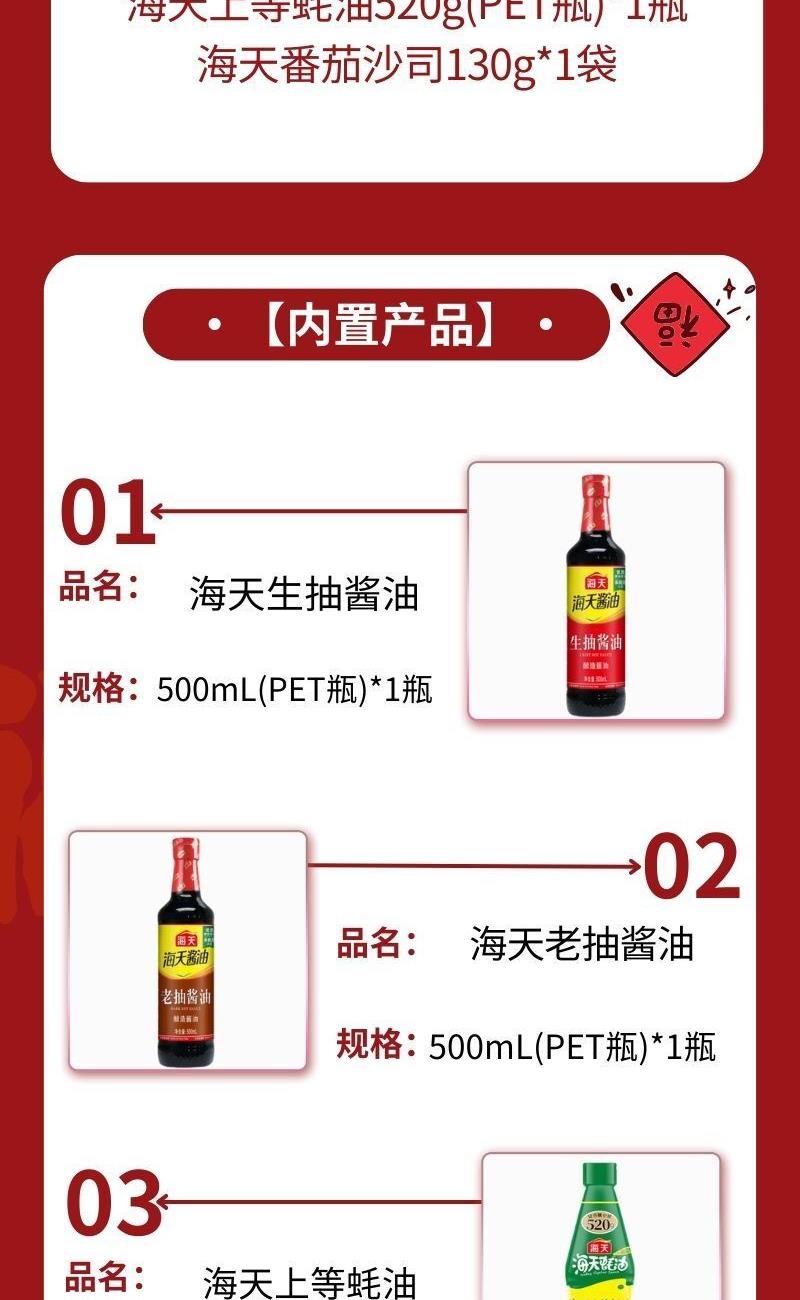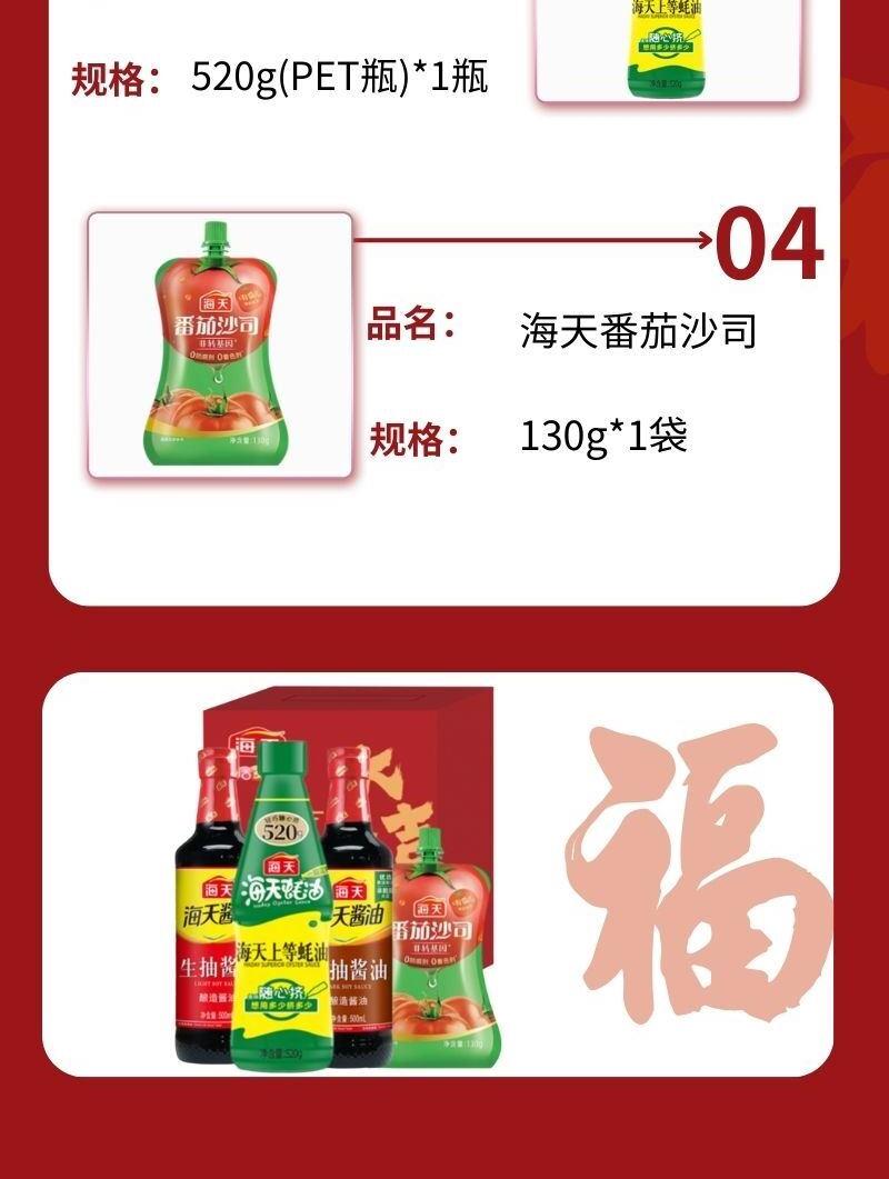 配置: 海天生抽酱油500mL(PET瓶)*1瓶 海天老抽酱油500mL(PET瓶)*1瓶 海天上等蚝油520g(PET瓶)*1瓶 海天番茄沙司130g*1袋 卖点: 可选产品丰富多样,礼箱随心组合,多种价位因需而定,充分满足各种送礼需求,是商务送礼、单位福利的用心之选。