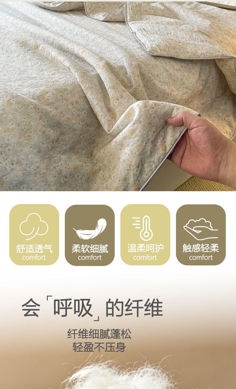 产品参数: 面料:10 0%聚酯纤维 填充:10 0%聚酯纤维 重量:1300克 尺寸: 180*220cm 产品等级:合格品 产品卖点: 采用数码印染,色彩更丰富,不易褪色美观大方,不含甲醇,绿色健康更环保