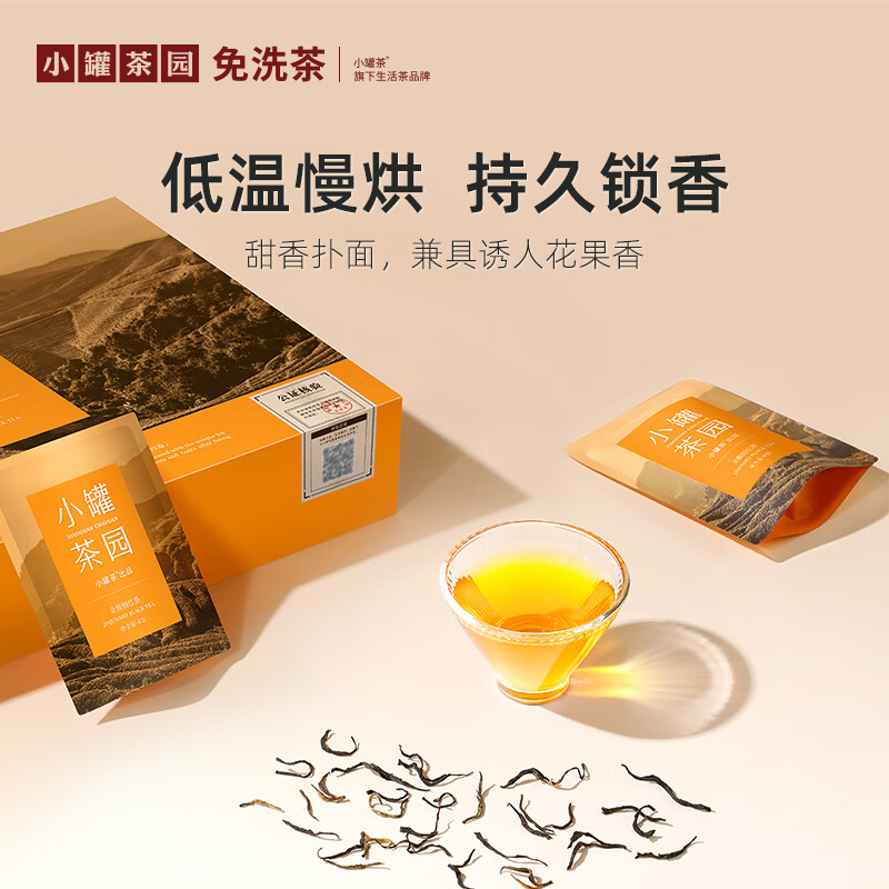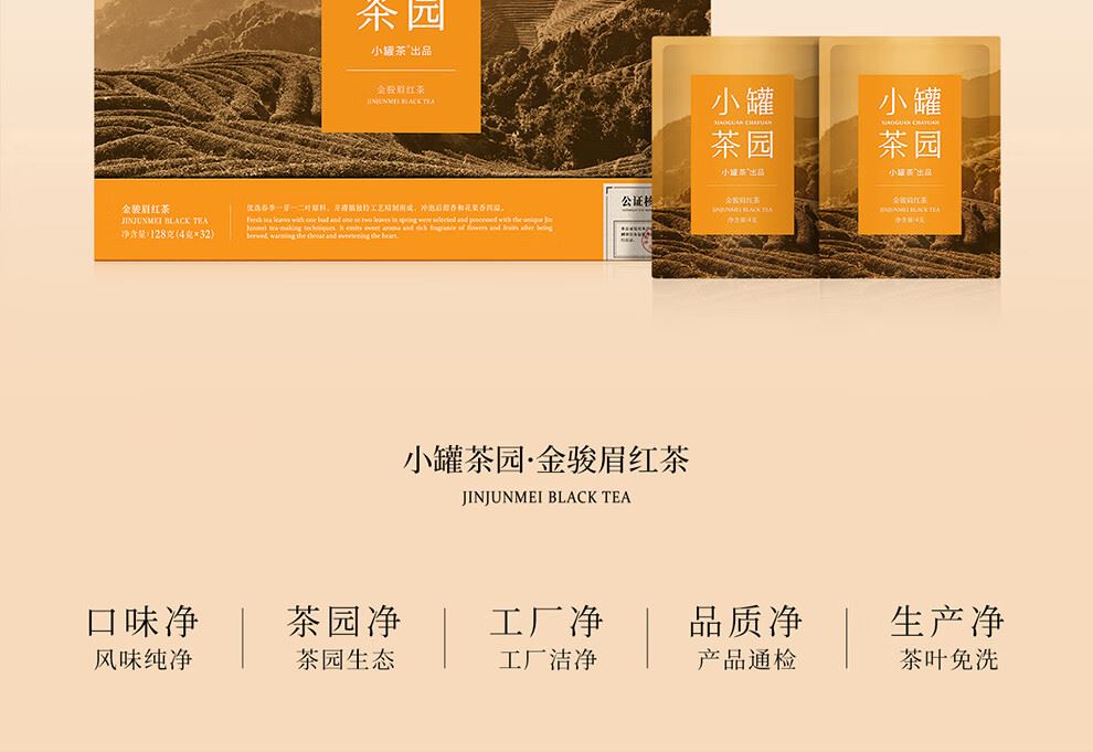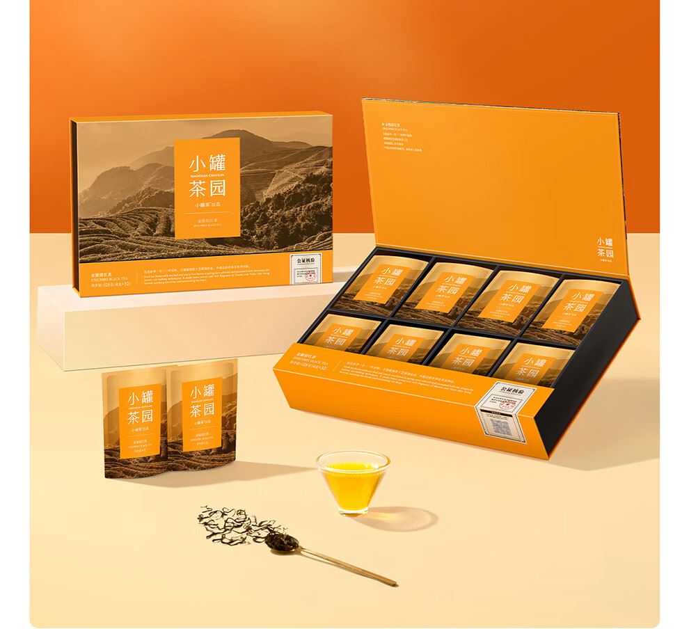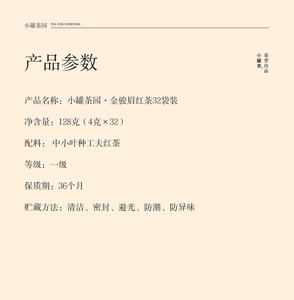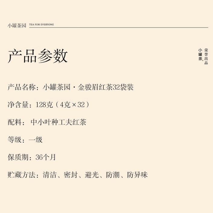 小罐茶园 x 免洗茶(小罐茶旗下生活茶品pai) 产品由公证处公证(111项安全检测+12道洁净工序+极简包装) 小罐茶园 x 敢保真(产地保真、年份保真、安全保真) 花果甜香沁心扉 喝出向往的生活 小罐茶园·金骏眉红茶(32袋装) 净含量:128克(4克x32) 春茶原料 | 香甜好喝 | 一袋一泡 花果香,琥珀汤 香甜好喝四季宜饮 配料:中小叶种工夫红茶 等级:一级 保质期:36个月 出品方:北京小罐茶业有限公司