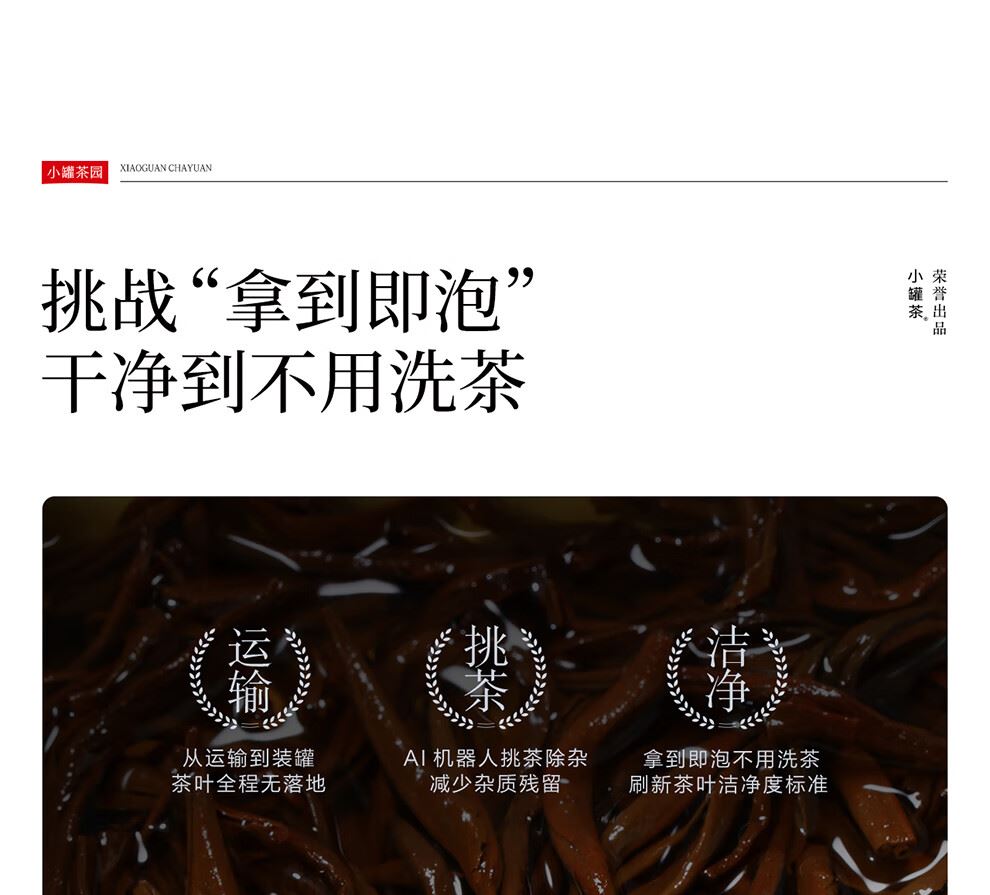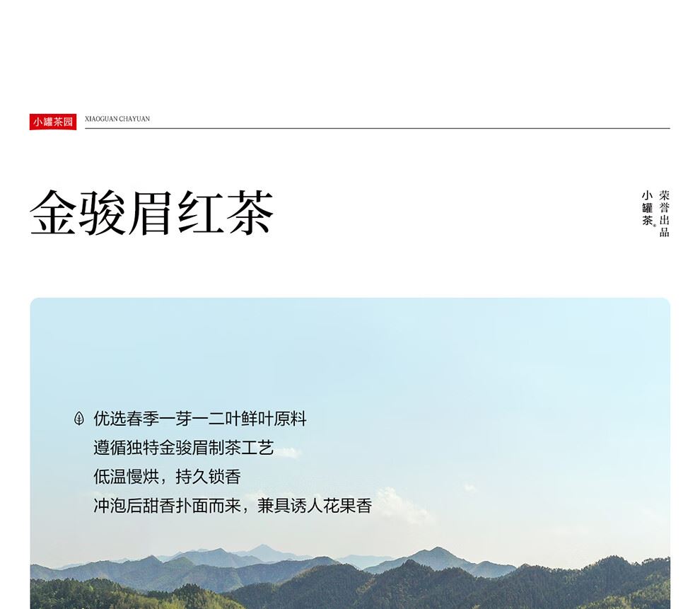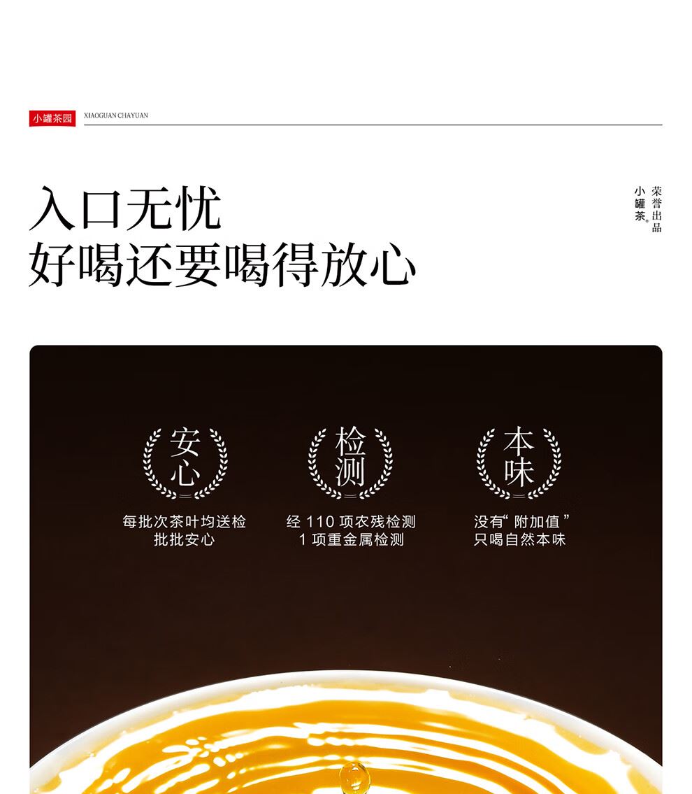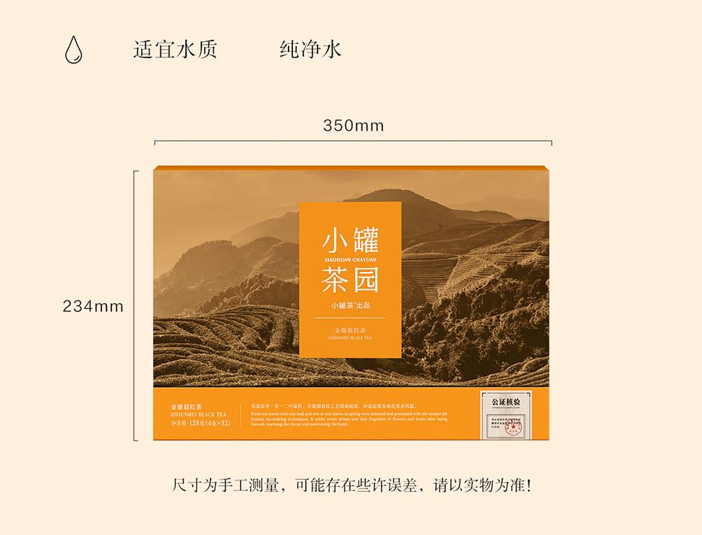 小罐茶园 x 免洗茶(小罐茶旗下生活茶品pai) 产品由公证处公证(111项安全检测+12道洁净工序+极简包装) 小罐茶园 x 敢保真(产地保真、年份保真、安全保真) 花果甜香沁心扉 喝出向往的生活 小罐茶园·金骏眉红茶(32袋装) 净含量:128克(4克x32) 春茶原料 | 香甜好喝 | 一袋一泡 花果香,琥珀汤 香甜好喝四季宜饮 配料:中小叶种工夫红茶 等级:一级 保质期:36个月 出品方:北京小罐茶业有限公司