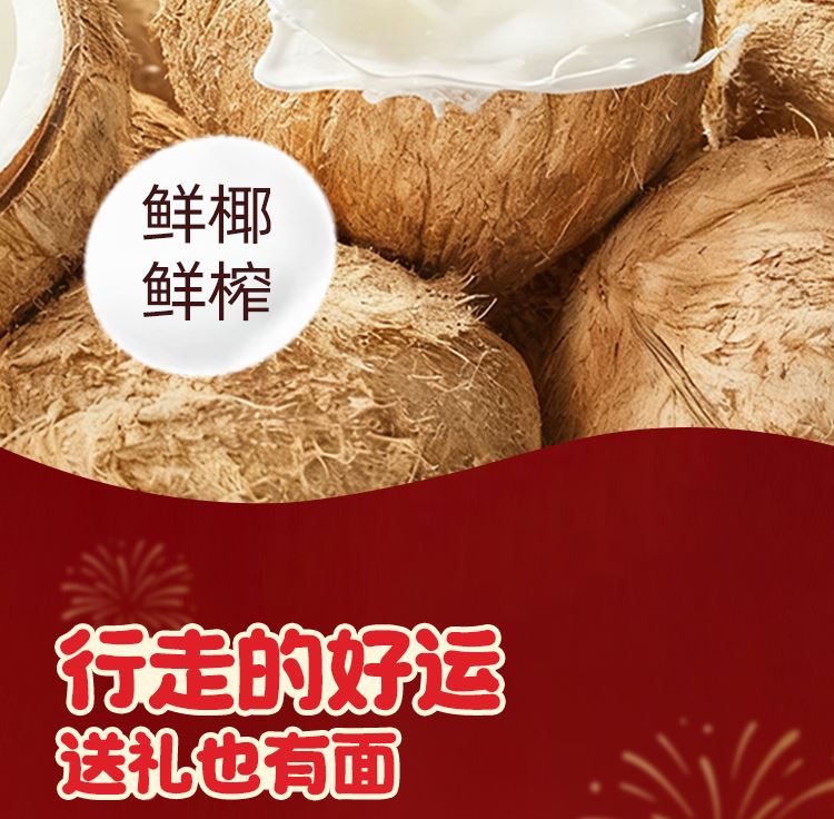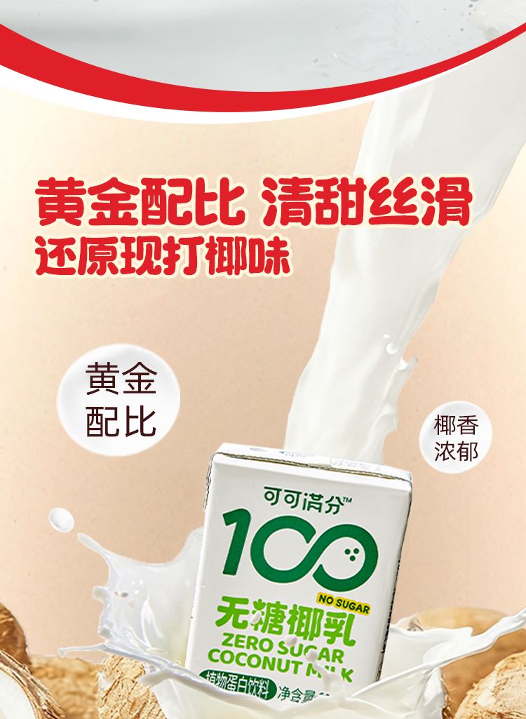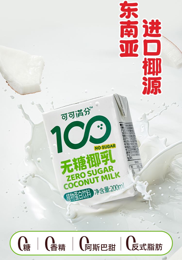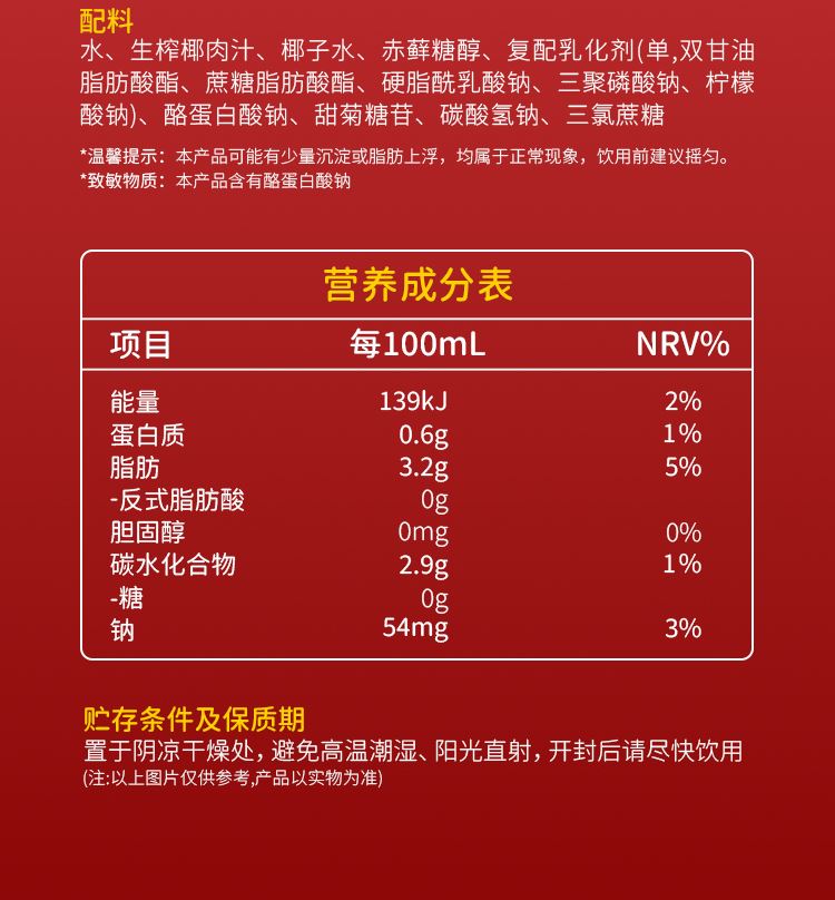 1、0白砂糖,1瓶热量<1颗苹果 2、椰肉汁:椰子水黄金配比,满分清爽 3、印尼进口香椰,还原鲜打椰味 水、生榨椰肉汁≥10%、椰子水≥6%、赤藓糖醇、酪蛋白酸钠单,双甘油脂肪酸酯、蔗糖脂肪酸酯、硬脂酰乳酸钠、三聚磷酸钠、柠檬酸钠甜菊糖苷、碳酸氢钠、三氯蔗