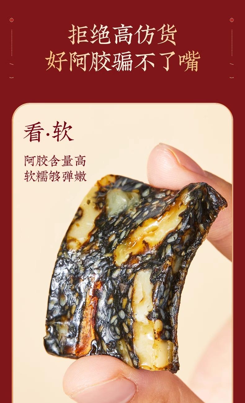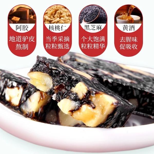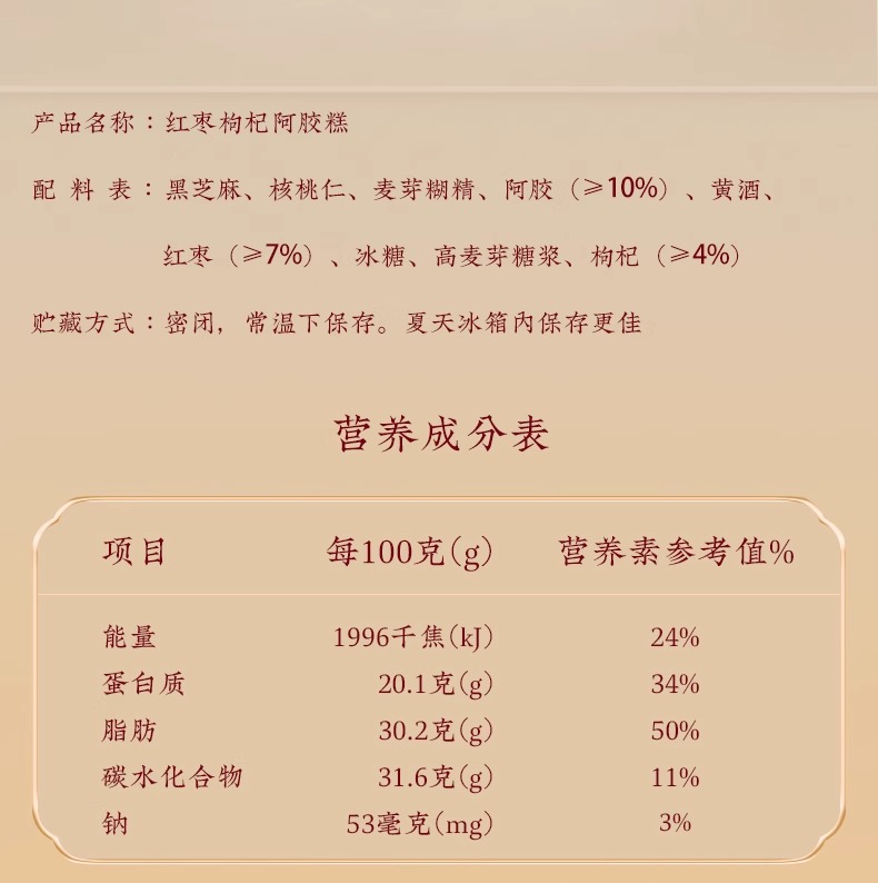 【产品】阿胶糕 保质期】12个月 【配料表】黑芝麻、核桃仁、麦芽糊精、阿胶(>10%)、黄酒、红枣(>7%)、冰糖、麦芽糖浆、枸杞(>4%)注意事项本品为小袋真空包装,若在购买后发现包装胀 气,请勿食用。 【净含量】200克(5克x40) 贮藏方法】密闭,常温下保存。夏天冷藏保存效果更佳。 食用方法】开袋即食