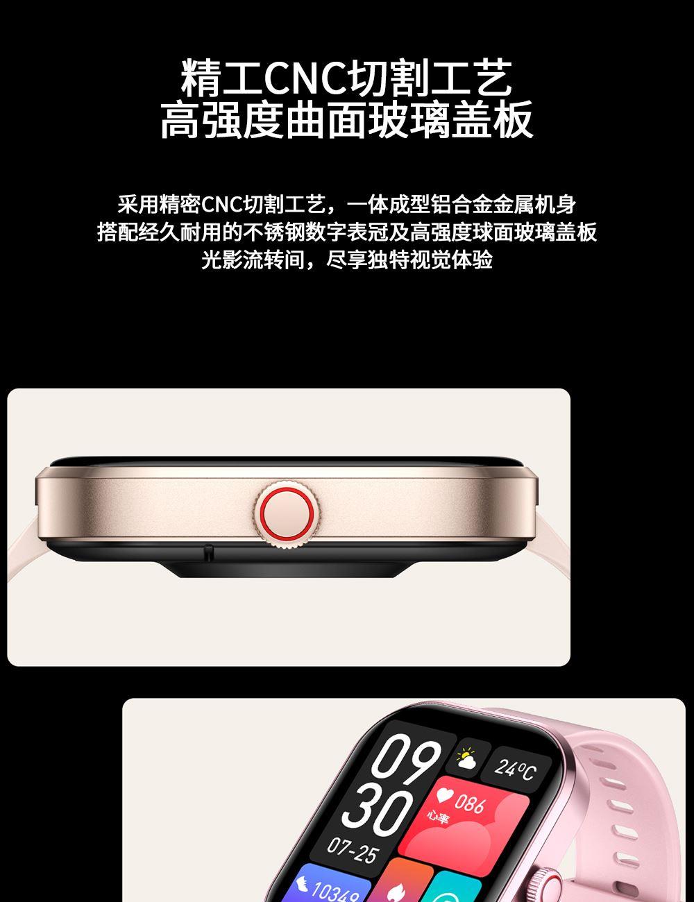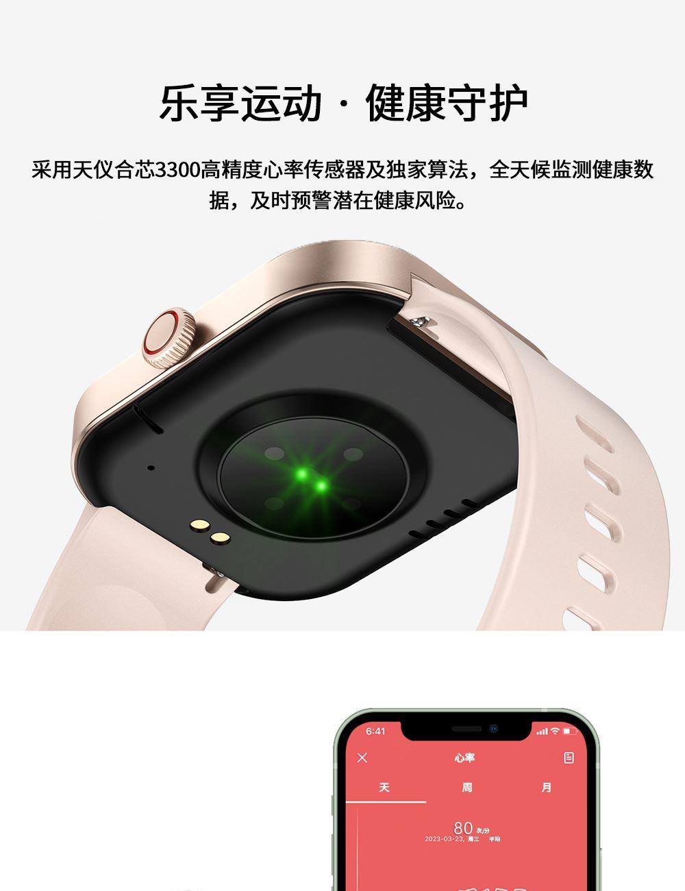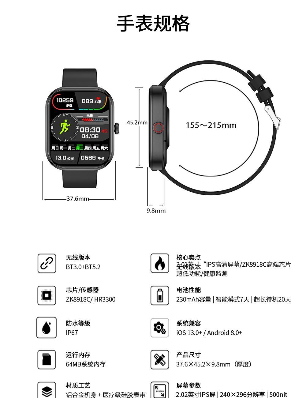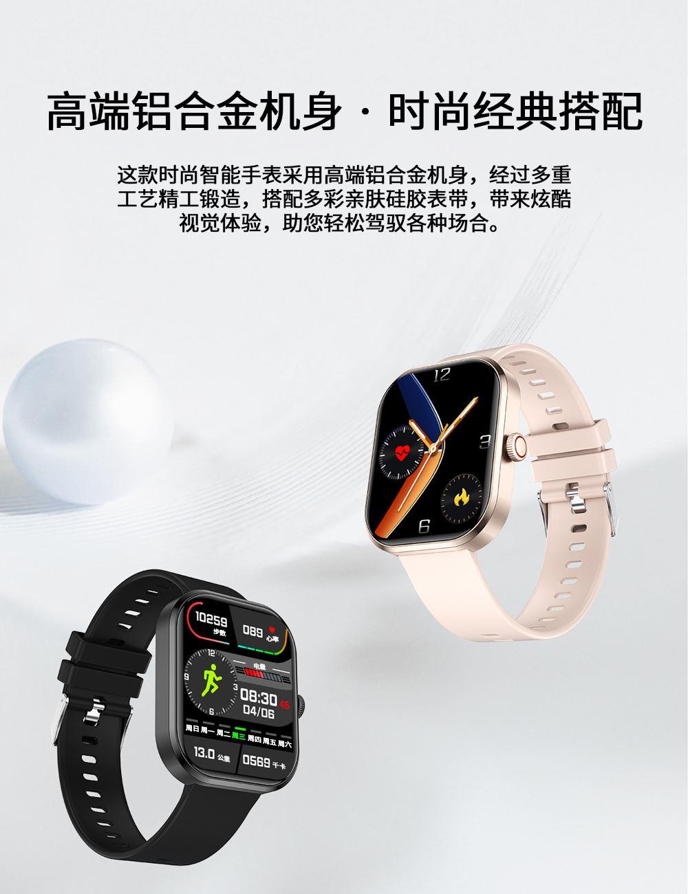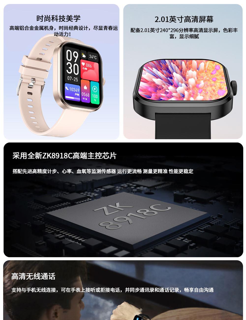 CPU:zk5610 屏幕尺寸: 2.01 inches LCD彩屏 240*286 使用时间:1-4天 充电方式:磁吸式 电池容量:180mAh 智能手表尺寸(mm):45.2*37.6*9.8mm 产品材质:上盖-玻璃,机身-锌合金,表带-防静电硅胶 产品净重:裸机(约) APP: HryFine 防水等级:IP67 产品清单:手表+充电线+说明书+包装盒 2.01 inches LCD彩屏 240*286、表盘市场、运动模式、24国语言、蓝牙通话、喝水提醒、睡眠监测、来电提醒、消息提醒、呼吸训练、心率、血压、血氧、久坐提醒、闹钟提醒、秒表、查找手环、抬腕亮屏、天气推送、蓝牙音乐 BWG21A黑色 BWG21B金色 BWG21C粉色