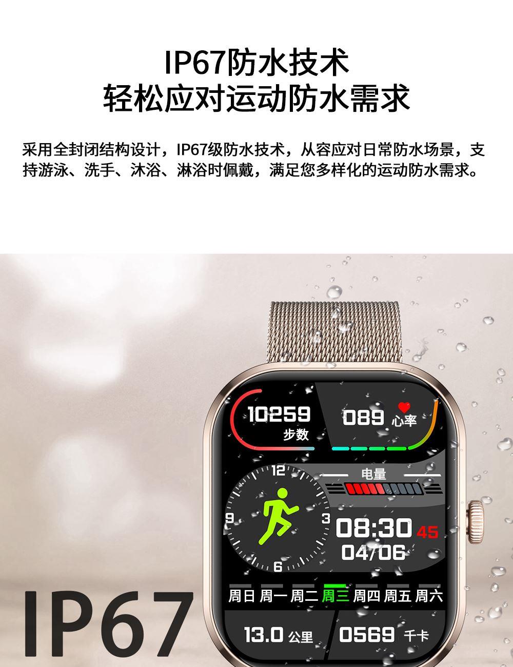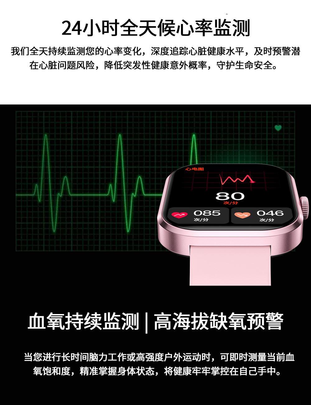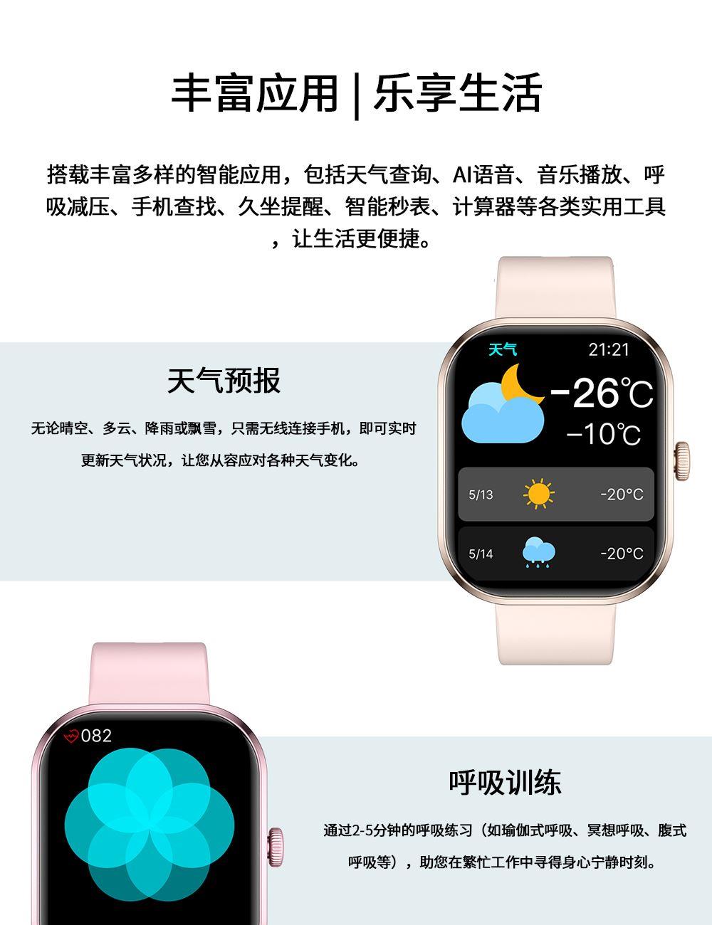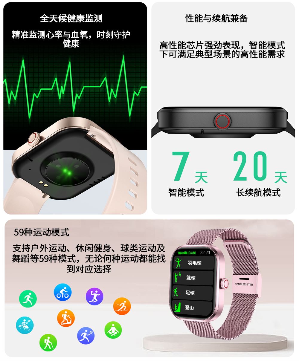 CPU:zk5610 屏幕尺寸: 2.01 inches LCD彩屏 240*286 使用时间:1-4天 充电方式:磁吸式 电池容量:180mAh 智能手表尺寸(mm):45.2*37.6*9.8mm 产品材质:上盖-玻璃,机身-锌合金,表带-防静电硅胶 产品净重:裸机(约) APP: HryFine 防水等级:IP67 产品清单:手表+充电线+说明书+包装盒 2.01 inches LCD彩屏 240*286、表盘市场、运动模式、24国语言、蓝牙通话、喝水提醒、睡眠监测、来电提醒、消息提醒、呼吸训练、心率、血压、血氧、久坐提醒、闹钟提醒、秒表、查找手环、抬腕亮屏、天气推送、蓝牙音乐 BWG21A黑色 BWG21B金色 BWG21C粉色