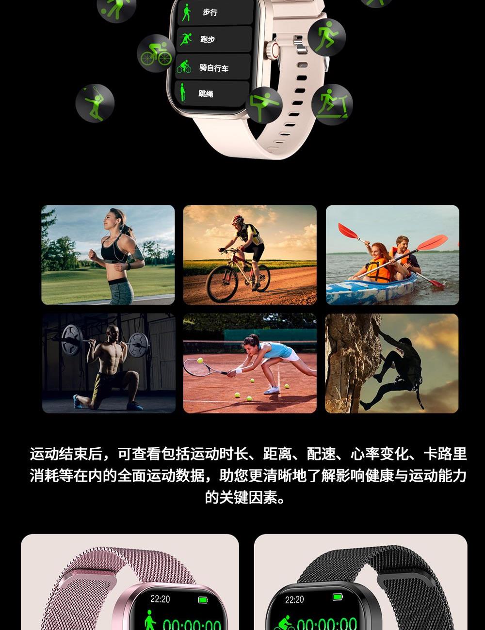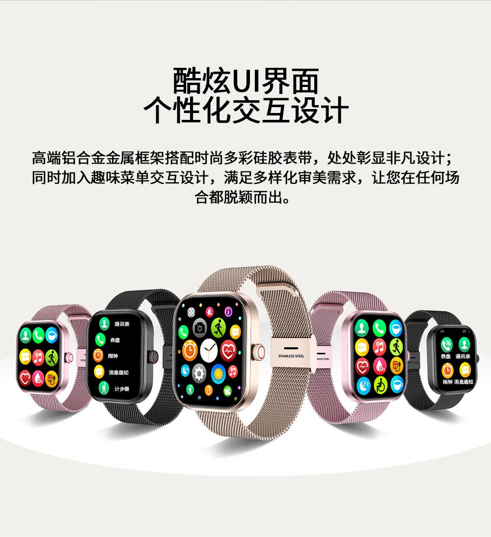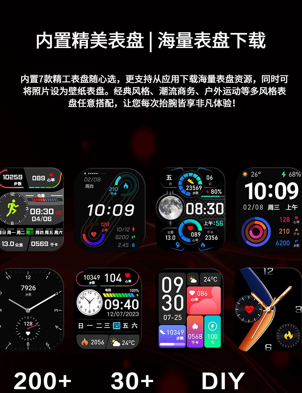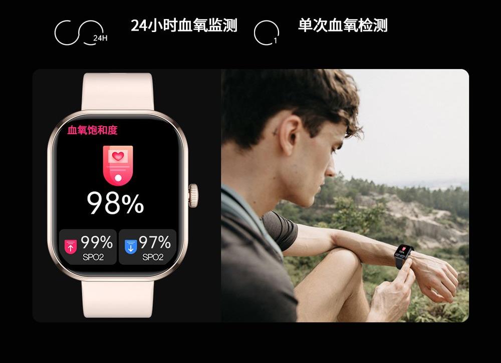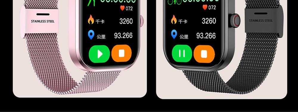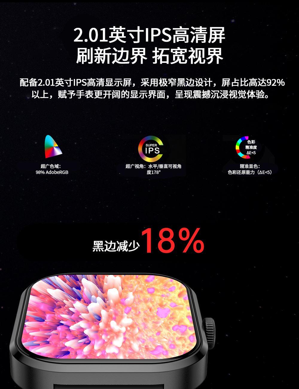 CPU:zk5610 屏幕尺寸: 2.01 inches LCD彩屏 240*286 使用时间:1-4天 充电方式:磁吸式 电池容量:180mAh 智能手表尺寸(mm):45.2*37.6*9.8mm 产品材质:上盖-玻璃,机身-锌合金,表带-防静电硅胶 产品净重:裸机(约) APP: HryFine 防水等级:IP67 产品清单:手表+充电线+说明书+包装盒 2.01 inches LCD彩屏 240*286、表盘市场、运动模式、24国语言、蓝牙通话、喝水提醒、睡眠监测、来电提醒、消息提醒、呼吸训练、心率、血压、血氧、久坐提醒、闹钟提醒、秒表、查找手环、抬腕亮屏、天气推送、蓝牙音乐 BWG21A黑色 BWG21B金色 BWG21C粉色