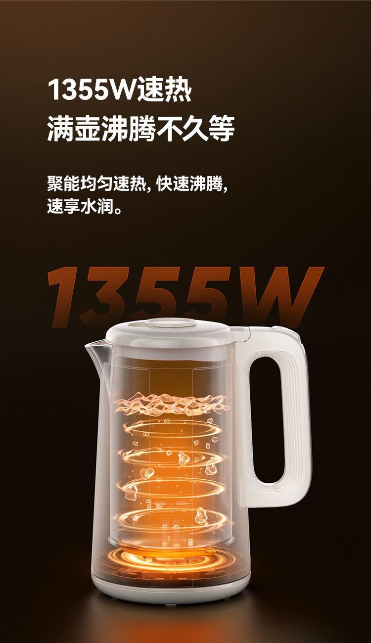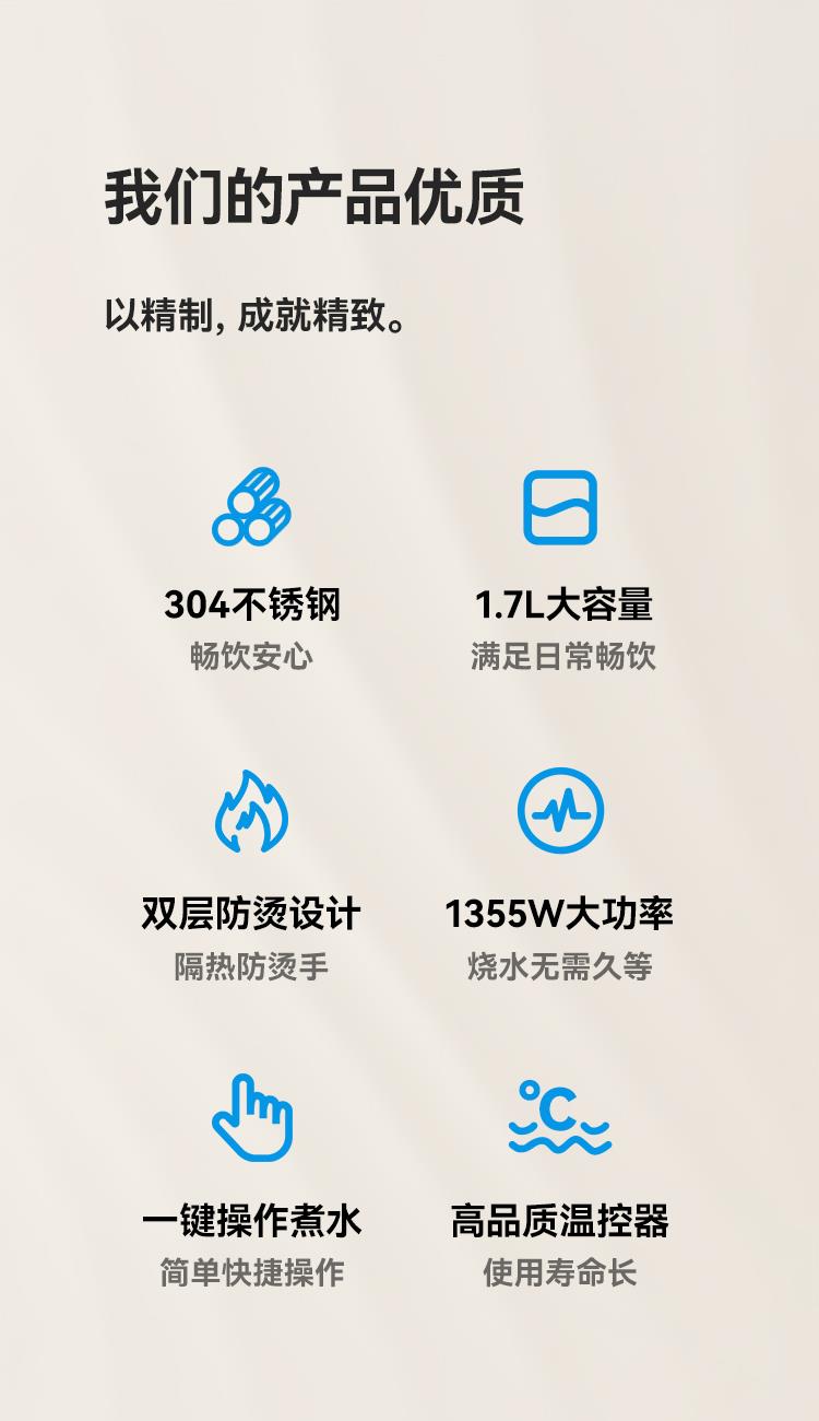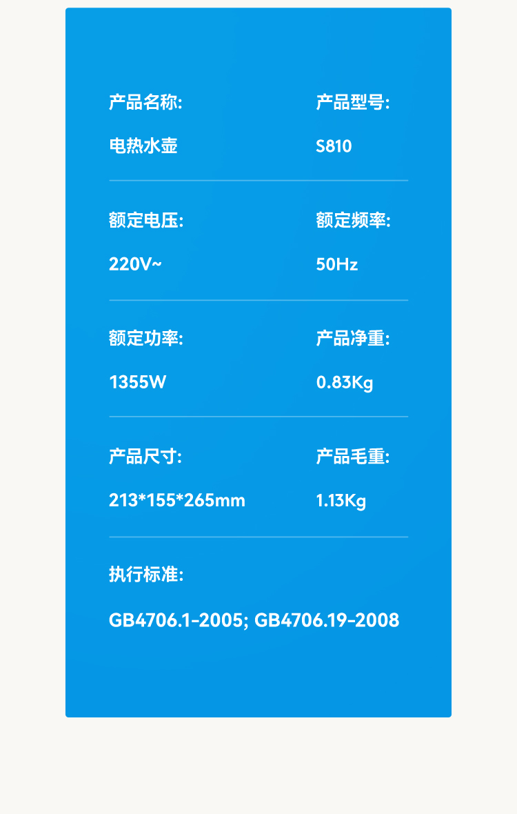 额定电压:220V~ 额定功率:1355W 额定频率:50Hz 额定容量:1.7L 产品净重:0.83kg 产品尺寸:213*155*265mm 1、内置灵敏温控器; 2、1355W大功率; 3、304不锈钢内胆; 4、烧开自动断电; 5、1.7L大容量; 6、大口径壶口;7、分离式壶盖