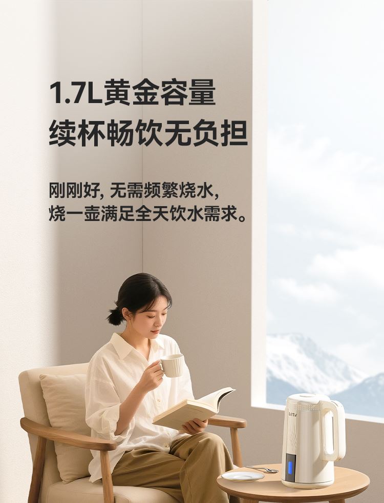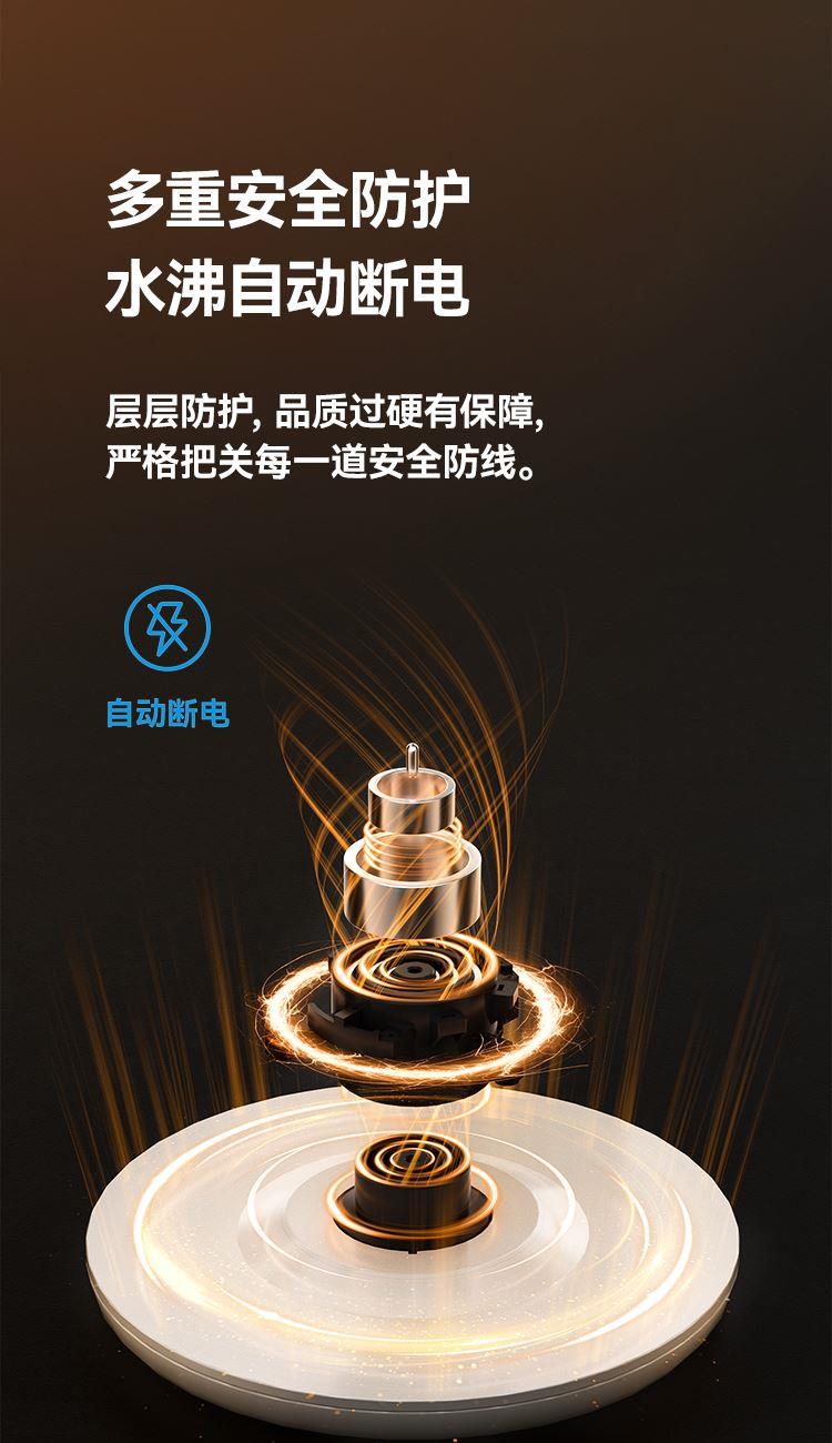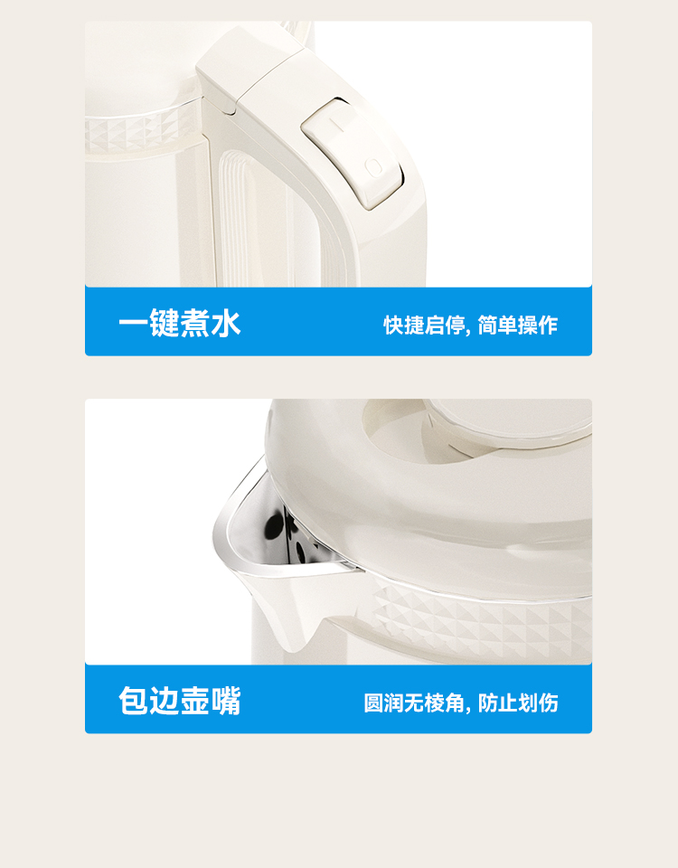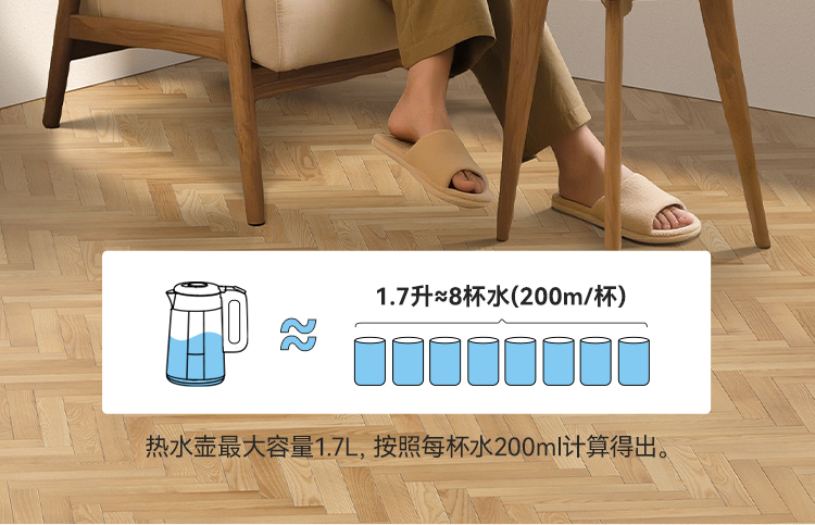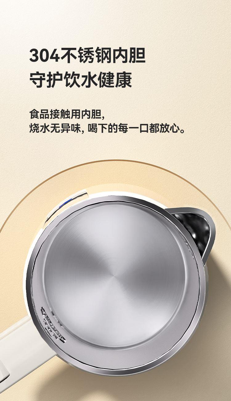 额定电压:220V~ 额定功率:1355W 额定频率:50Hz 额定容量:1.7L 产品净重:0.83kg 产品尺寸:213*155*265mm 1、内置灵敏温控器; 2、1355W大功率; 3、304不锈钢内胆; 4、烧开自动断电; 5、1.7L大容量; 6、大口径壶口;7、分离式壶盖