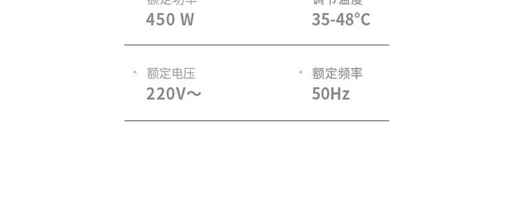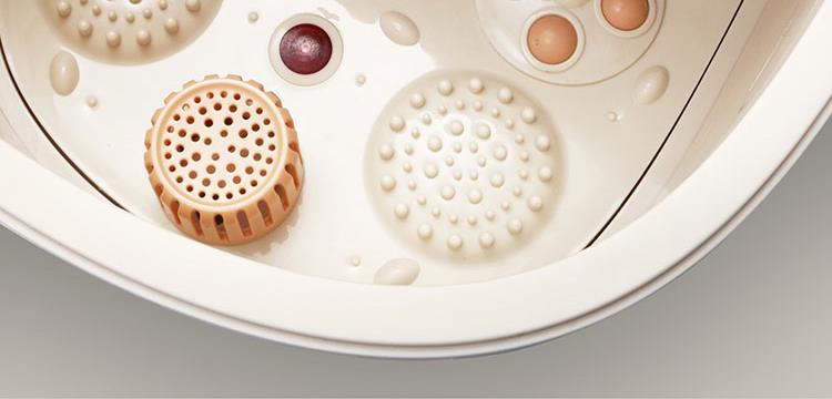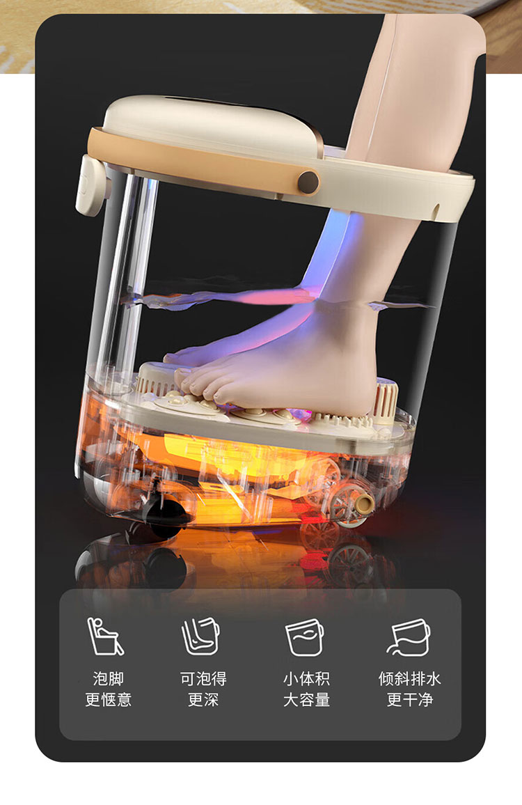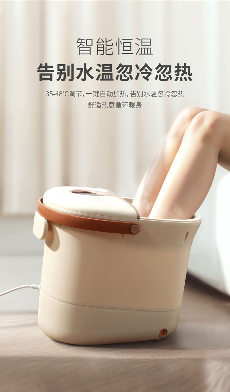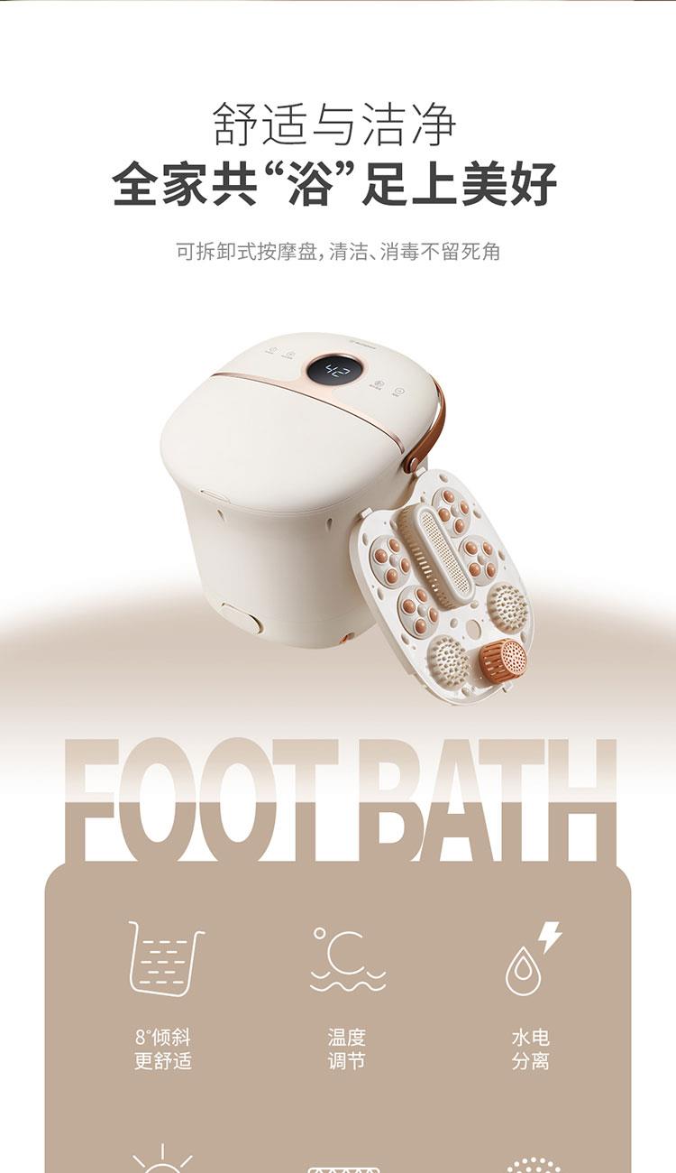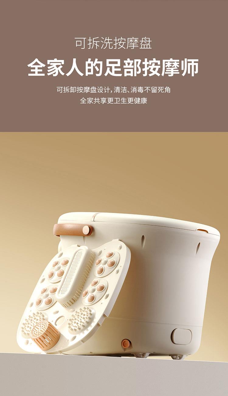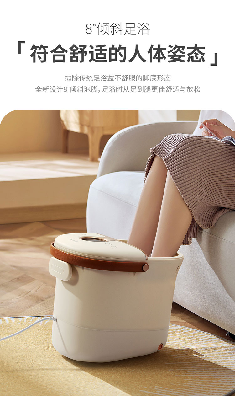 产品规格: 额定电压:220V~50Hz 额定功率:450W 产品容量:12L 主要材质:PP+ABS 加热温度:35-48℃ 产品颜色:杏仁白 产品特点: 全新设计8°倾斜泡脚,符合舒适的人体姿态; 35-48℃调节,一键自动加热,满足不同人群需求;; 大功率高热能循环加热,自动排水,超强电动四转盘; 搭配移动万向轮,灵活摆放; 可拆卸按摩盘,便于清理卫生死角