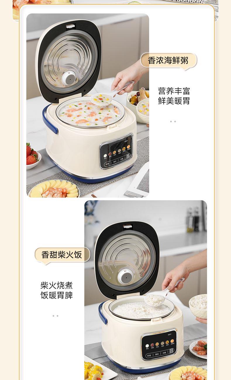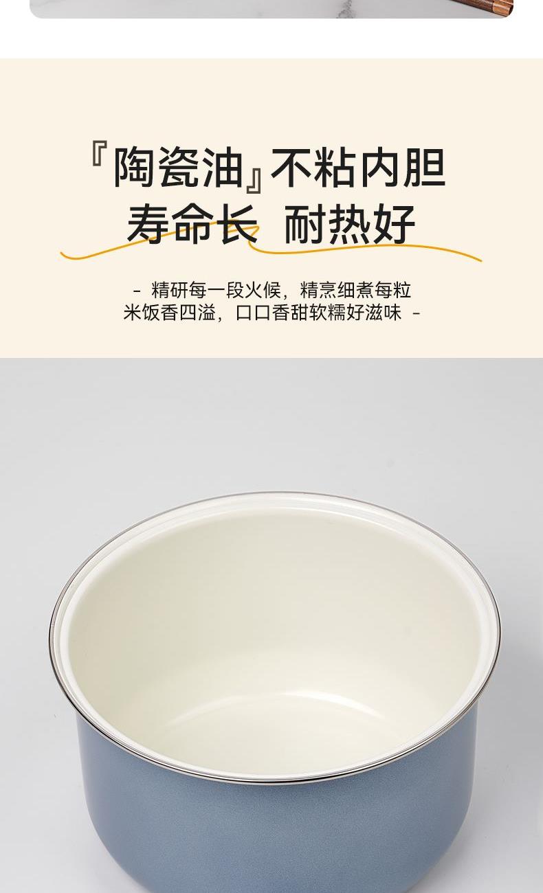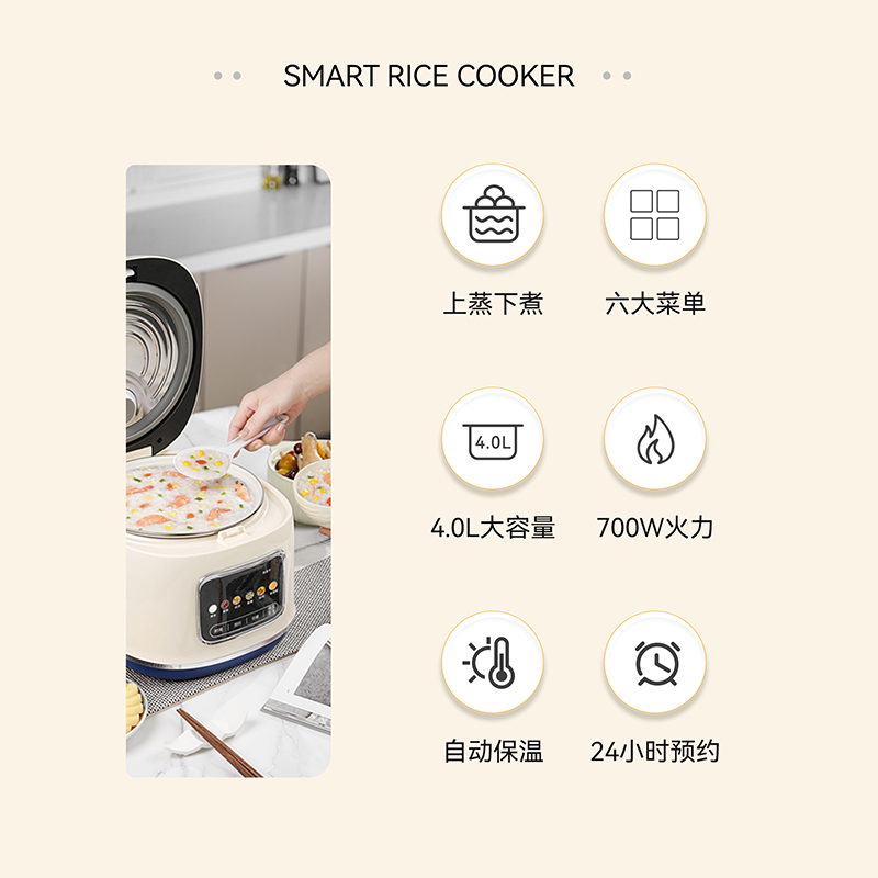 产品颜色:月光白 产品材质:PP+珐琅内胆 额定电压:220V~ 额定频率:50Hz 额定容量:4.0L 额定功率:700W 产品净重:2.95kg 产品毛重:3.50kg 产品尺寸:265*300*230mm 内箱尺寸:332*278*265mm 外箱尺寸:855*345*555mm 产品清单:主机*1/电源线*1/说明书*1 高颜值精致素雅造型,一体式设计小巧不占地 700W适宜火力,无需久等,轻松煮出好米饭 4.0L家庭容量,顿顿鲜煮不浪费 6大智能菜单,一键轻松启动蒸炖焖煮 加厚不沾珐琅内胆,导热均匀,耐磨易清洁 智能预约功能,到点准时享美味