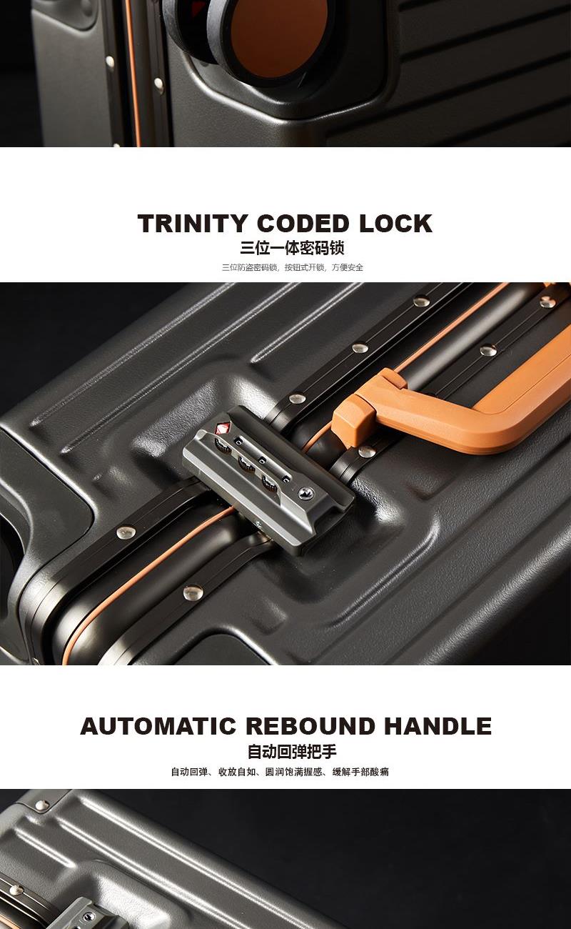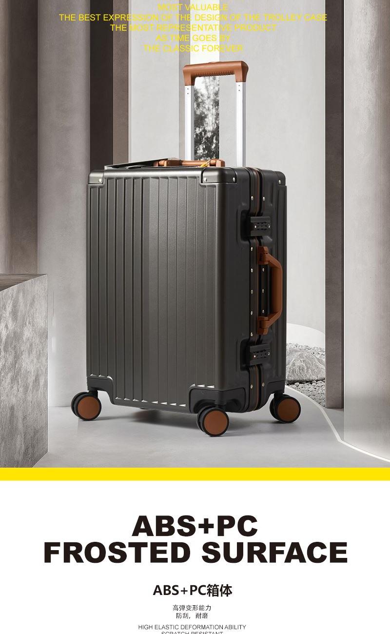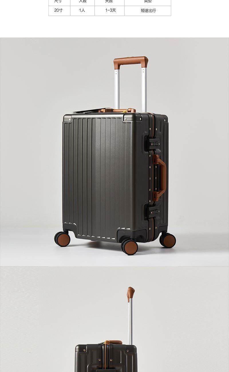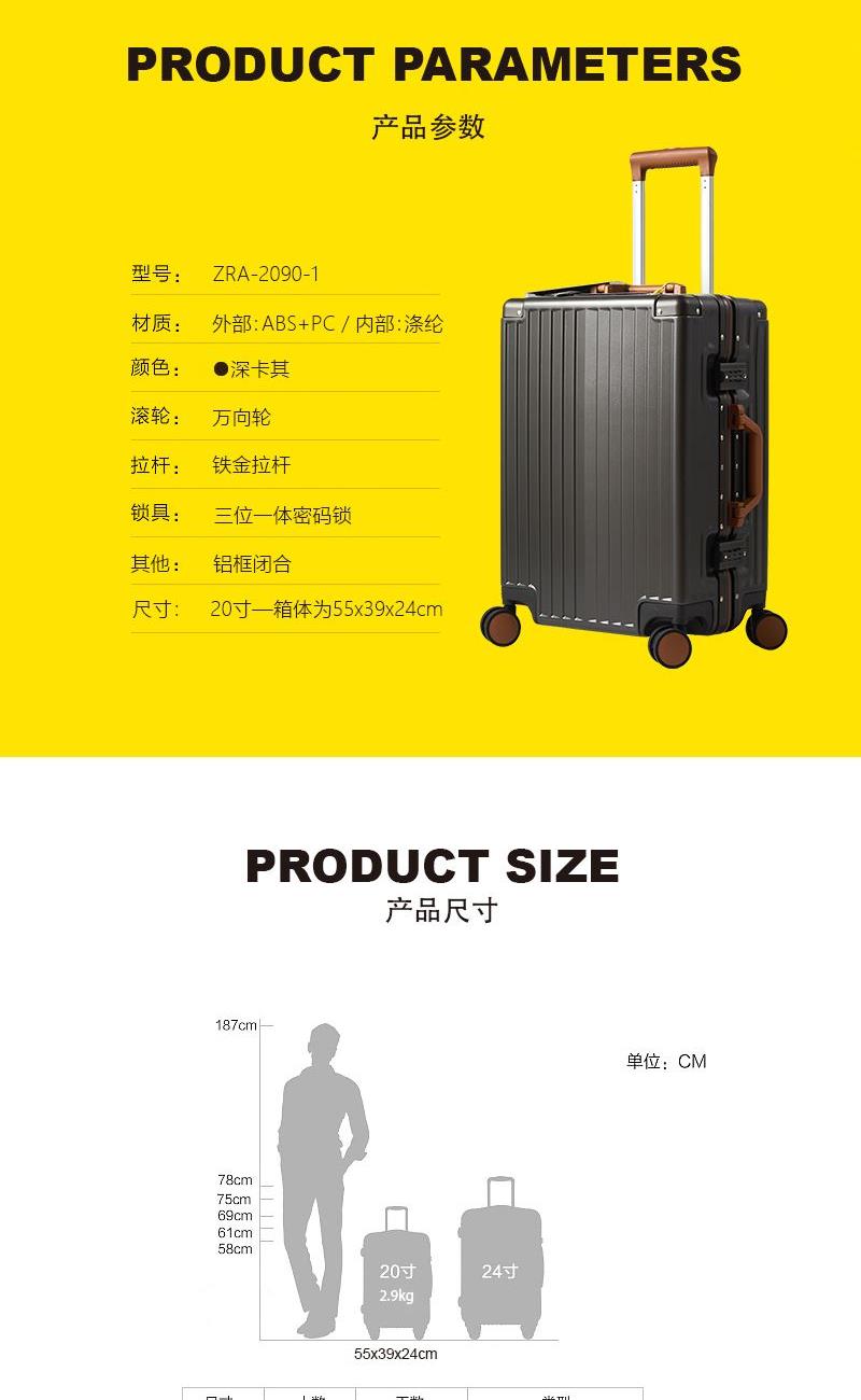 【型 号】ZRA-2090-1 【材 质】PC+ABS 【内 里】涤纶单分层 【结 构】铝合金边框、万向轮、加厚拉杆、三位密码锁、回弹硬把手 【尺 寸】20寸(箱体55x39x24cm) 【颜 色】深卡其 【包 装】内无纺布袋,外瓦楞箱
