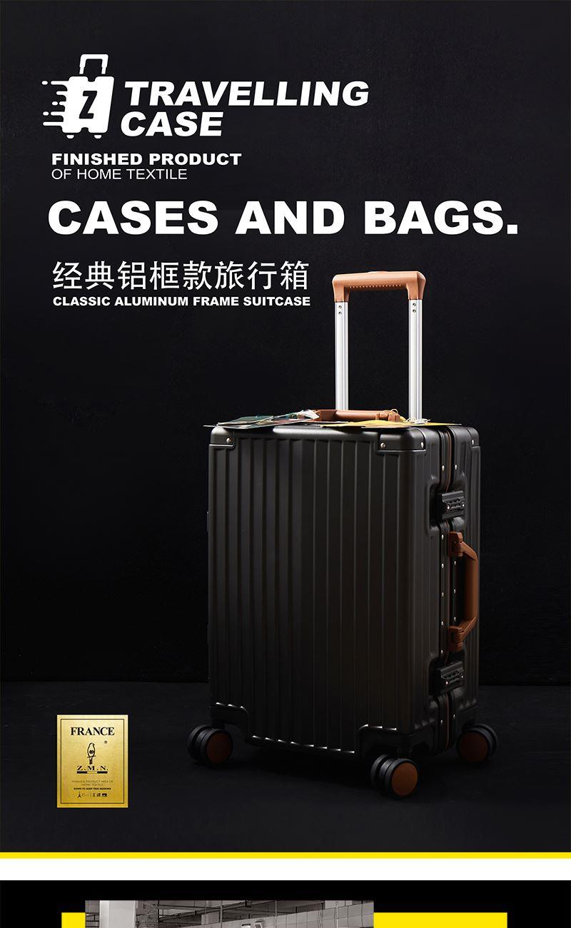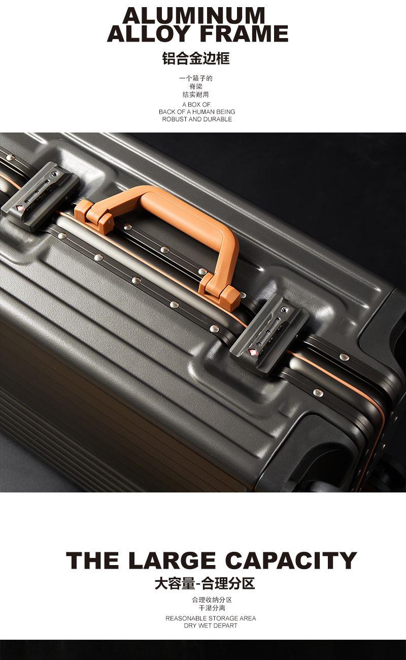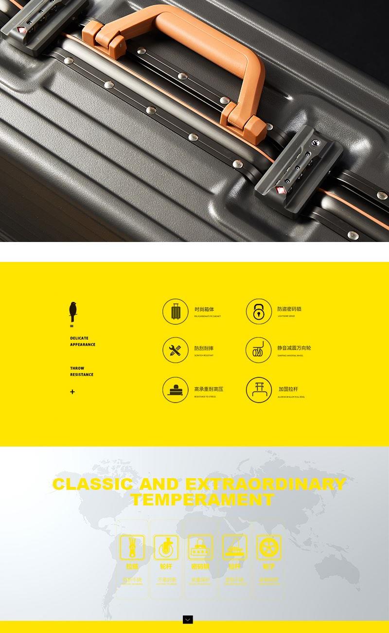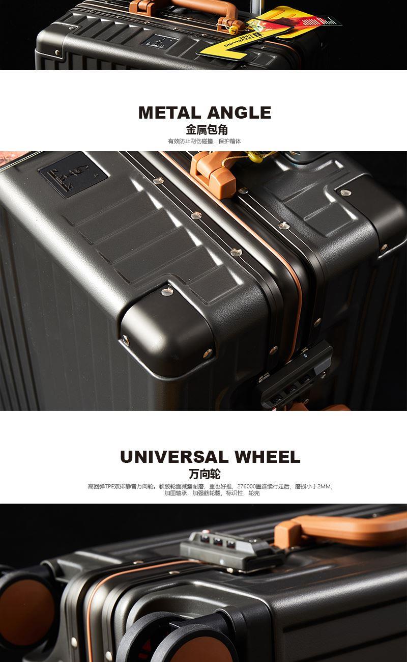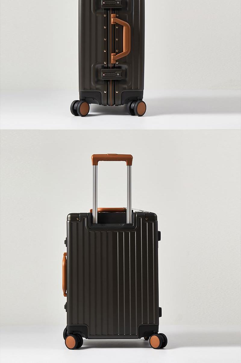 【型 号】ZRA-2090-1 【材 质】PC+ABS 【内 里】涤纶单分层 【结 构】铝合金边框、万向轮、加厚拉杆、三位密码锁、回弹硬把手 【尺 寸】20寸(箱体55x39x24cm) 【颜 色】深卡其 【包 装】内无纺布袋,外瓦楞箱