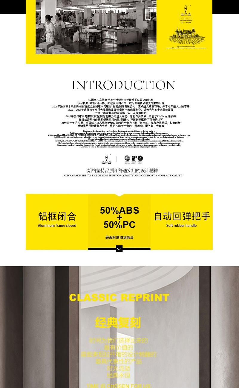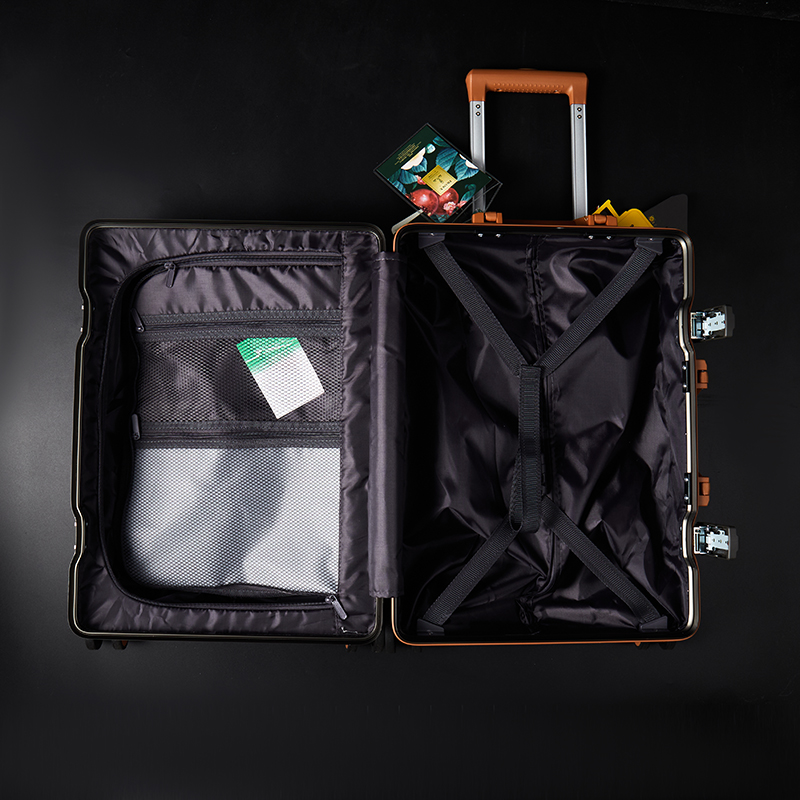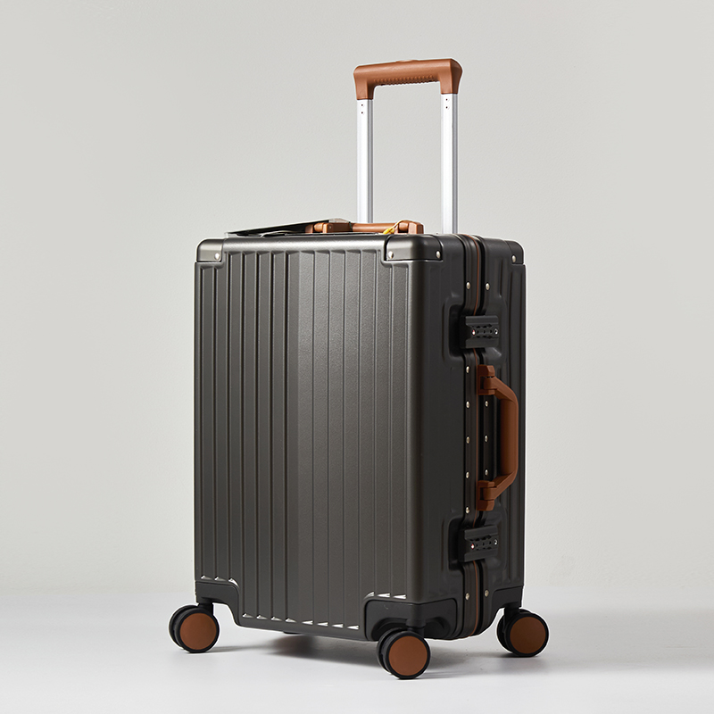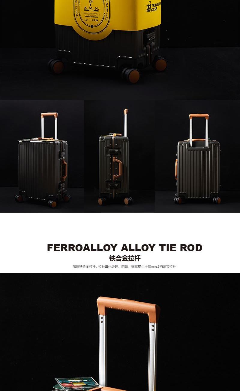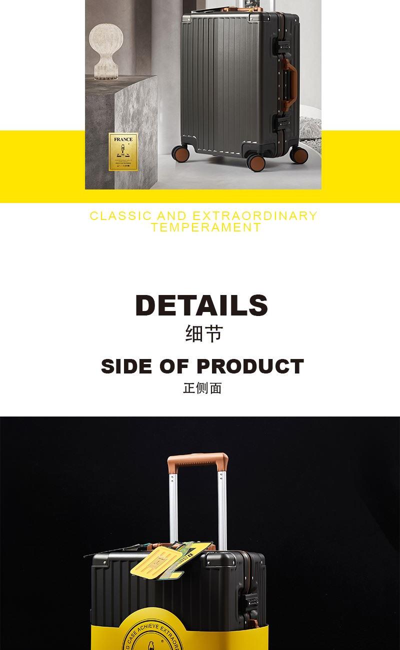 【型 号】ZRA-2090-1 【材 质】PC+ABS 【内 里】涤纶单分层 【结 构】铝合金边框、万向轮、加厚拉杆、三位密码锁、回弹硬把手 【尺 寸】20寸(箱体55x39x24cm) 【颜 色】深卡其 【包 装】内无纺布袋,外瓦楞箱