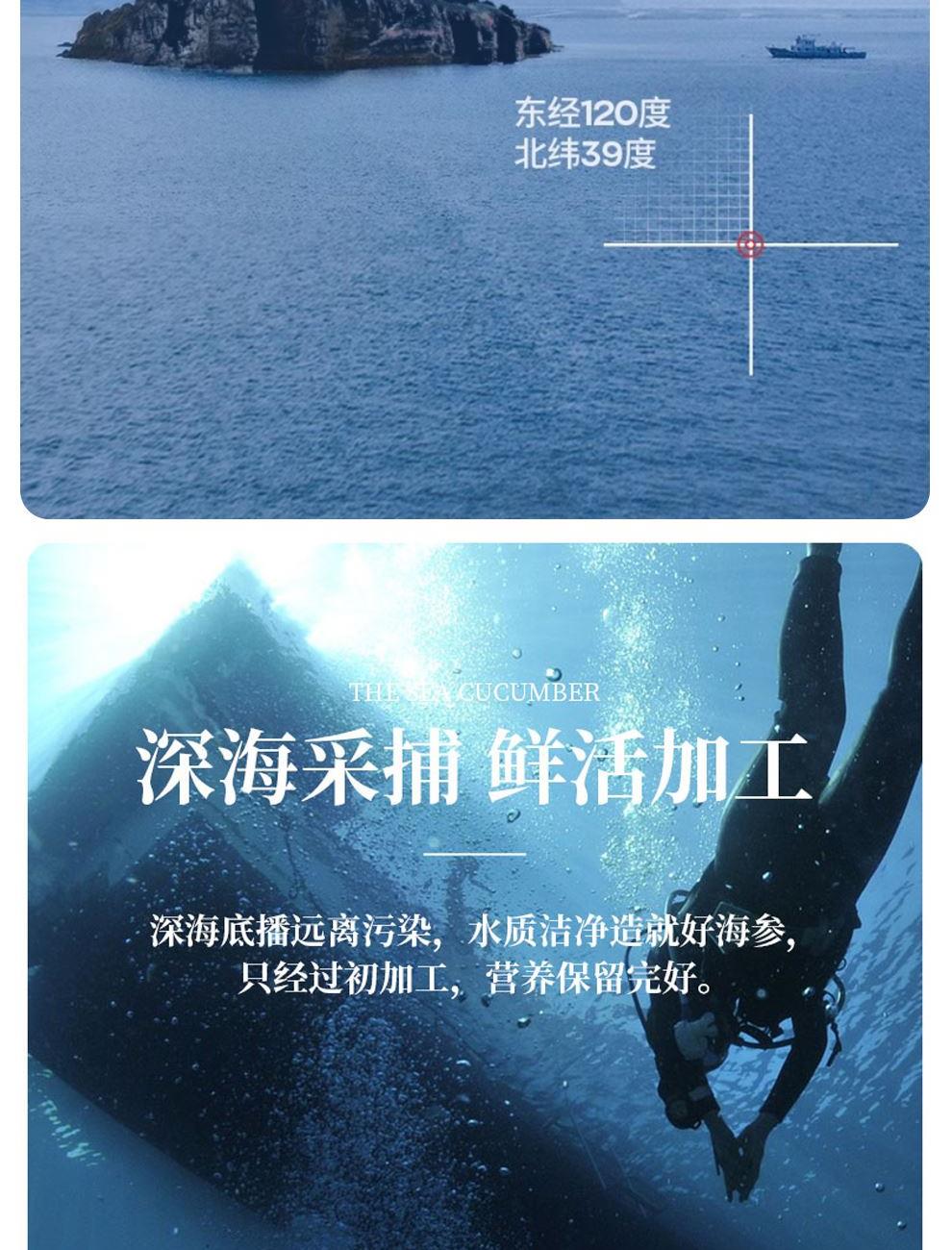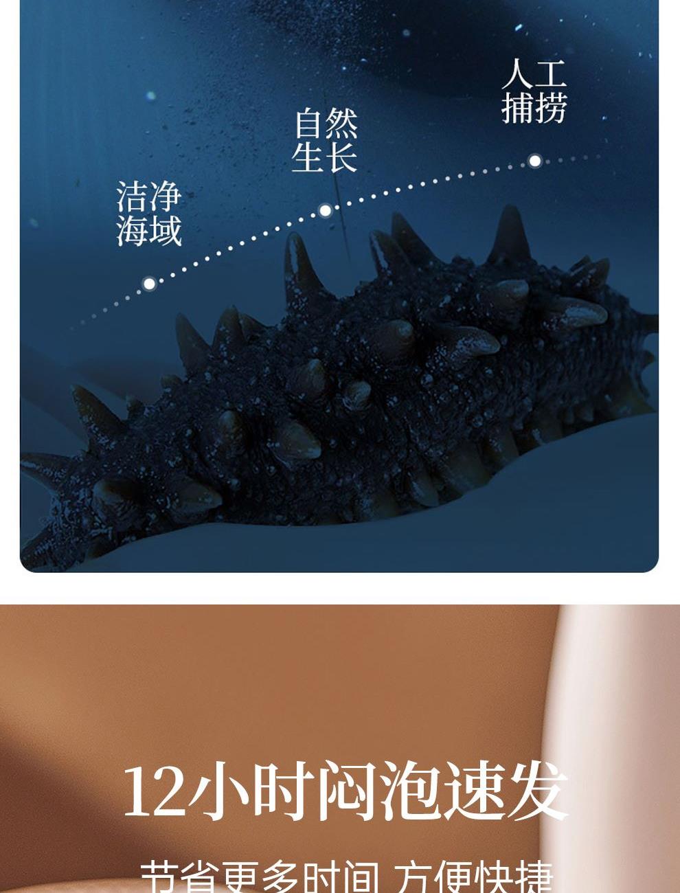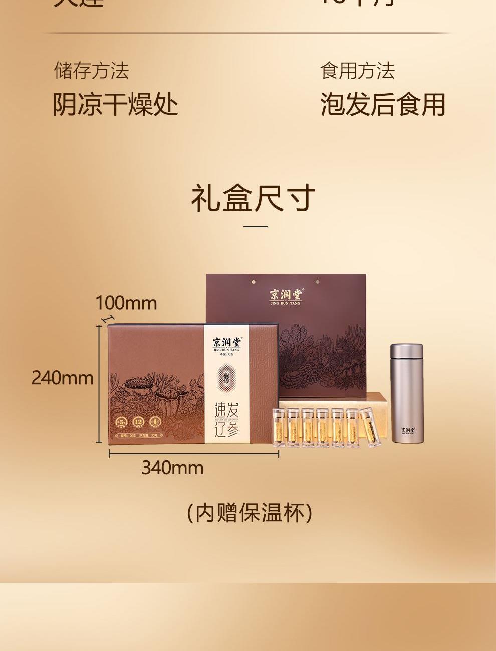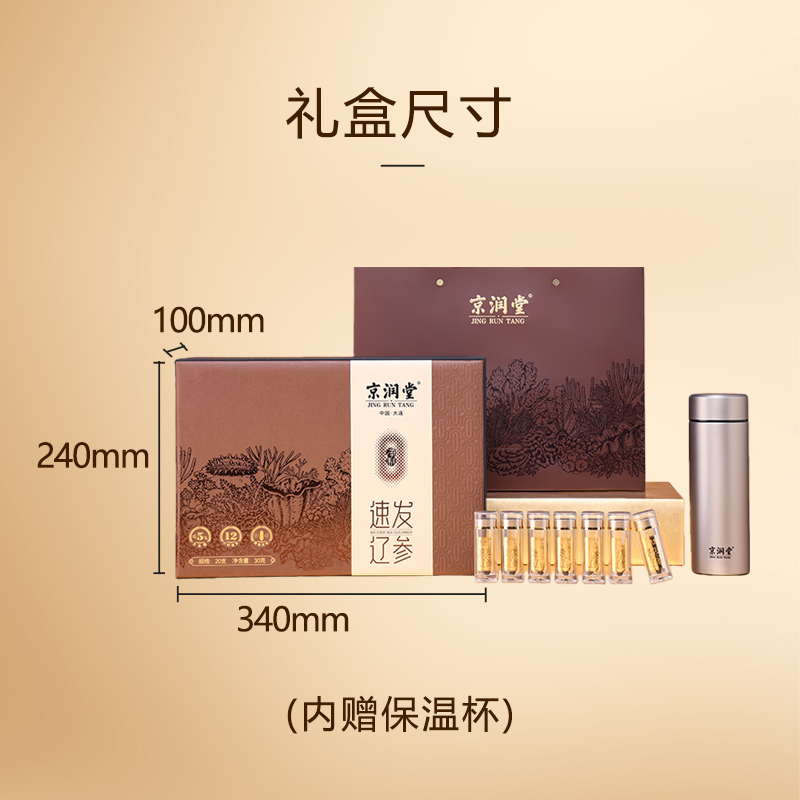规格:20支/盒、赠送:保温杯 卖点: 1、北纬39°,大连海参黄金生长海域,底播散养。 2、快速便捷,12小时泡发,轻松即食。 3、含盐量≤5%,高血脂人群的更佳选择。 4、速发工艺,营养成分完整保留,海参品质更加稳定。 5、泡发率20倍,口感Q弹有嚼劲。
